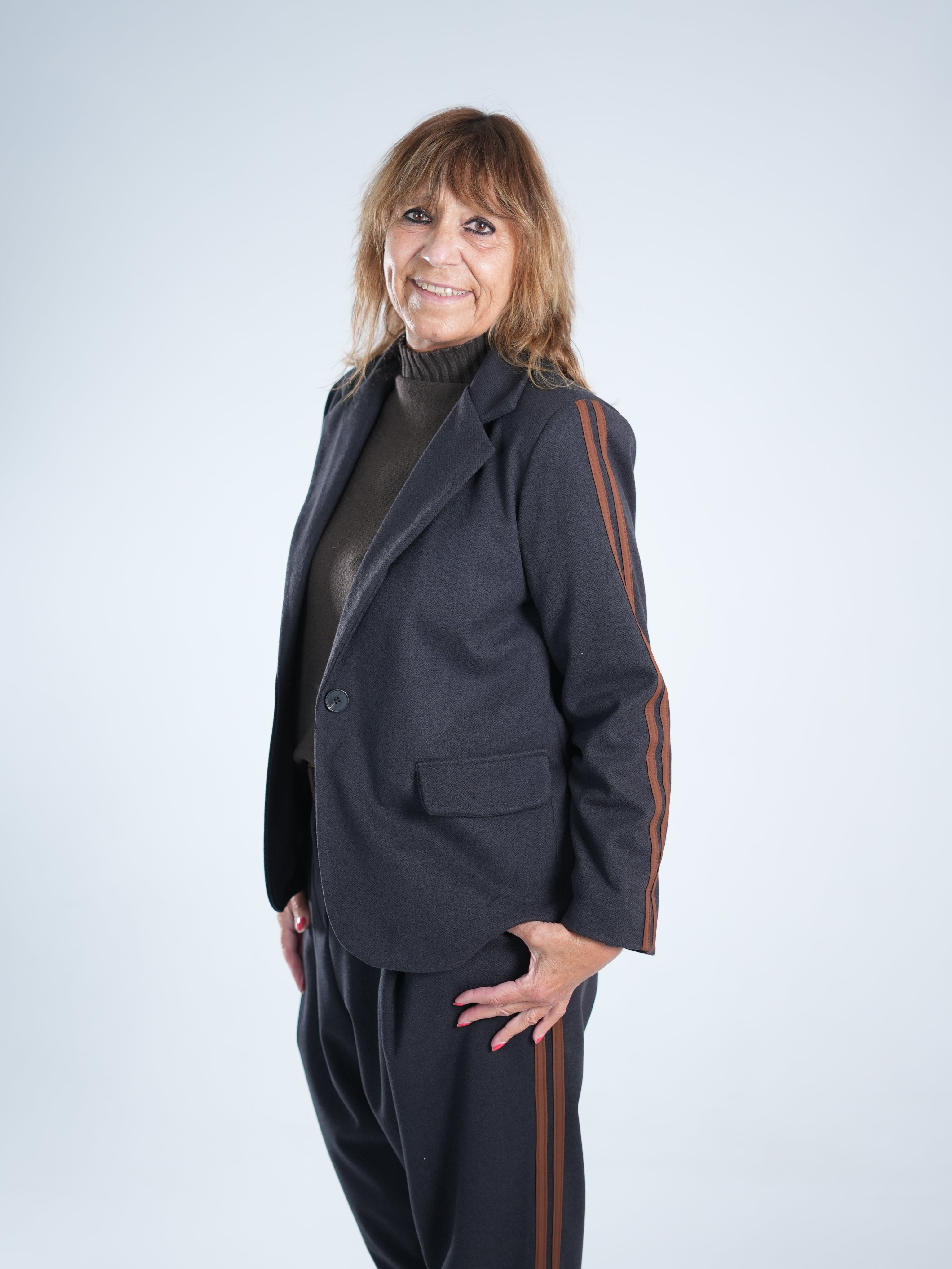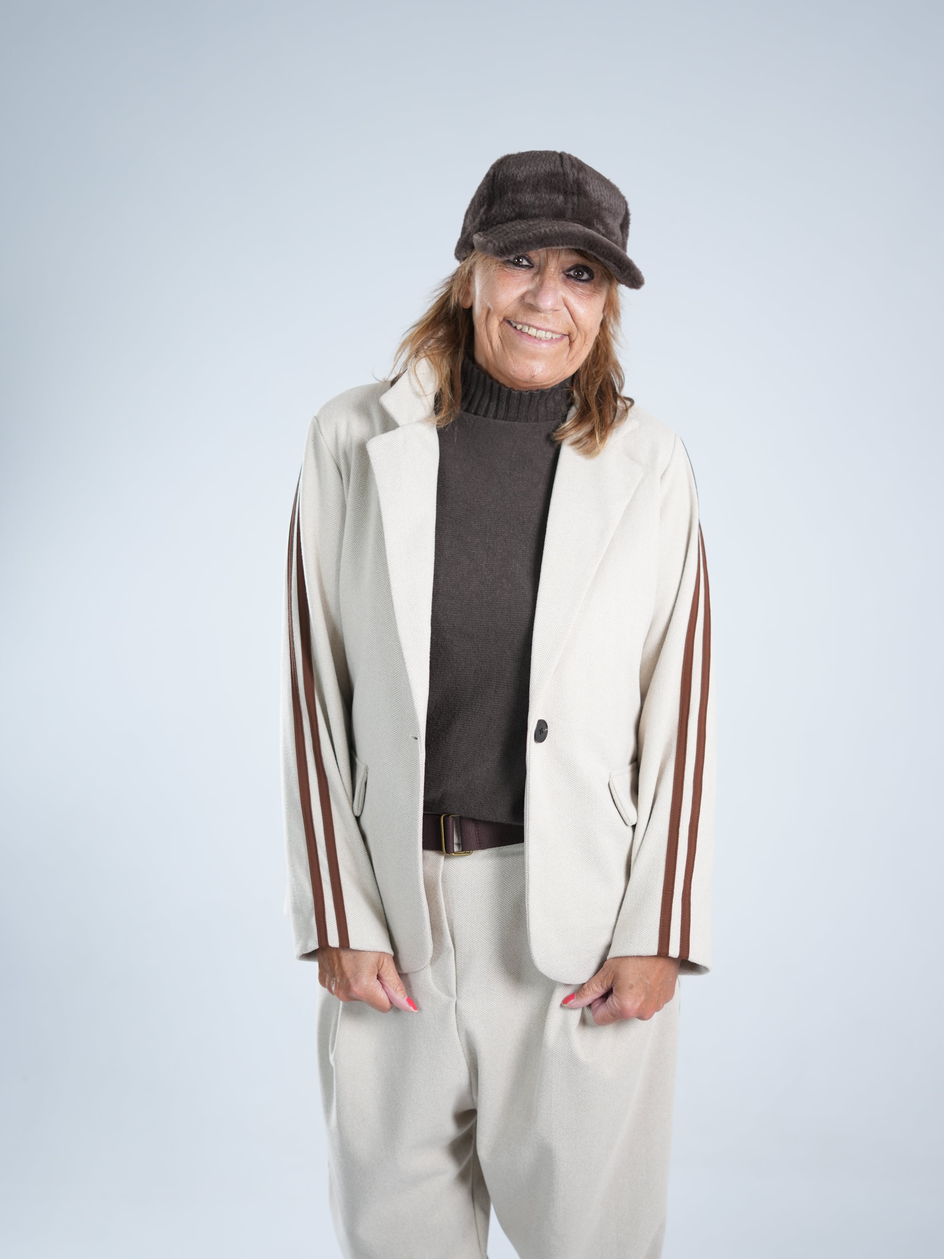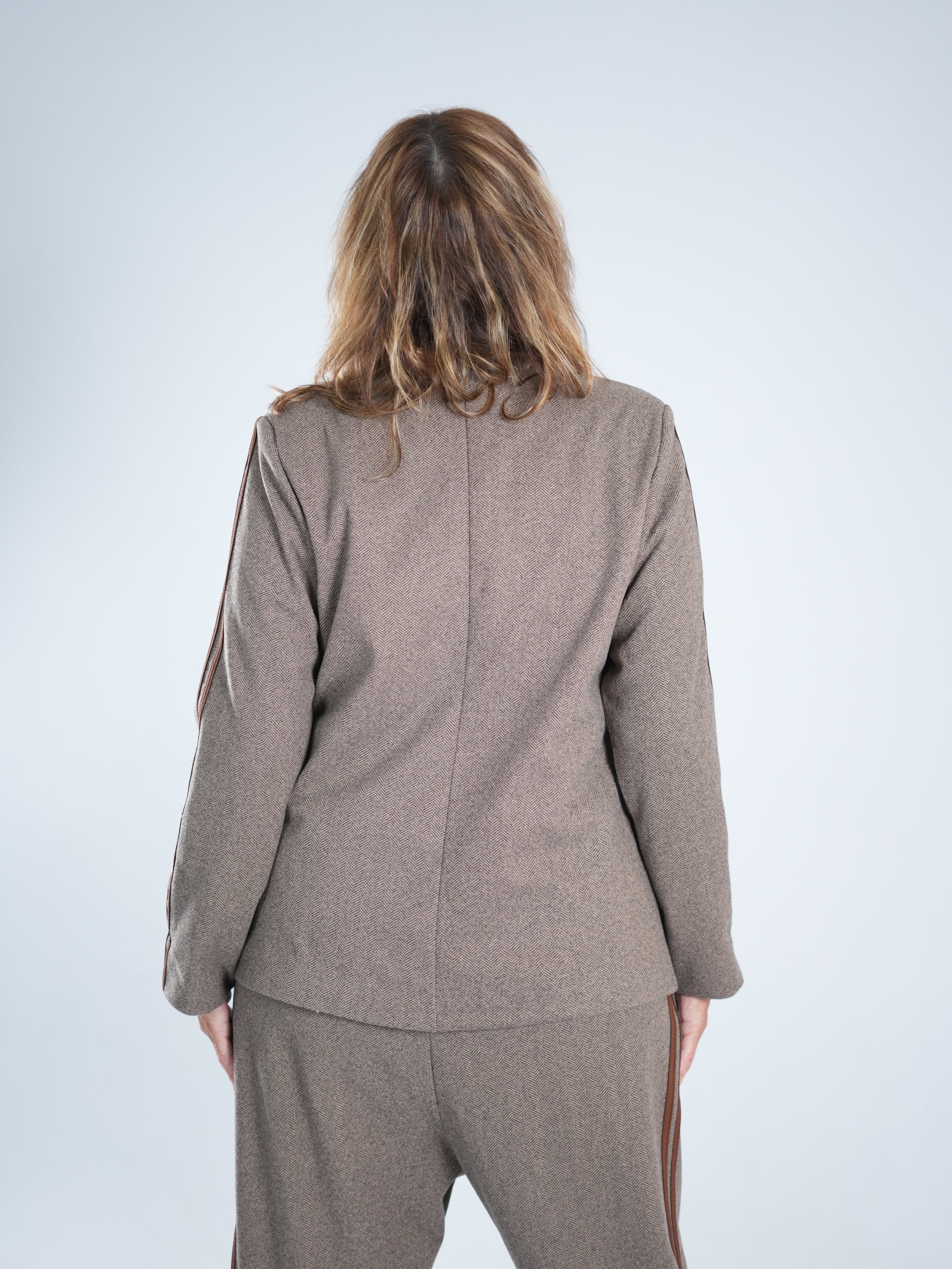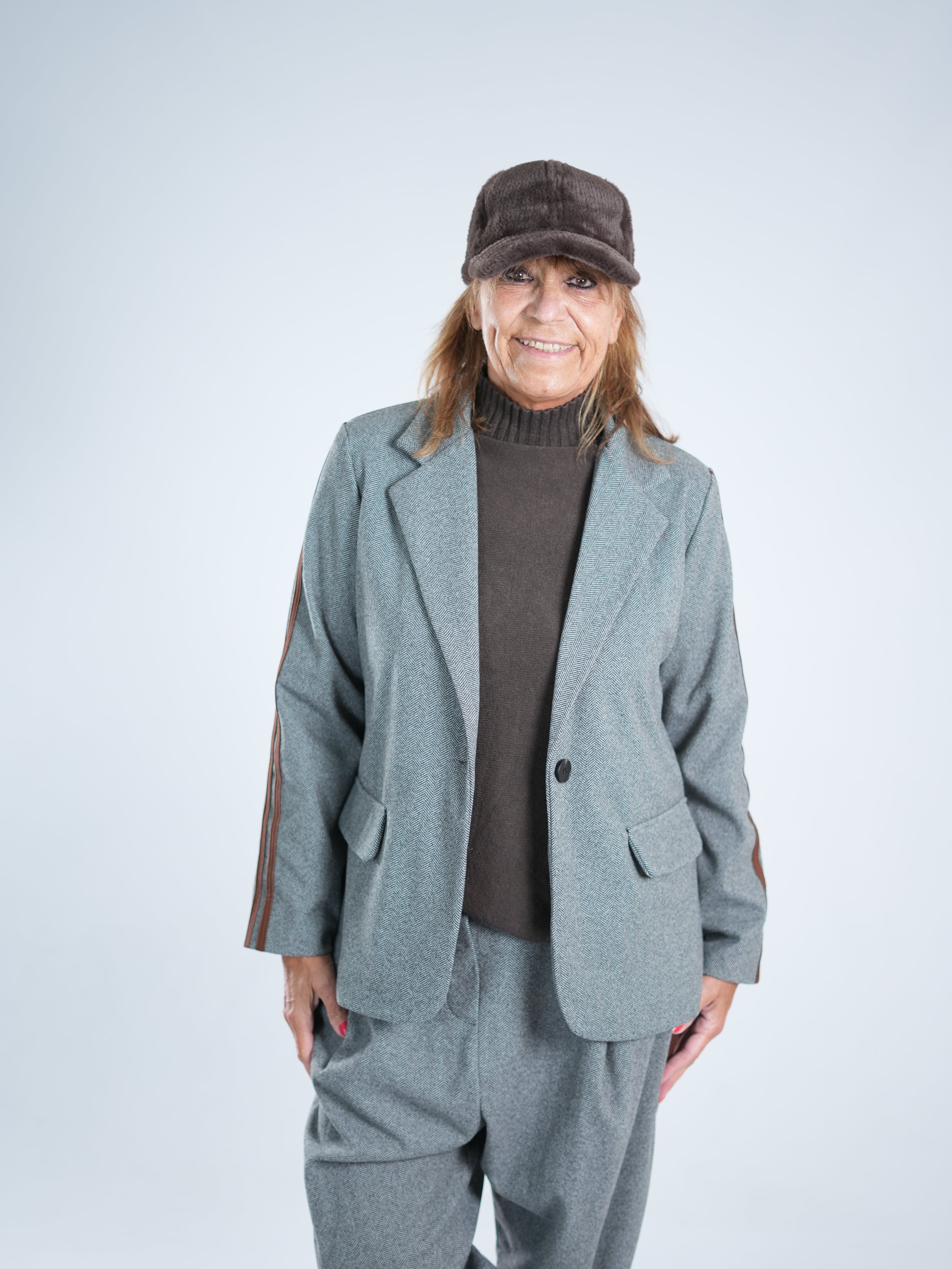 Dieser Blazer im klassischen Fischgrätmuster bekommt durch den seitlichen Streifen in Schoko einen modernen Twist. Er ist in Einheitsgröße (ca. 38–42) tragbar, lässt sich mit einem Knopf schließen und hat Taschenklappen als Zierde. Ein unkompliziertes Teil, das schick aussieht und trotzdem entspannt wirkt – perfekt auch in Kombi mit unserer passenden Bundfaltenbaggy ~stripe~!