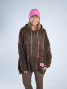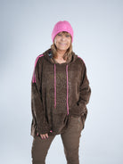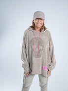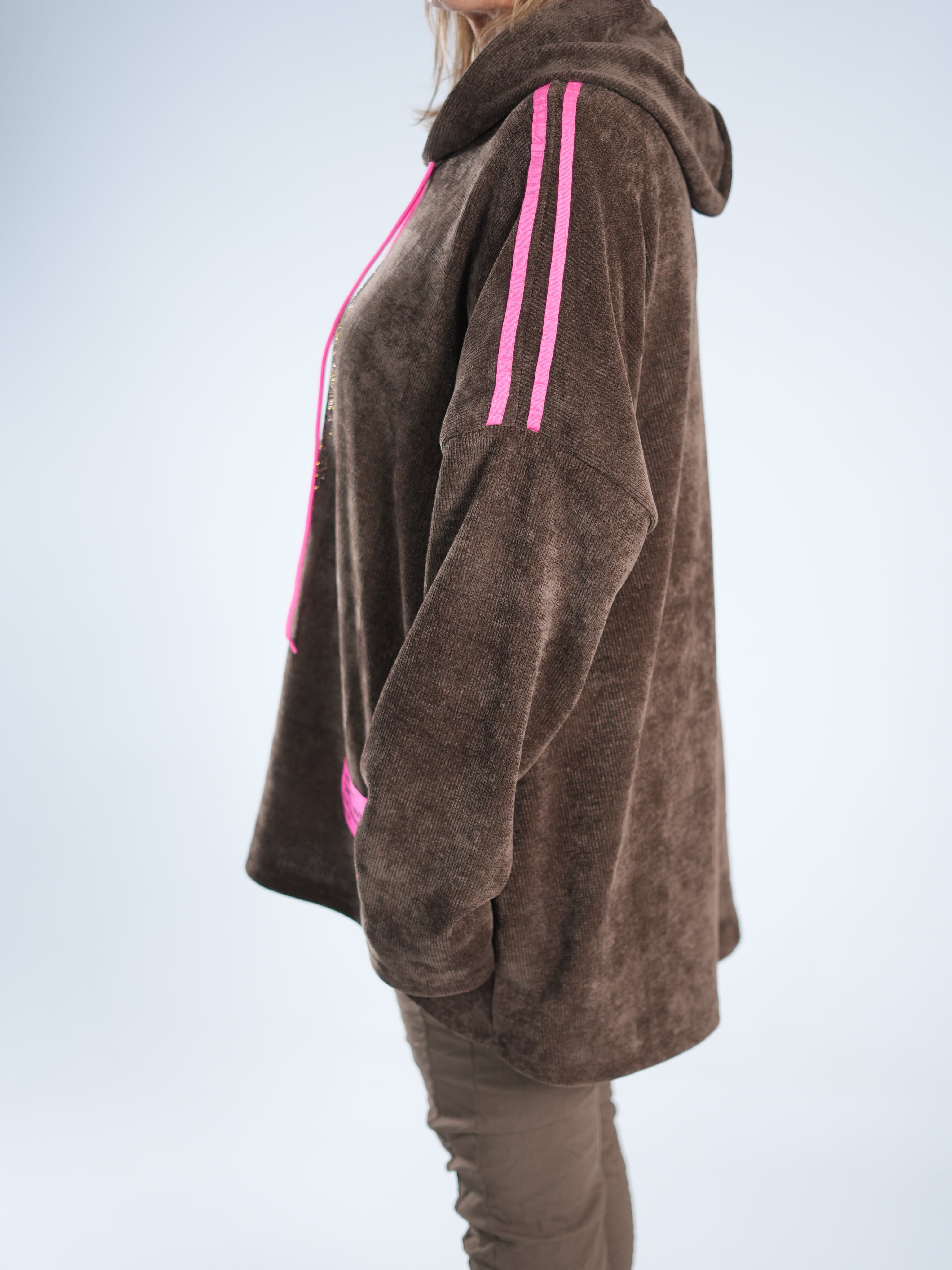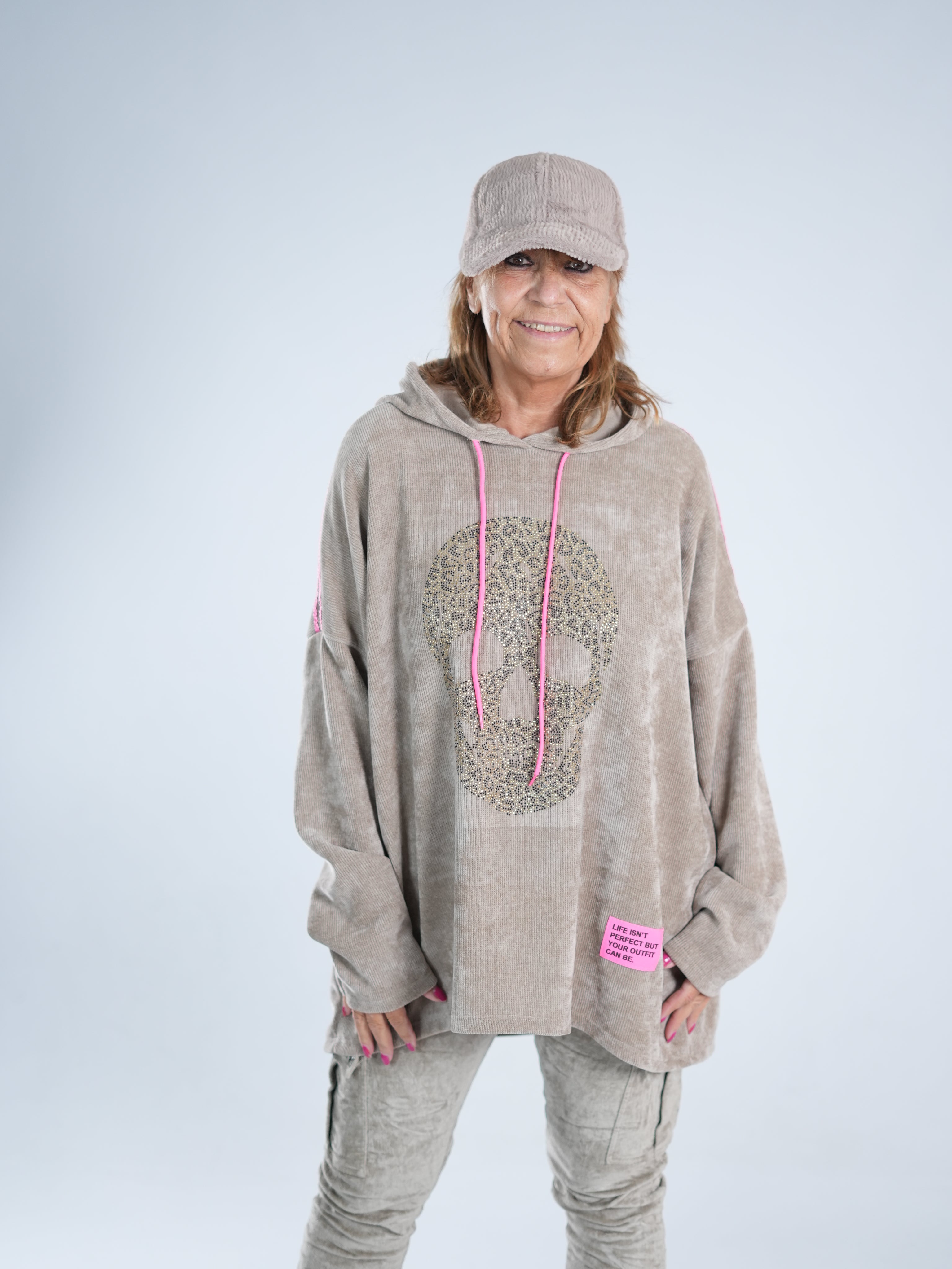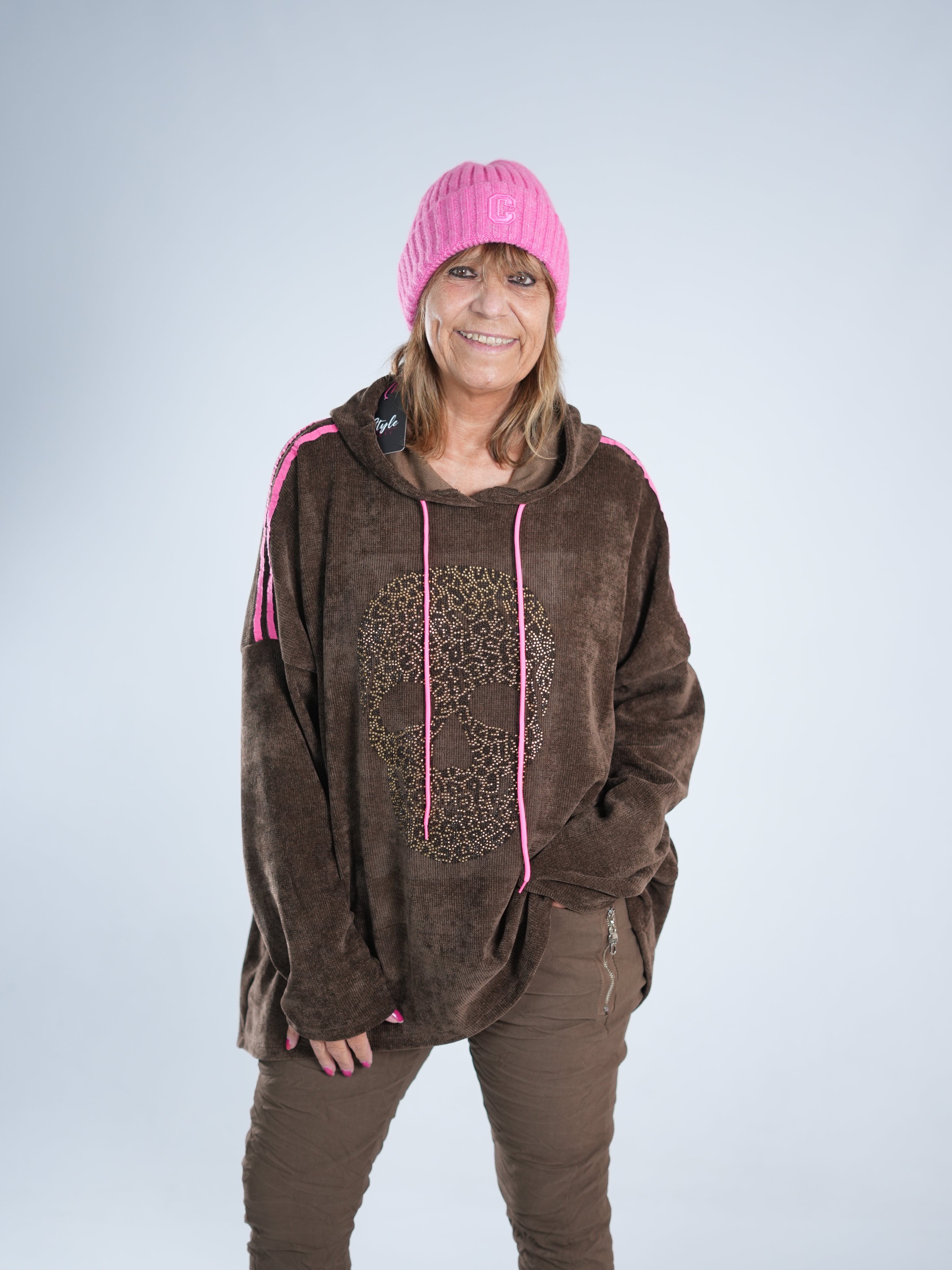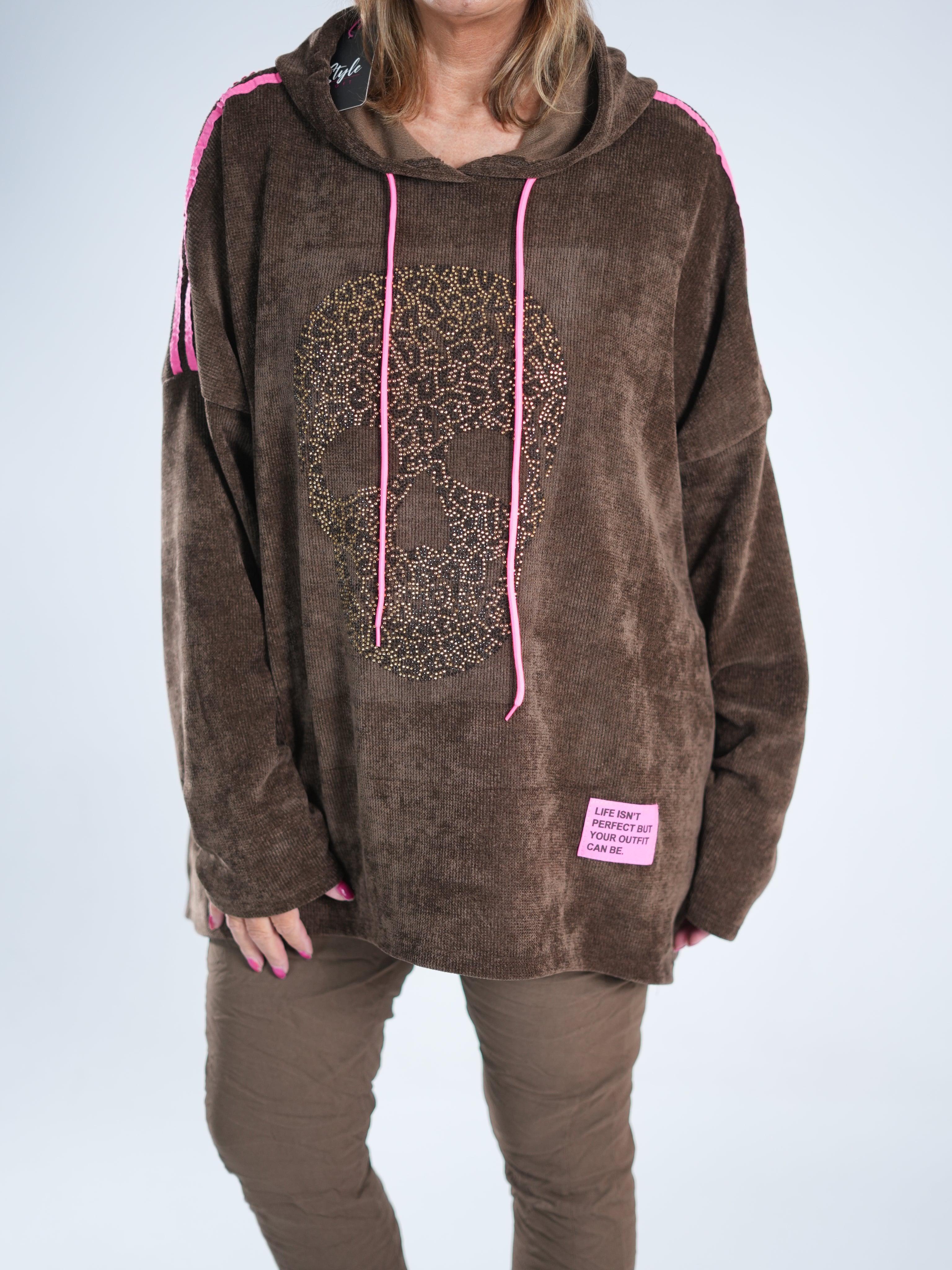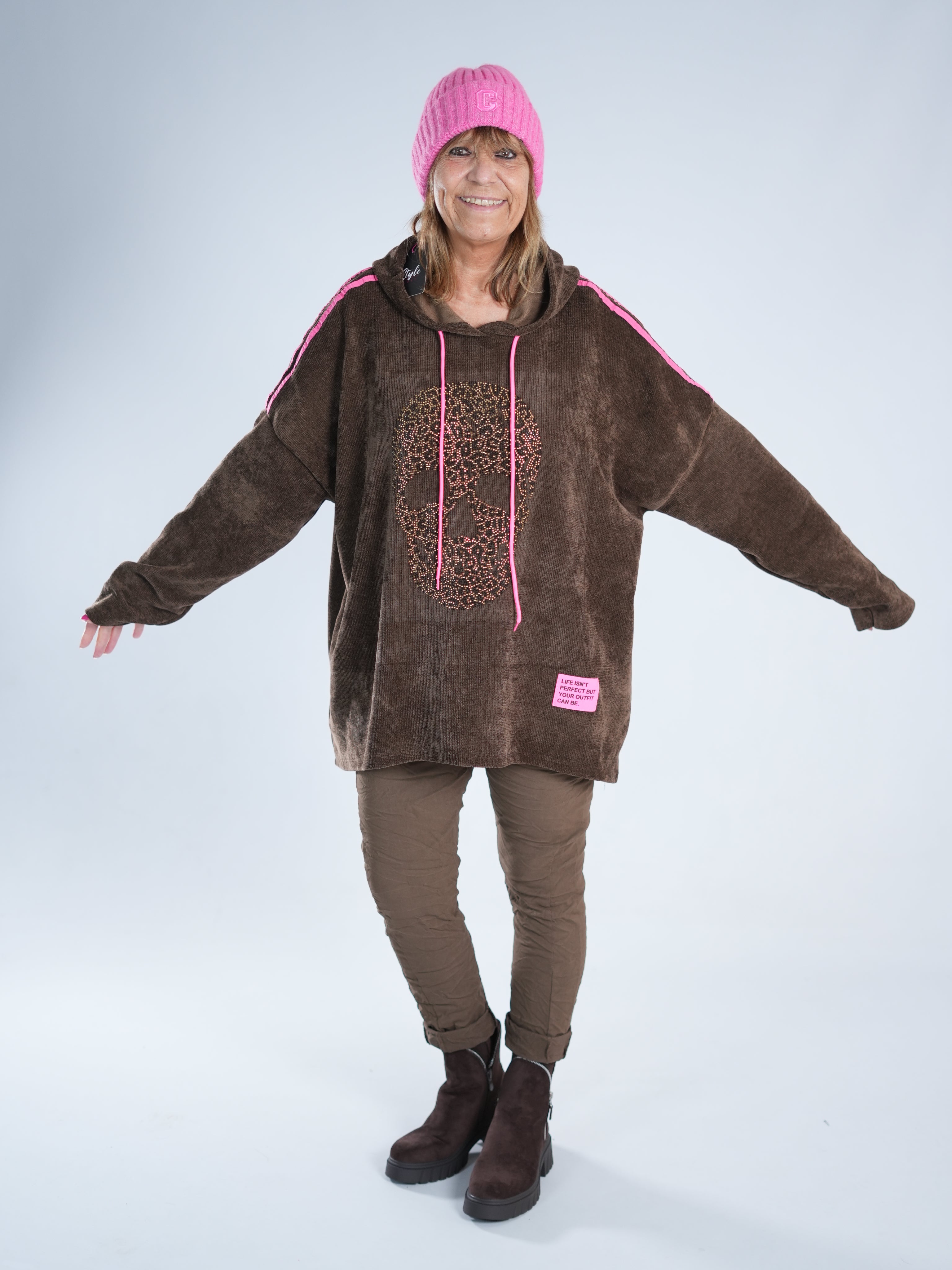 Dieser tolle Hoody in Cord-Optik vereint Coolness mit Glam! Auf dem Vorderteil funkelt ein Skull aus goldenen Strasssteinen, dazu kommt ein neonpinker Patch, der sofort ins Auge fällt. Die Farbe zieht sich als Galonstreifen über die Ärmel und zeigt sich auch an den Ziehbändern der Kapuze wieder – ein durchdachtes, stylisches Detail! ✨ Der Hoody ist etwas weiter geschnitten und damit perfekt für alle, die es bequem, aber besonders mögen.