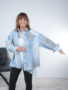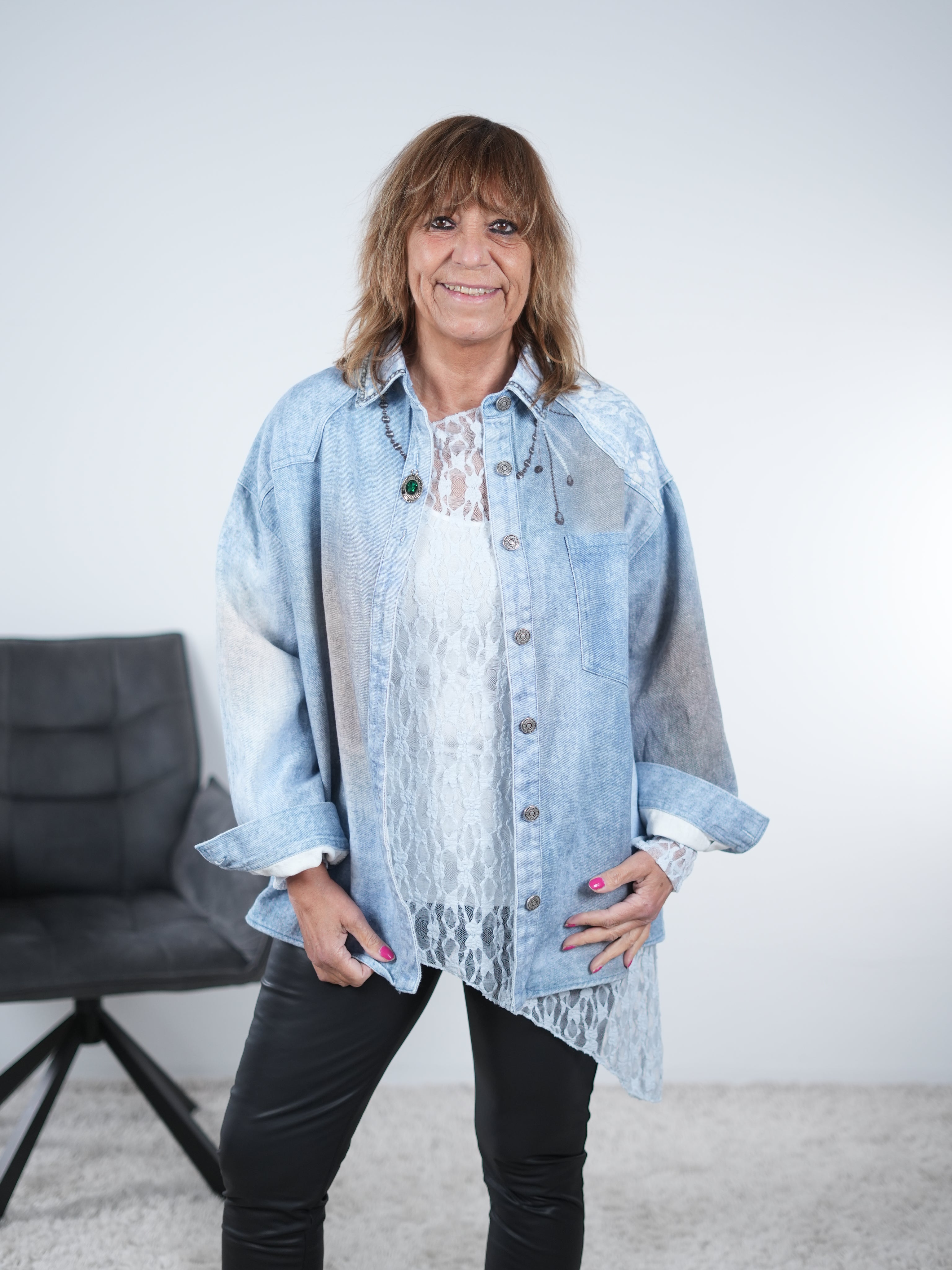 Marion ist 172cm groß und trägt Größe 40/42. Sie ist auf allen Produktbildern zu sehen und präsentiert die wunderschönen onesize Outfits.