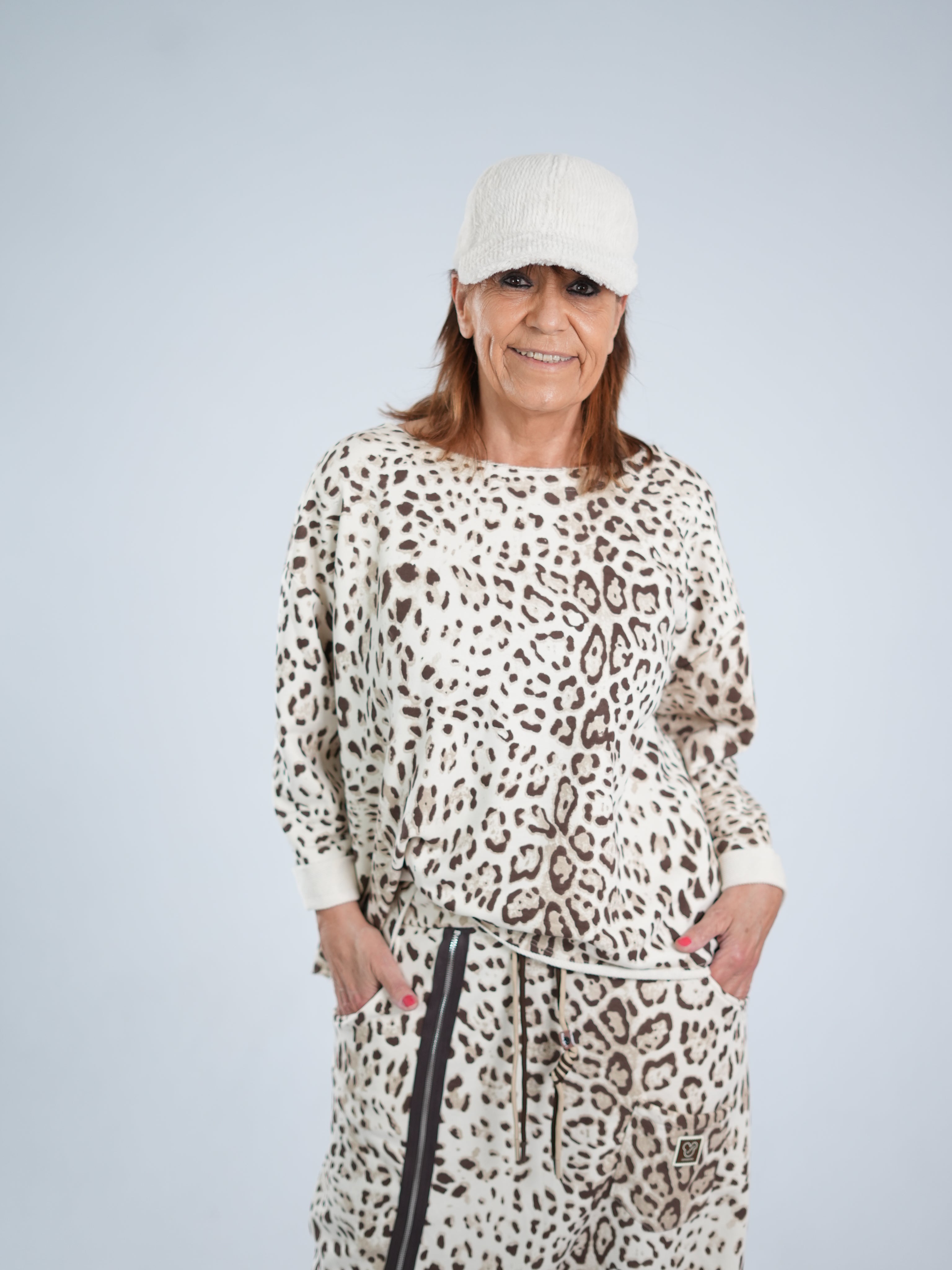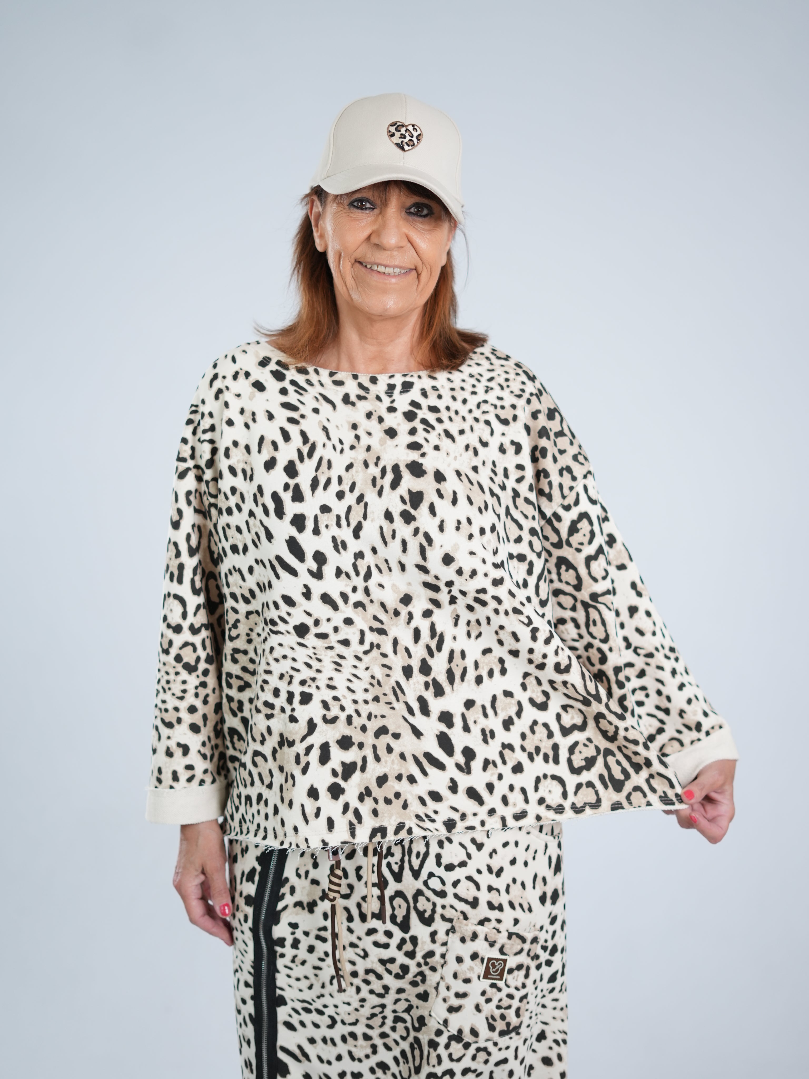 Marion ist 172cm groß und trägt Größe 40/42. Sie ist auf allen Produktbildern zu sehen und präsentiert die wunderschönen onesize Outfits.
