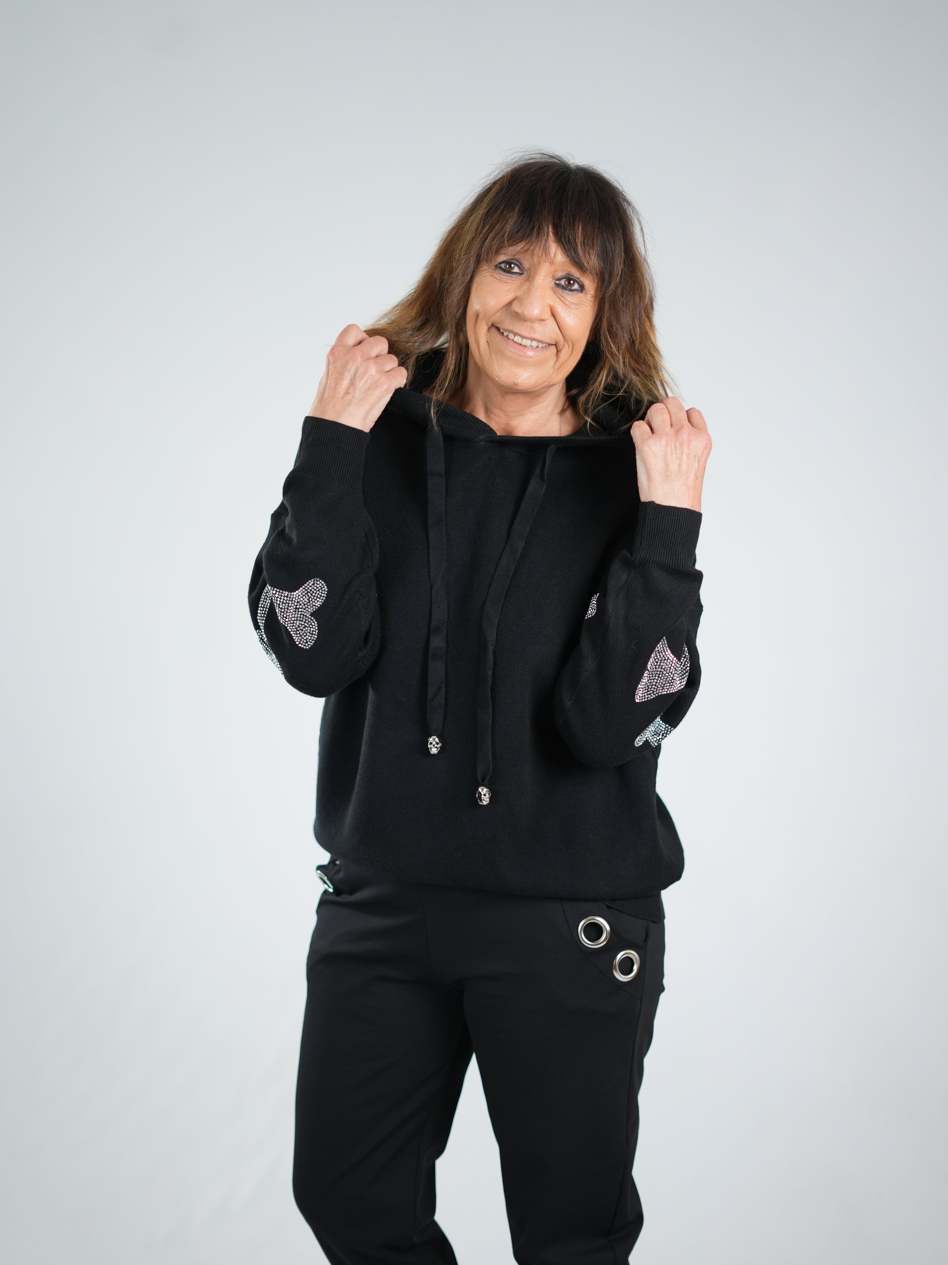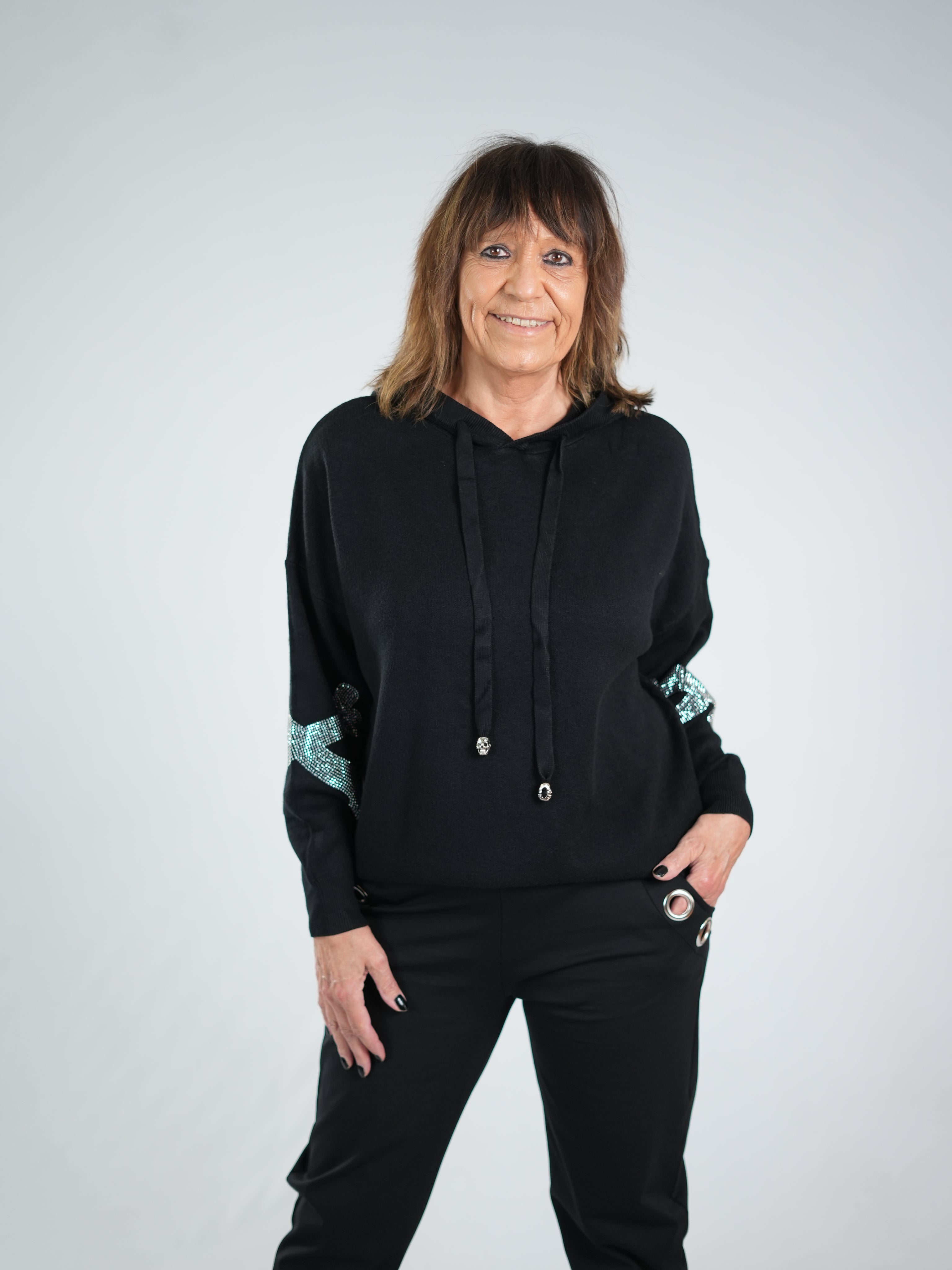 Marion ist 172cm groß und trägt Größe 40/42. Sie ist auf allen Produktbildern zu sehen und präsentiert die wunderschönen onesize Outfits.