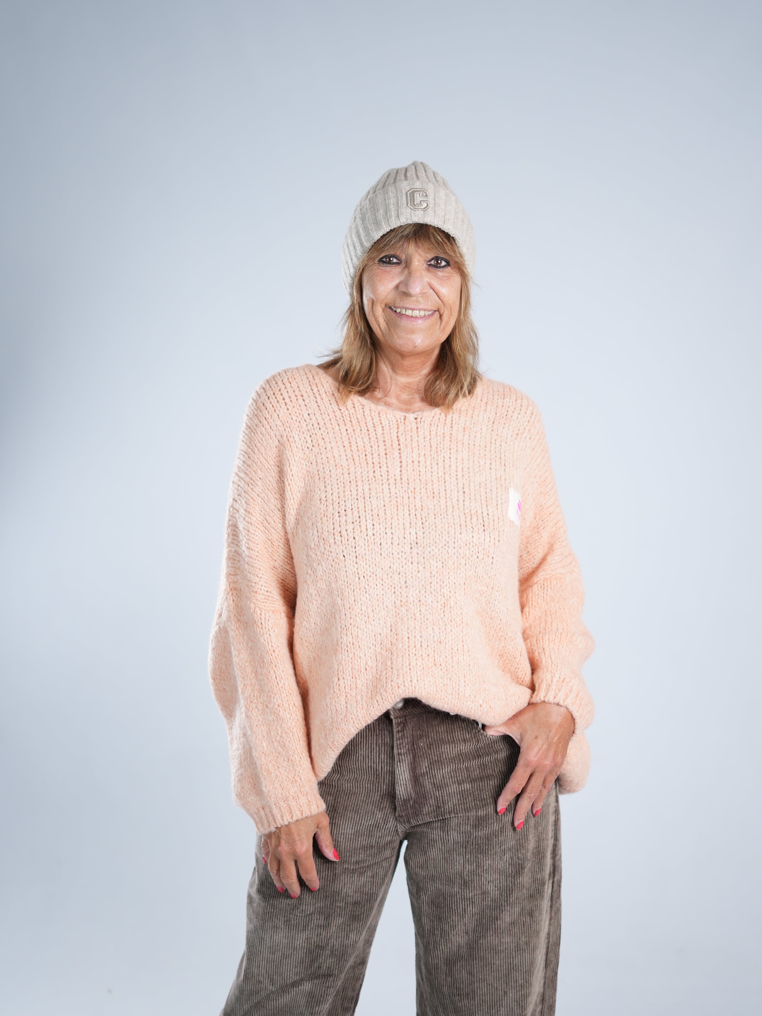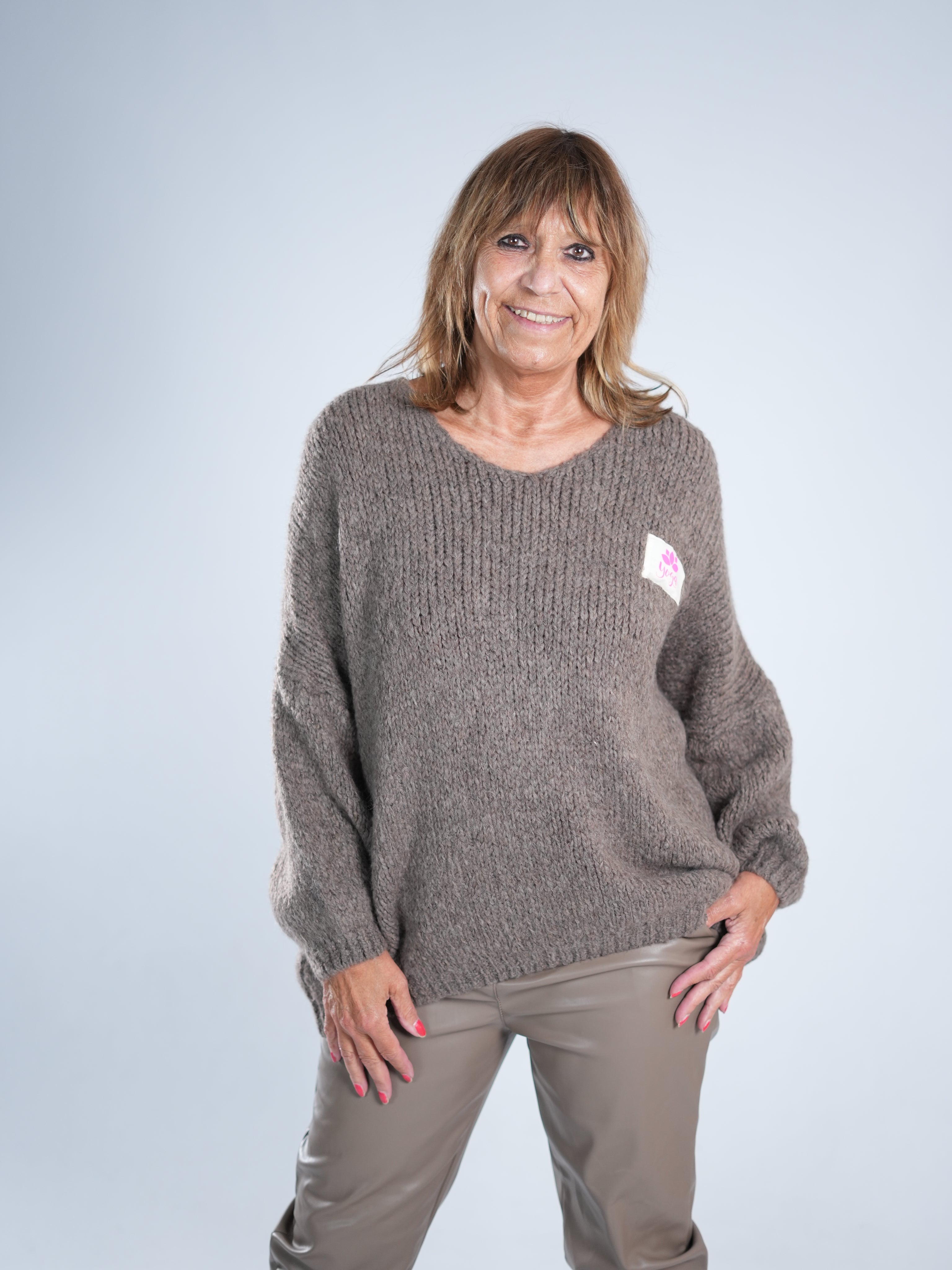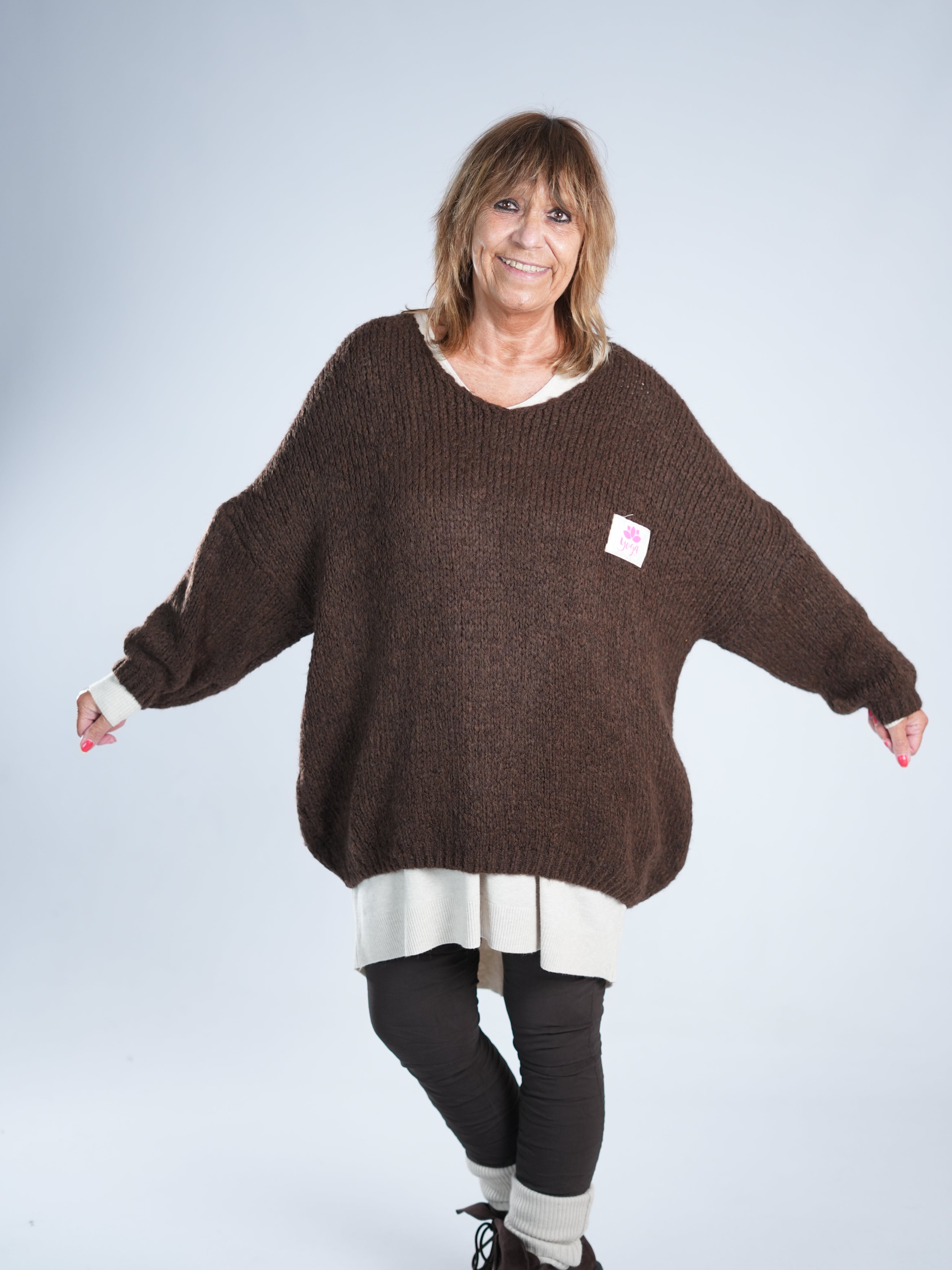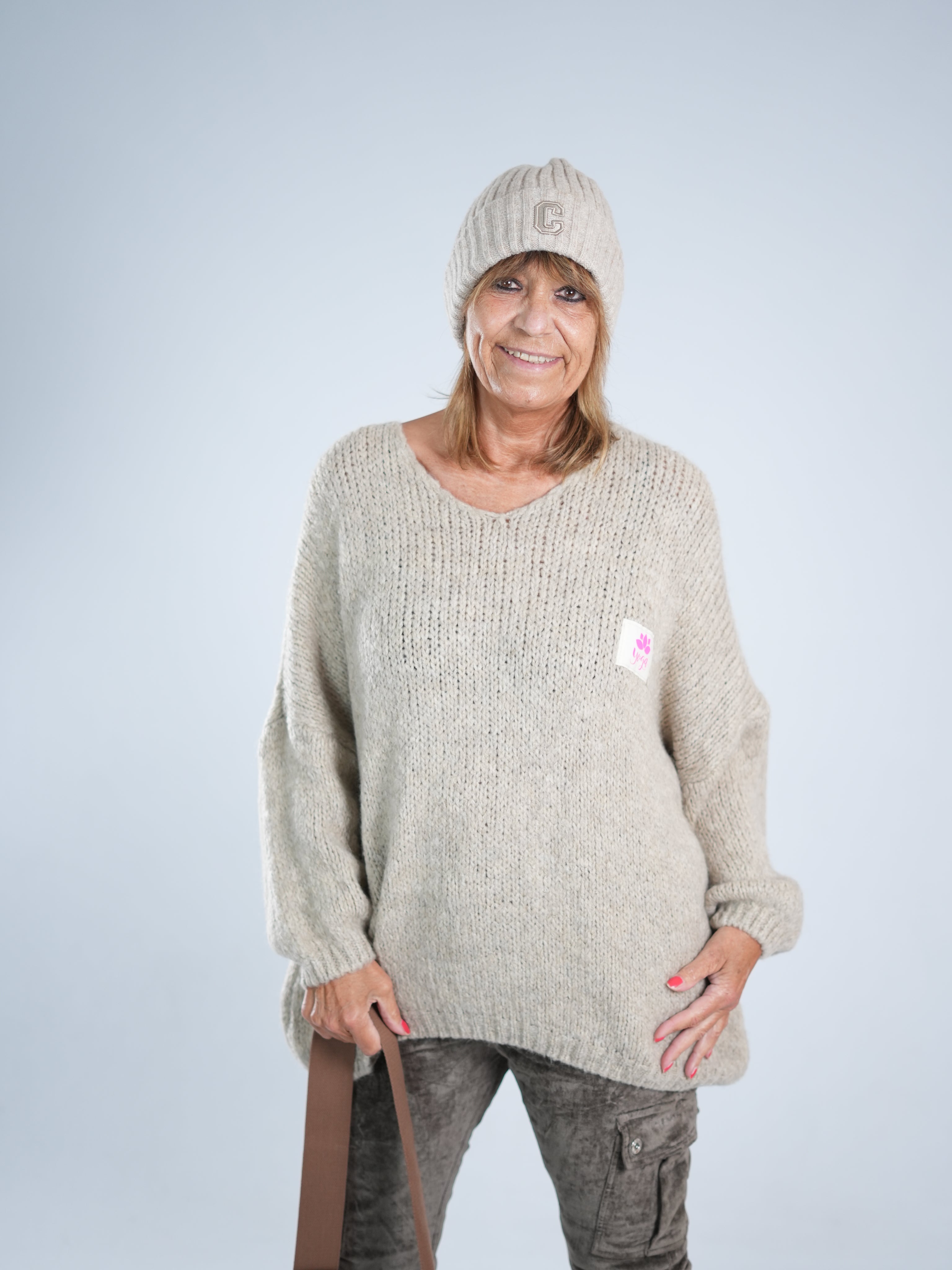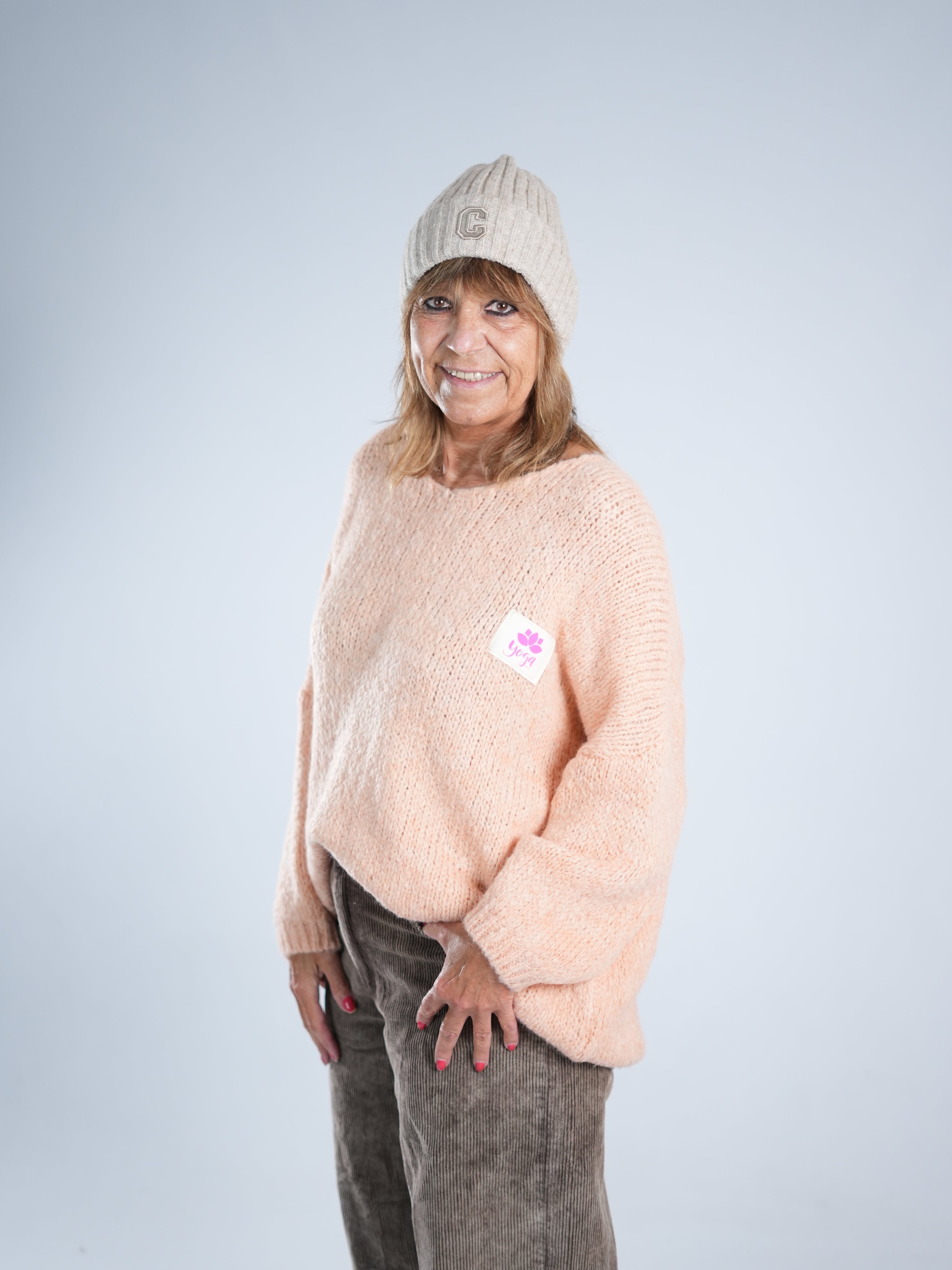 Marion ist 172cm groß und trägt Größe 40/42. Sie ist auf allen Produktbildern zu sehen und präsentiert die wunderschönen onesize Outfits.