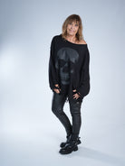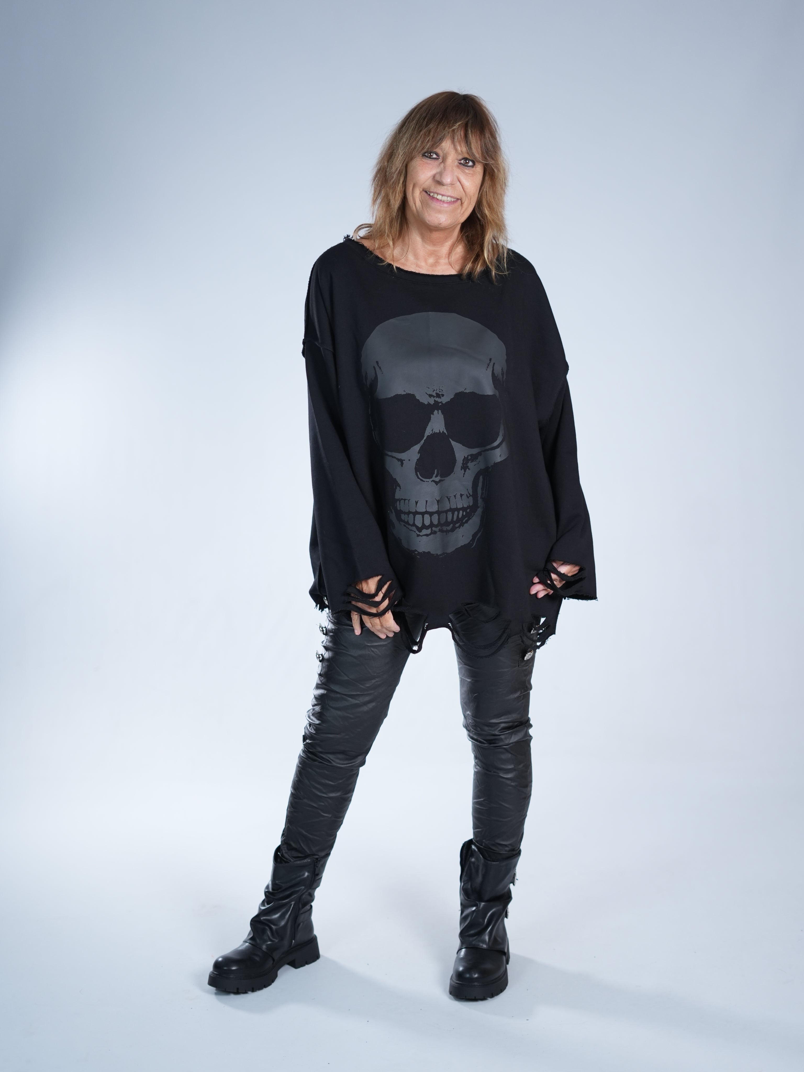 Marion ist 172cm groß und trägt Größe 40/42. Sie ist auf allen Produktbildern zu sehen und präsentiert die wunderschönen onesize Outfits.