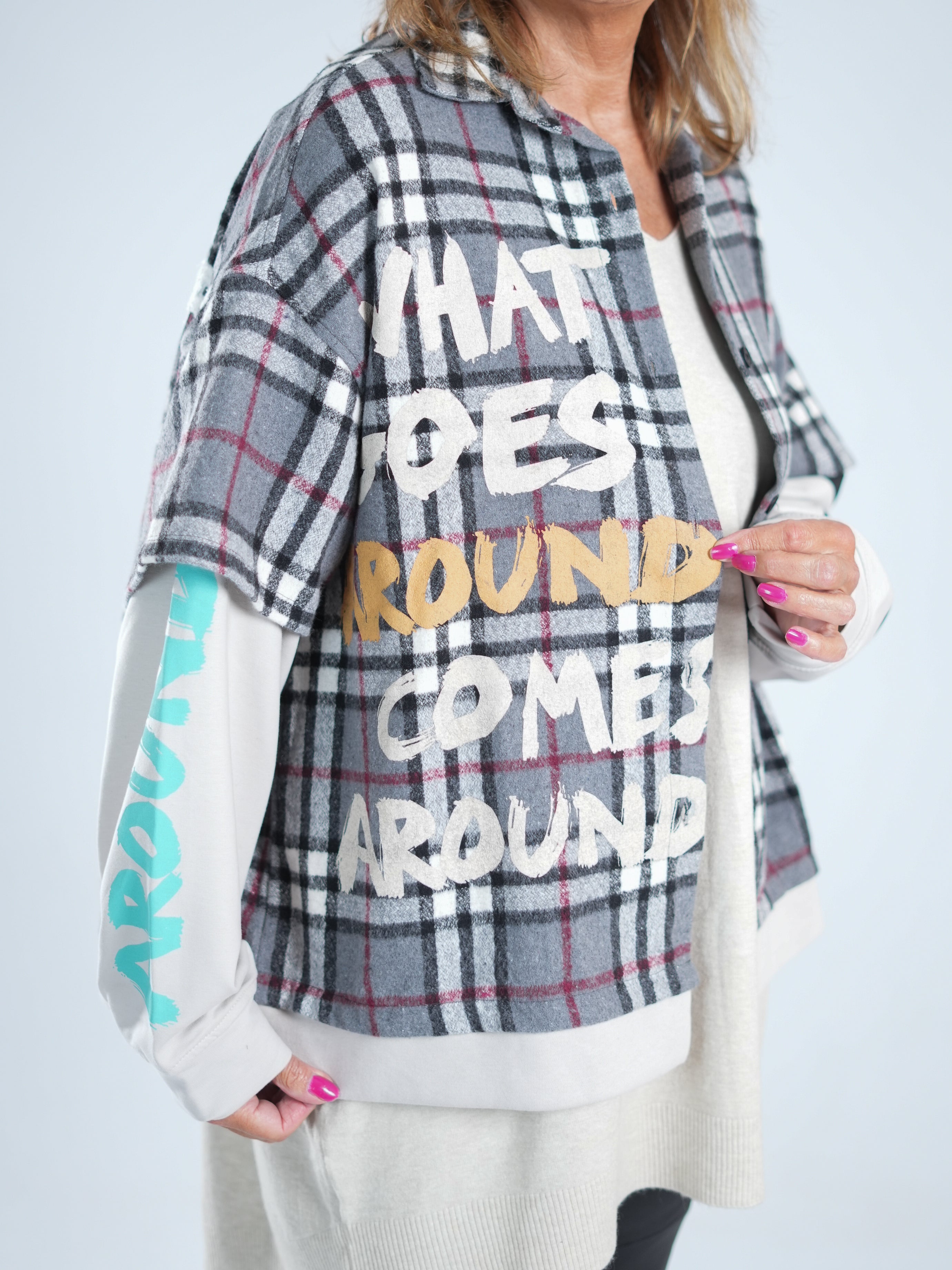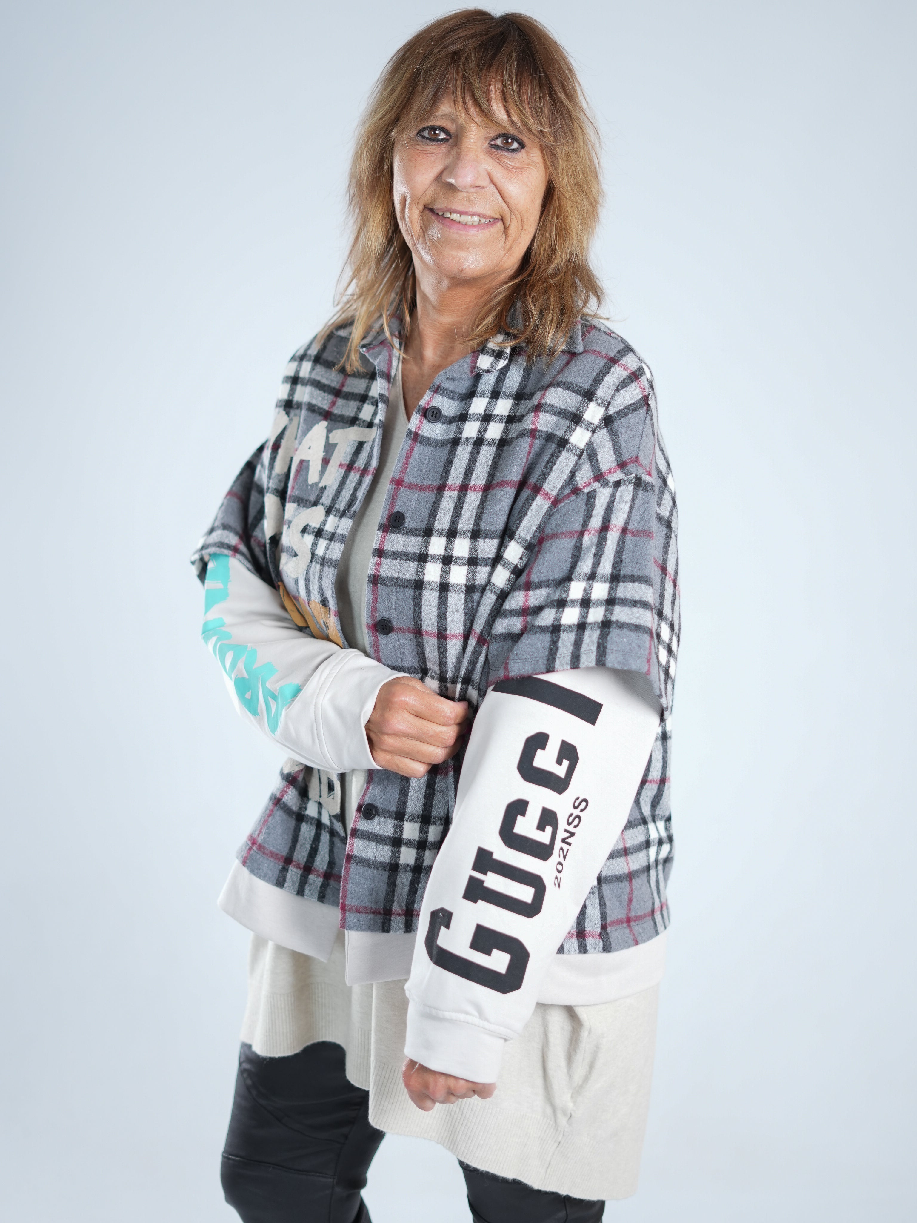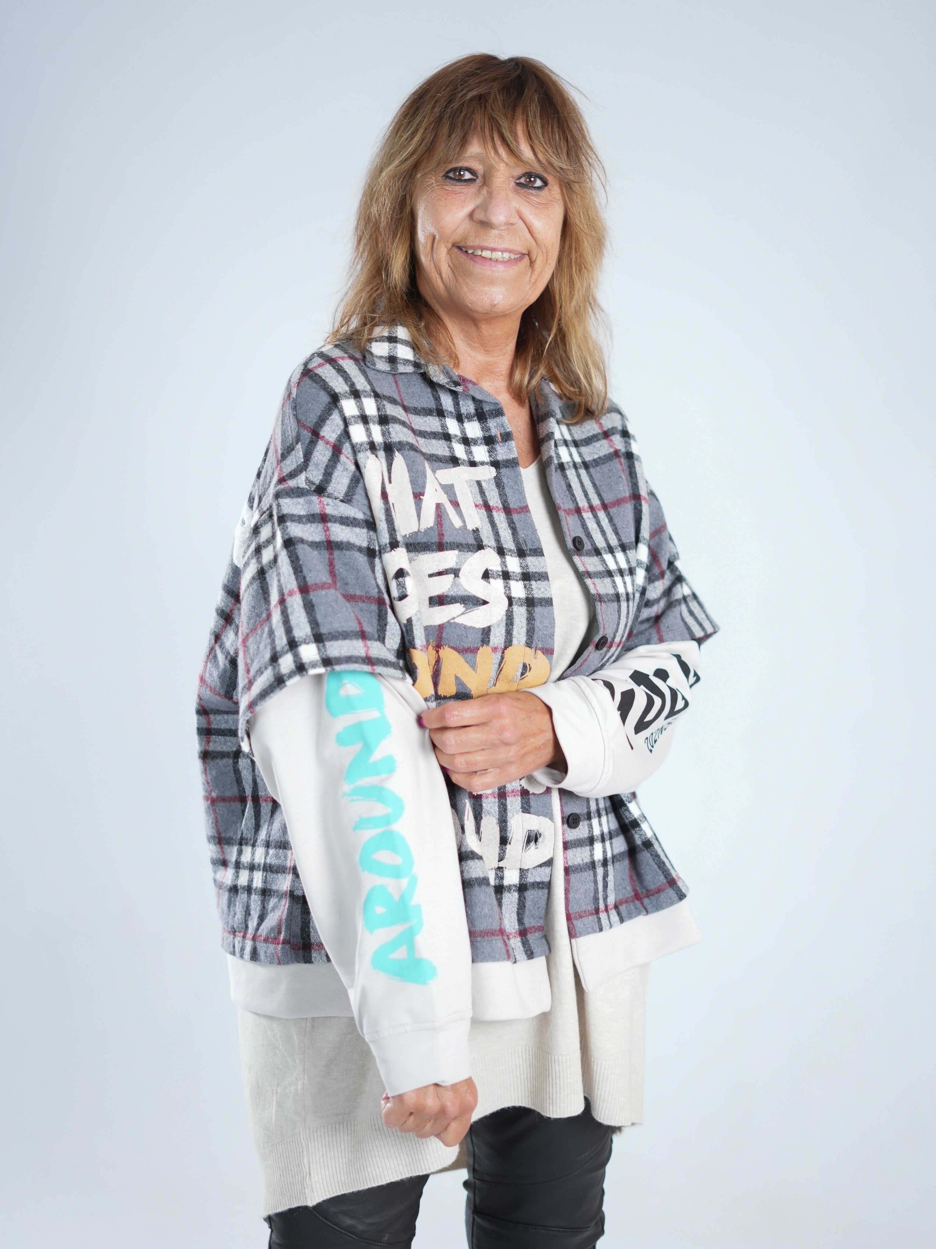 Marion ist 172cm groß und trägt Größe 40/42. Sie ist auf allen Produktbildern zu sehen und präsentiert die wunderschönen onesize Outfits.