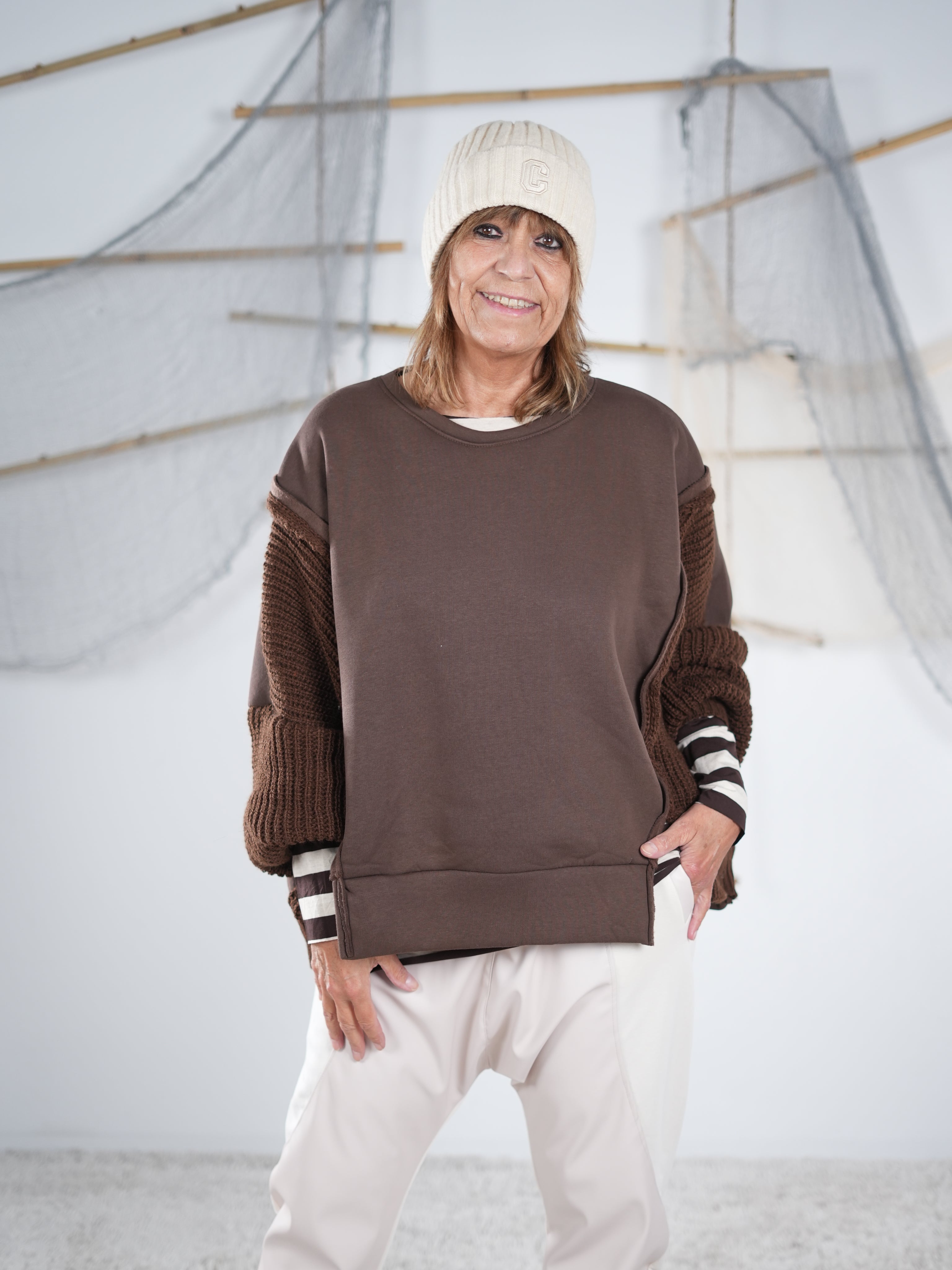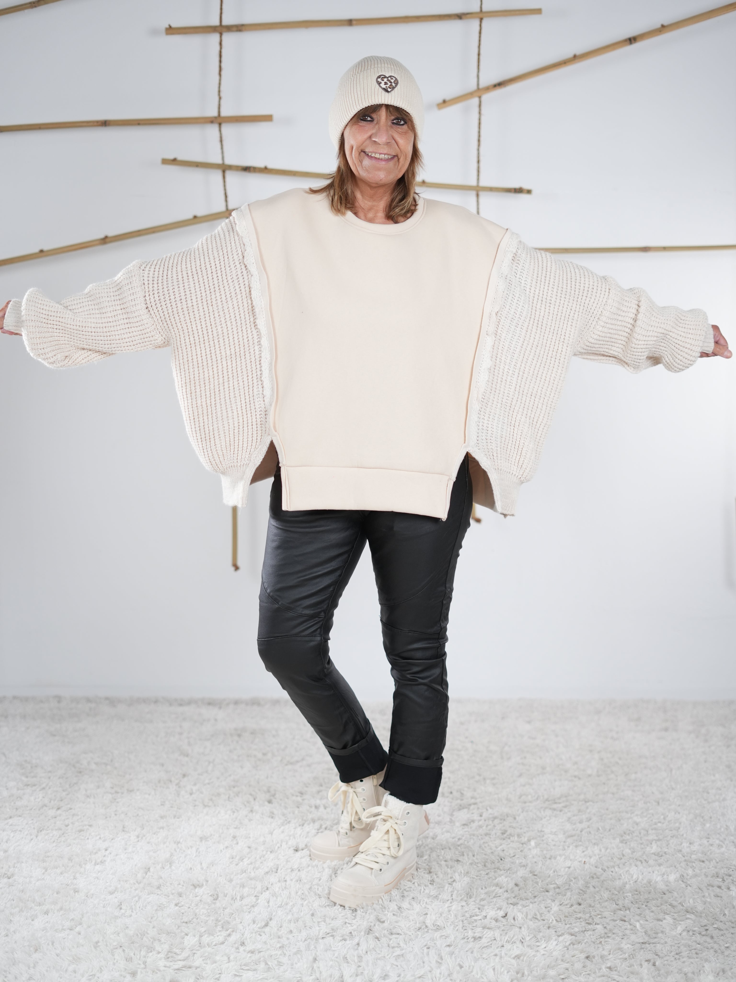 Marion ist 172cm groß und trägt Größe 40/42. Sie ist auf allen Produktbildern zu sehen und präsentiert die wunderschönen onesize Outfits.