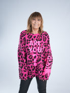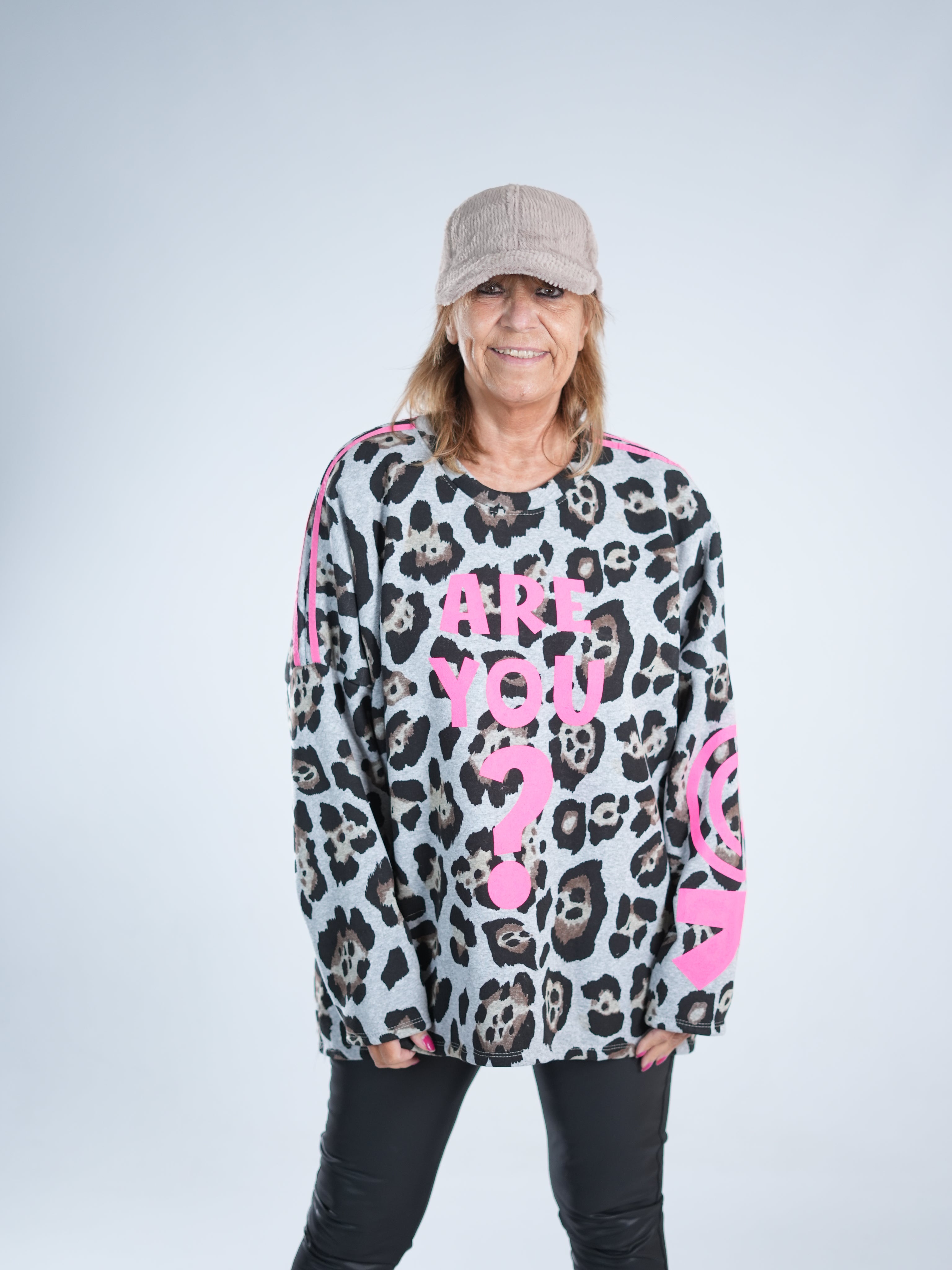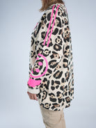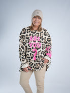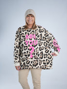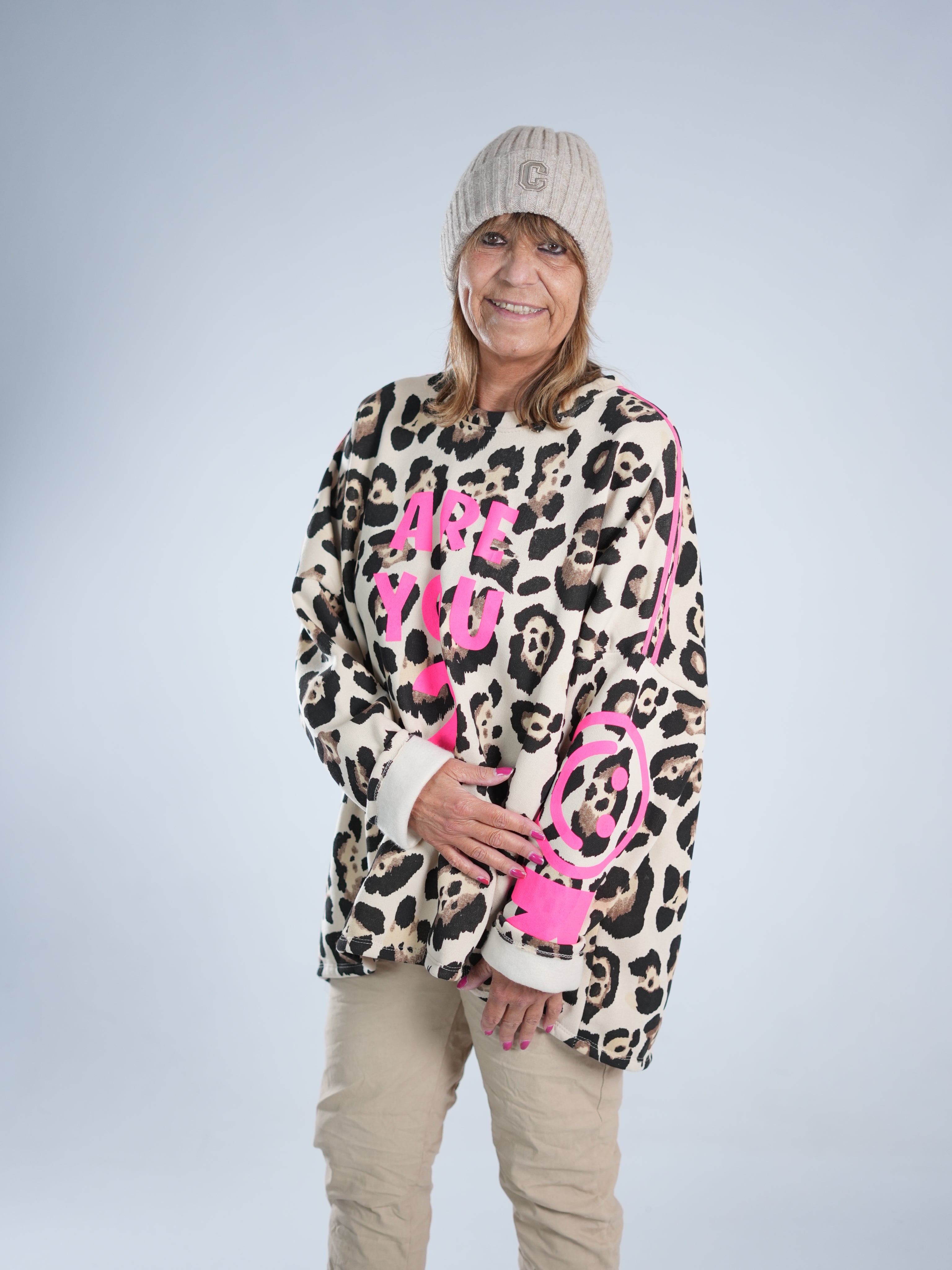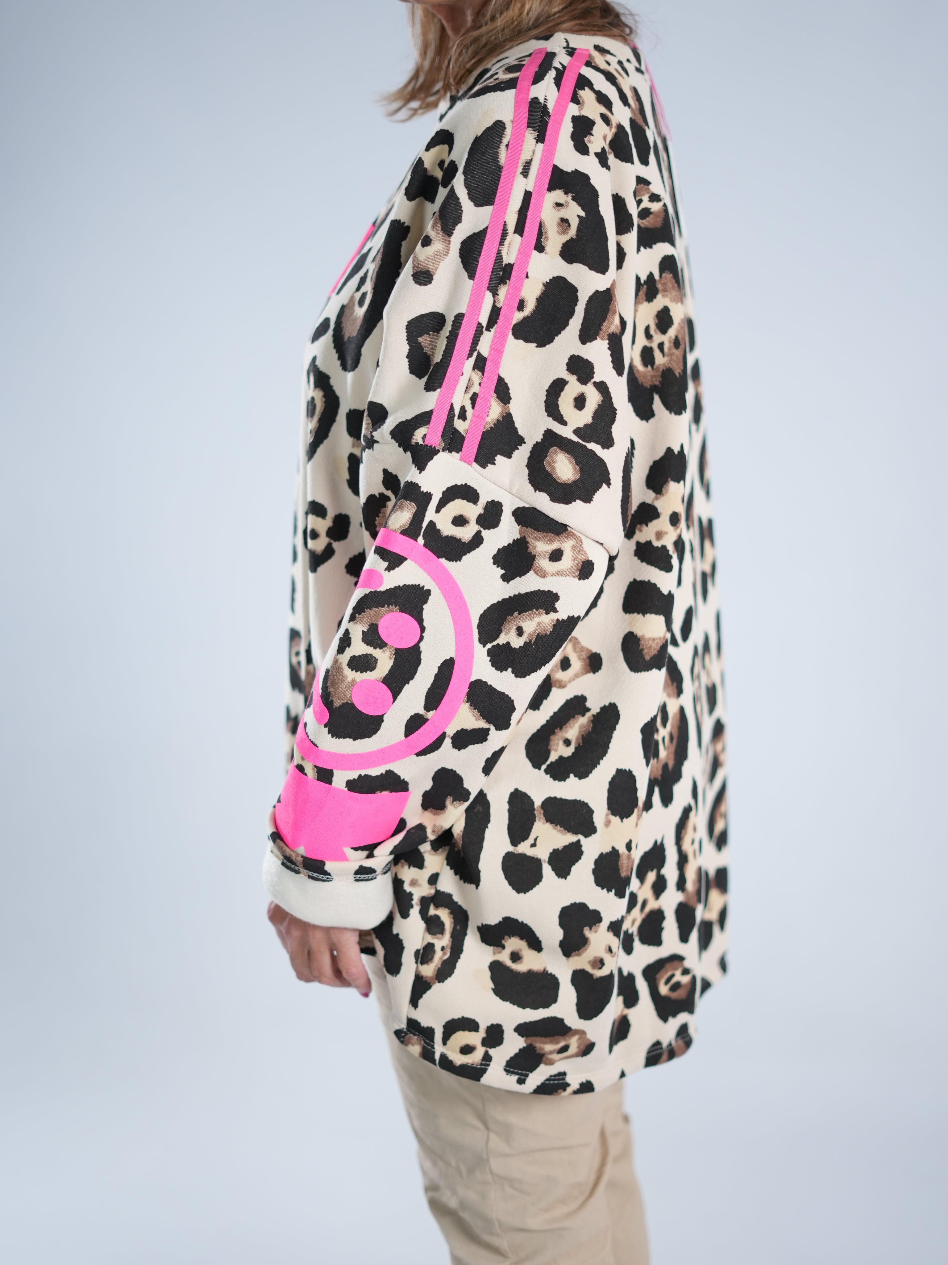 Dieses Sweaty im Leo-Look ist ein echter Eyecatcher! Der neonpinke Schriftzug auf den Ärmeln und dem Vorderteil bringt Farbe ins Spiel und macht das Teil zu etwas ganz Besonderem. Mit rundem Halsausschnitt und weich angerauter Innenseite trägt es sich super bequem – perfekt für kühle Tage. Und aufgepasst: Es handelt sich um einen Outdoor-Hoody – also ideal für Spaziergänge, Auszeiten an der frischen Luft oder den stylischen Alltagslook!