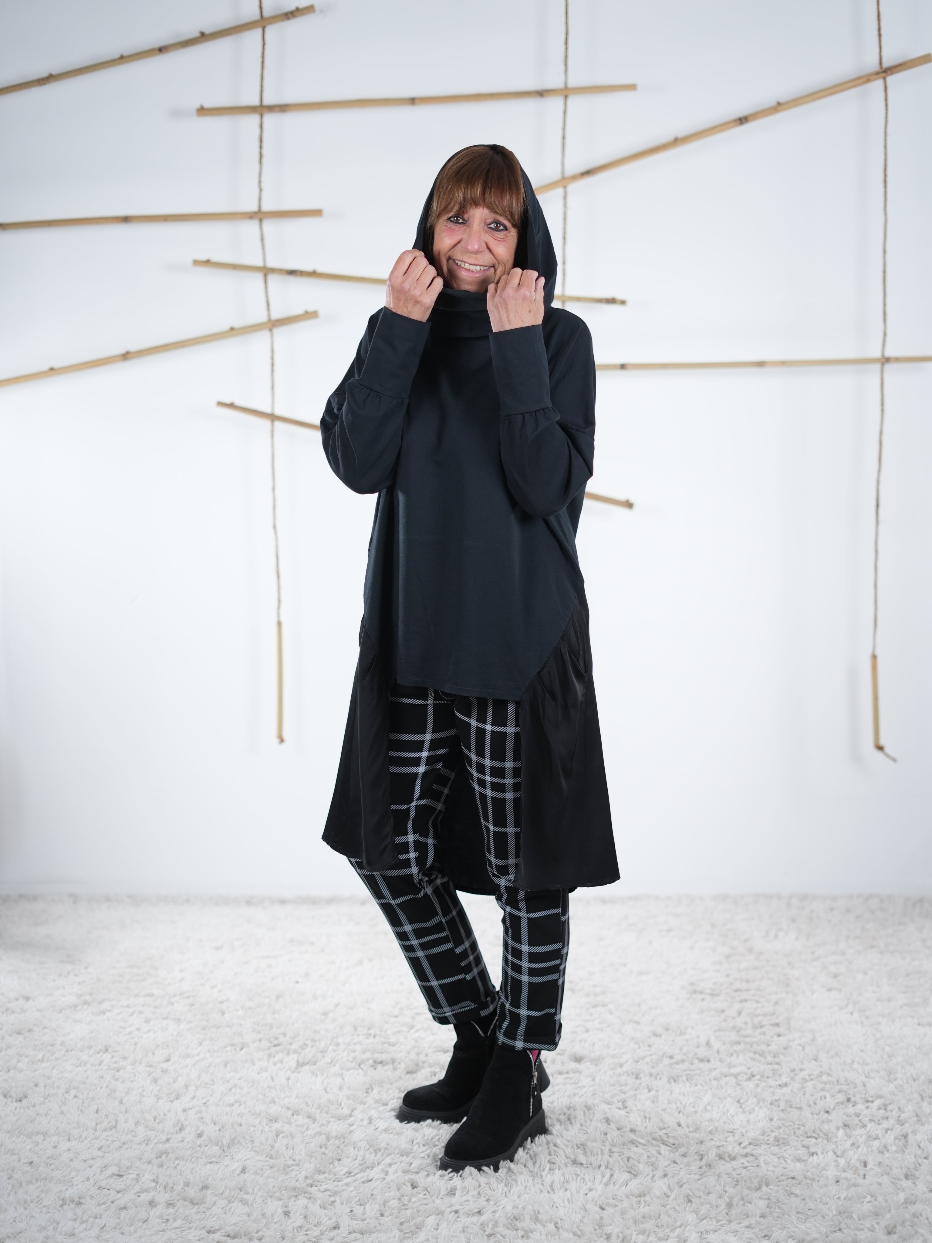 Marion ist 172cm groß und trägt Größe 40/42. Sie ist auf allen Produktbildern zu sehen und präsentiert die wunderschönen onesize Outfits.