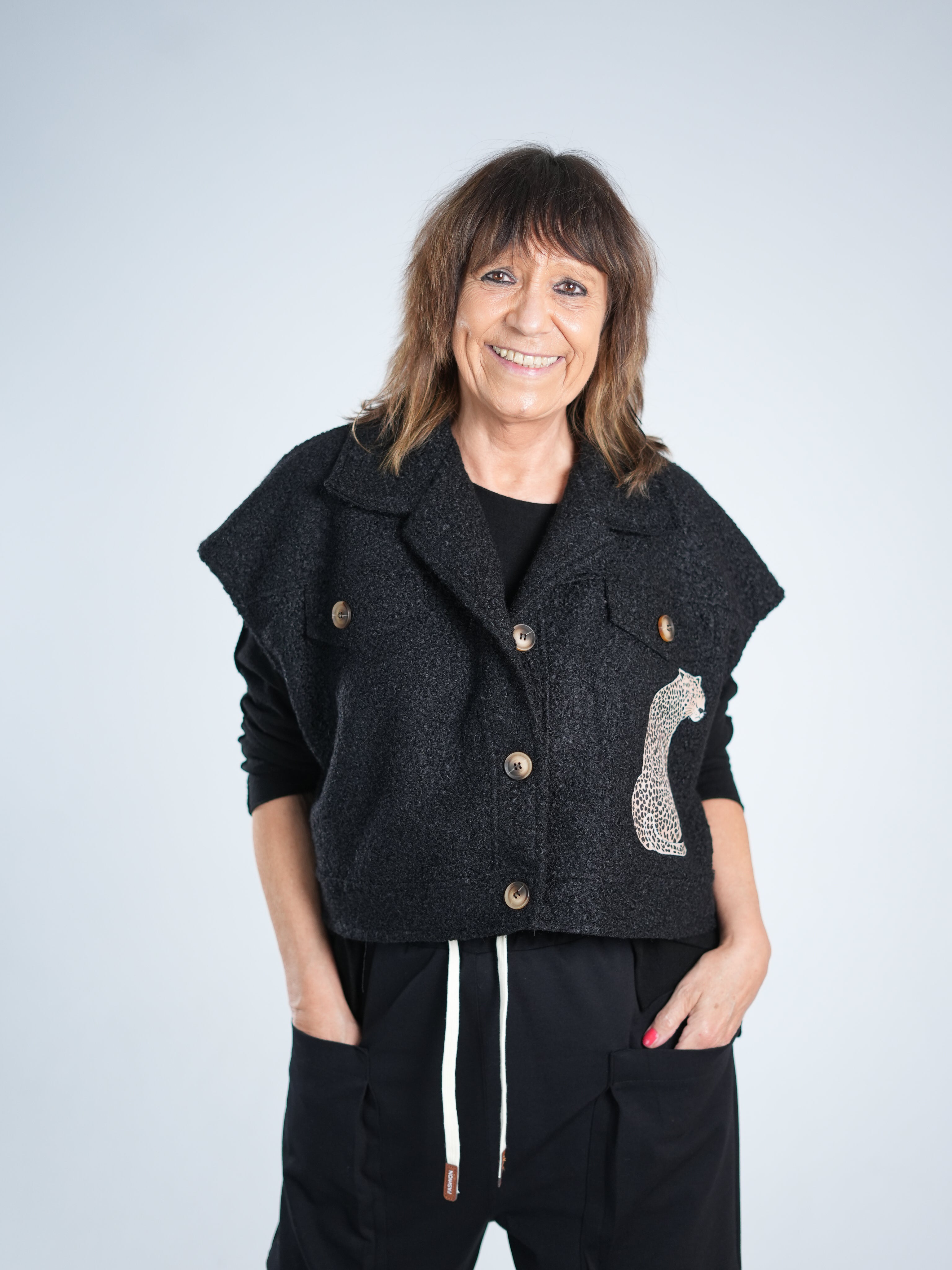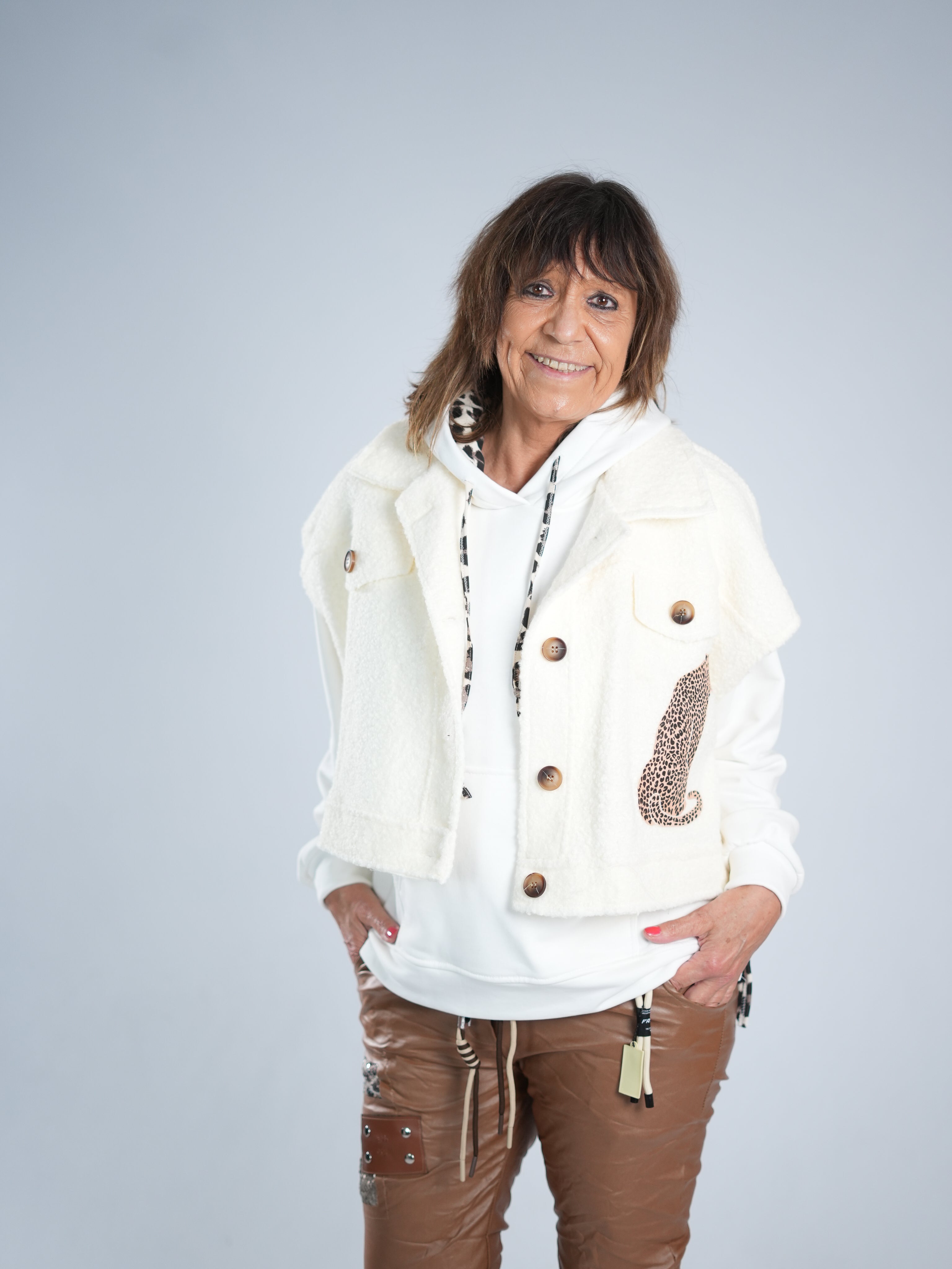 Marion ist 172cm groß und trägt Größe 40/42. Sie ist auf allen Produktbildern zu sehen und präsentiert die wunderschönen onesize Outfits.