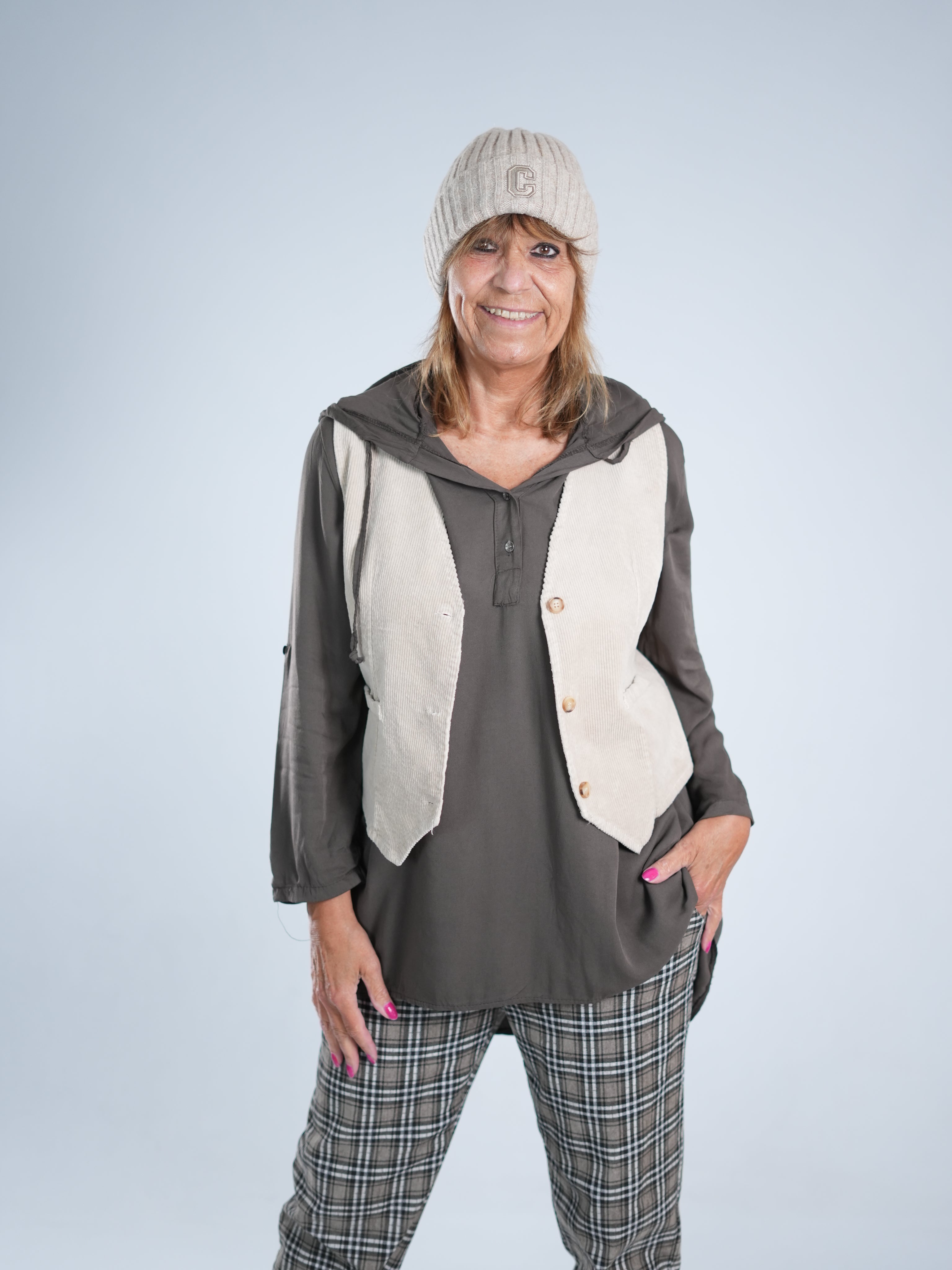 Marion ist 172cm groß und hat Konfektionsgröße 40/42.