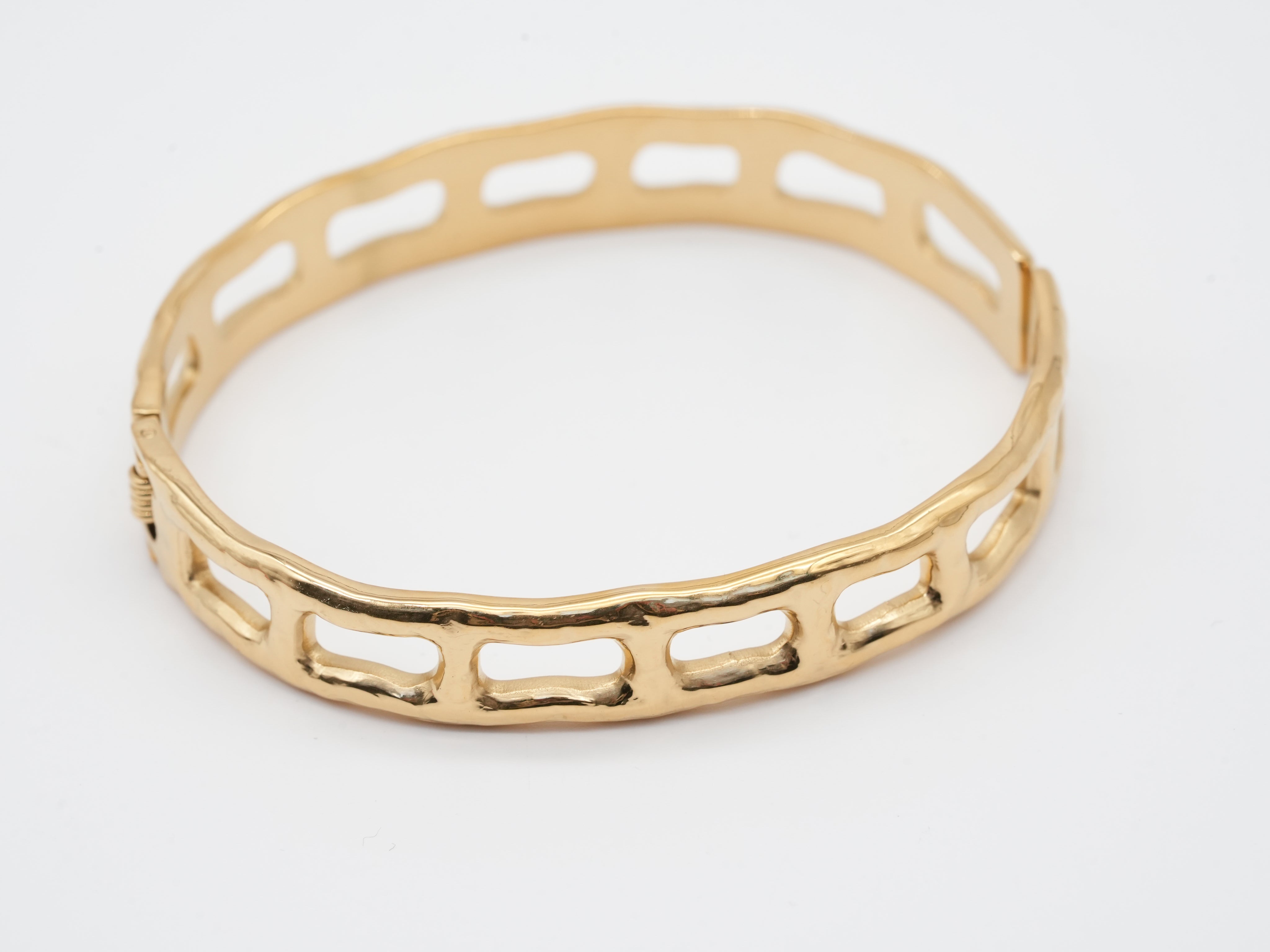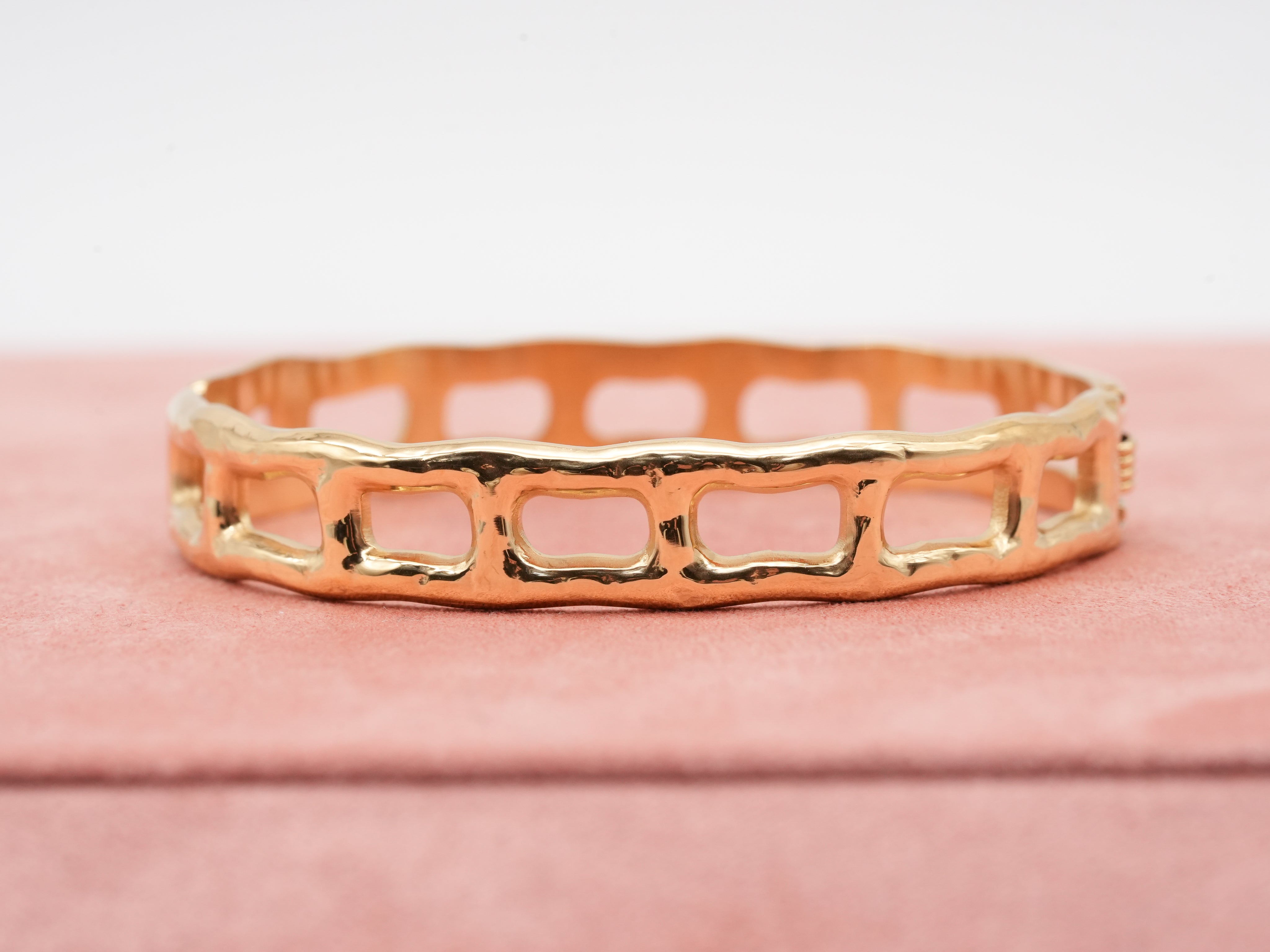 Dieser Armreif besticht durch sein modernes, klares Design 💫 Seine leicht unregelmäßige Form und die offenen Rechtecke verleihen ihm eine besondere Leichtigkeit und Modernität. Der glänzende Goldton ist dabei schön elegant, sowohl im Alltag als auch zu besonderen Anlässen. Der Armreif ist aus hochwertigem Edelstahl gefertigt, also langlebig, hautfreundlich und angenehm zu tragen. Ein moderner Klassiker für alle Freunde klarer Formen und zeitloser Eleganz ✨