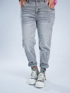 Die neue Jeans von Sexy Woman ist nicht nur ein Hingucker, sondern auch super praktisch. Auf den Oberschenkeln hat sie mit Stoff hinterlegte Löcher, dazu kommen zwei Eingriffstaschen und Gesäßtaschen. Innen sorgt eine Frottee-Beschichtung dafür, dass sie windundurchlässig ist und angenehm wärmt – perfekt für kühlere Tage. Auf dem Foto trage ich sie eine Nummer größer, so wirkt sie wie eine lässige Boyfriend-Jeans.