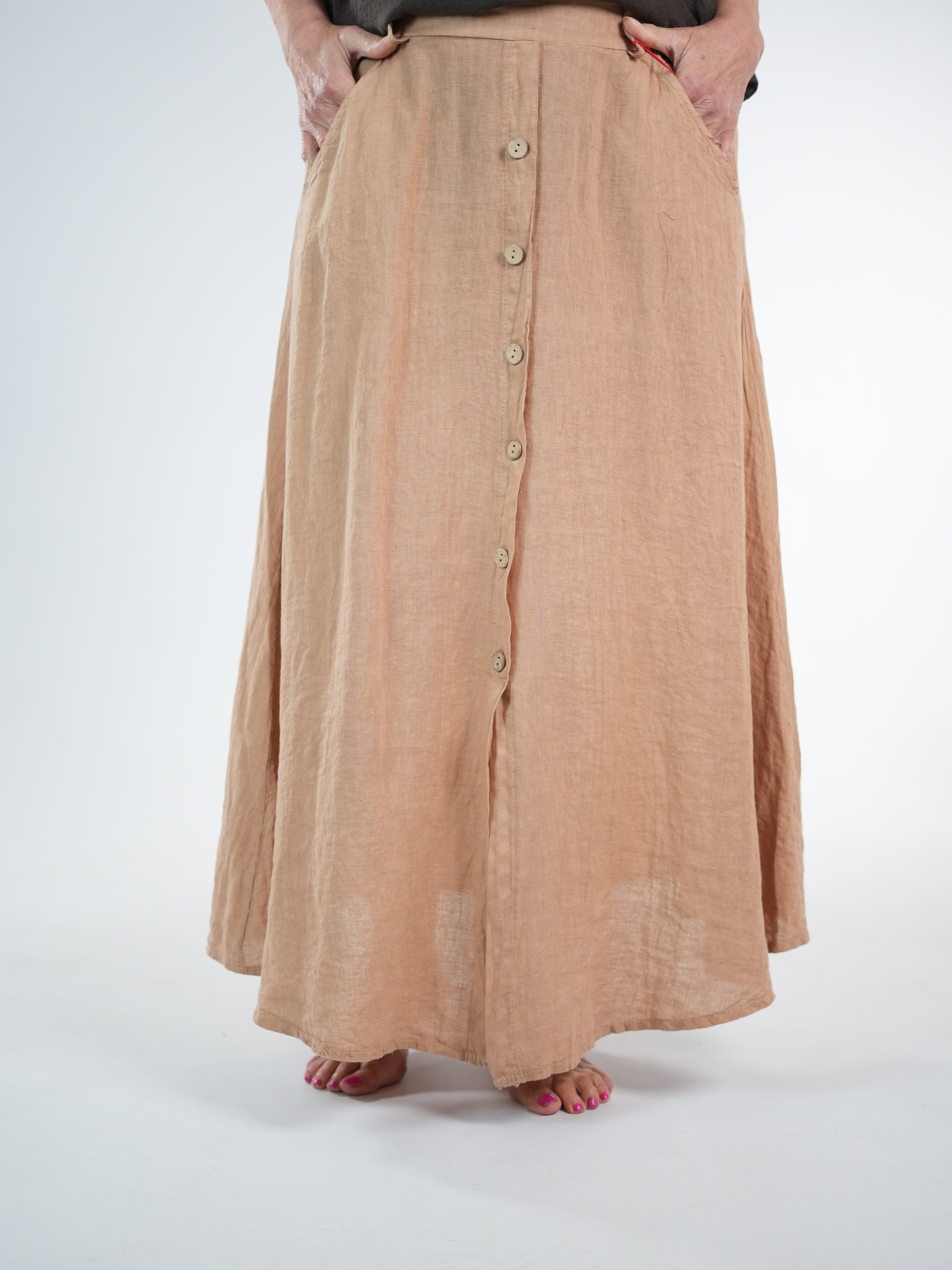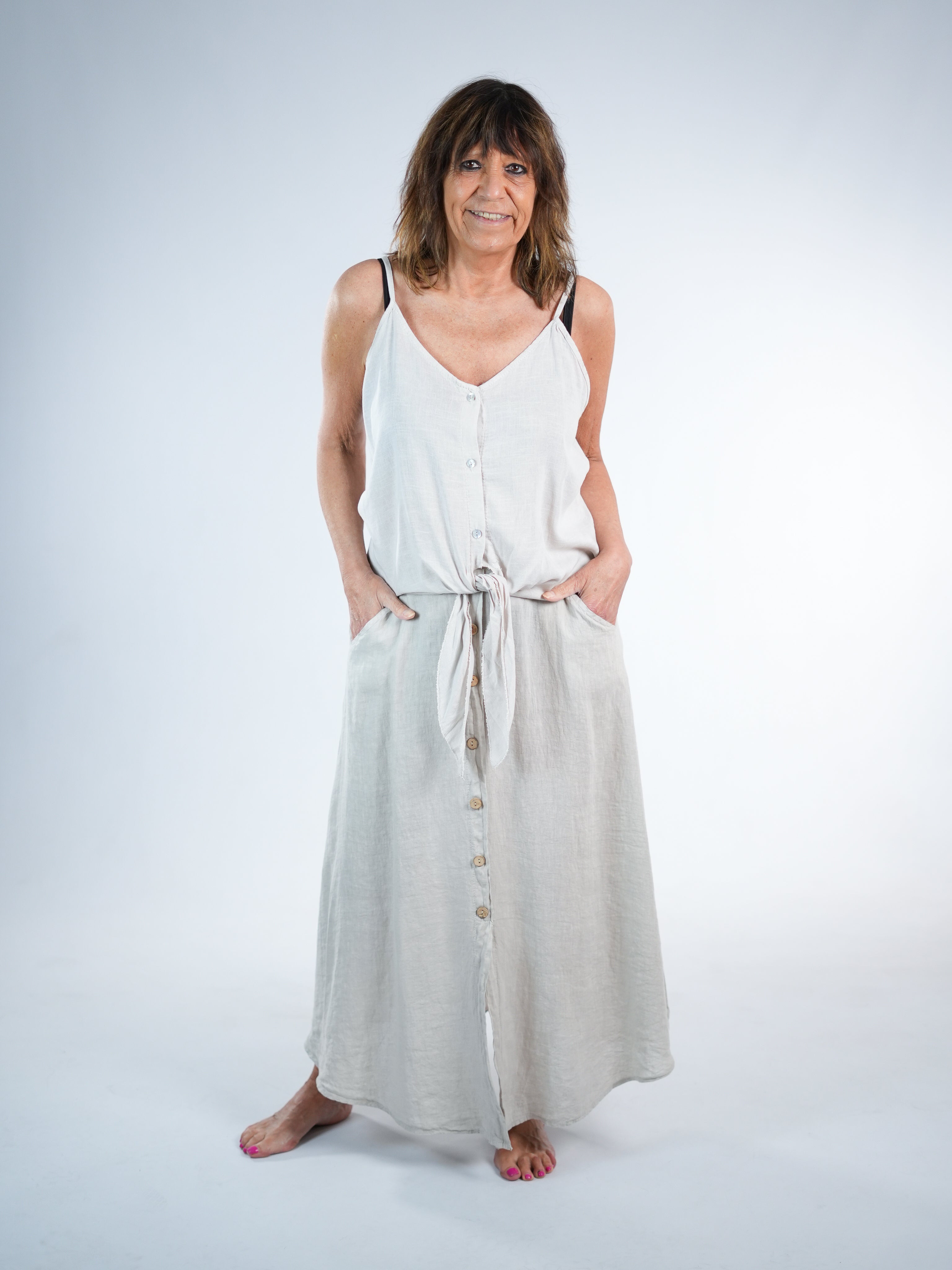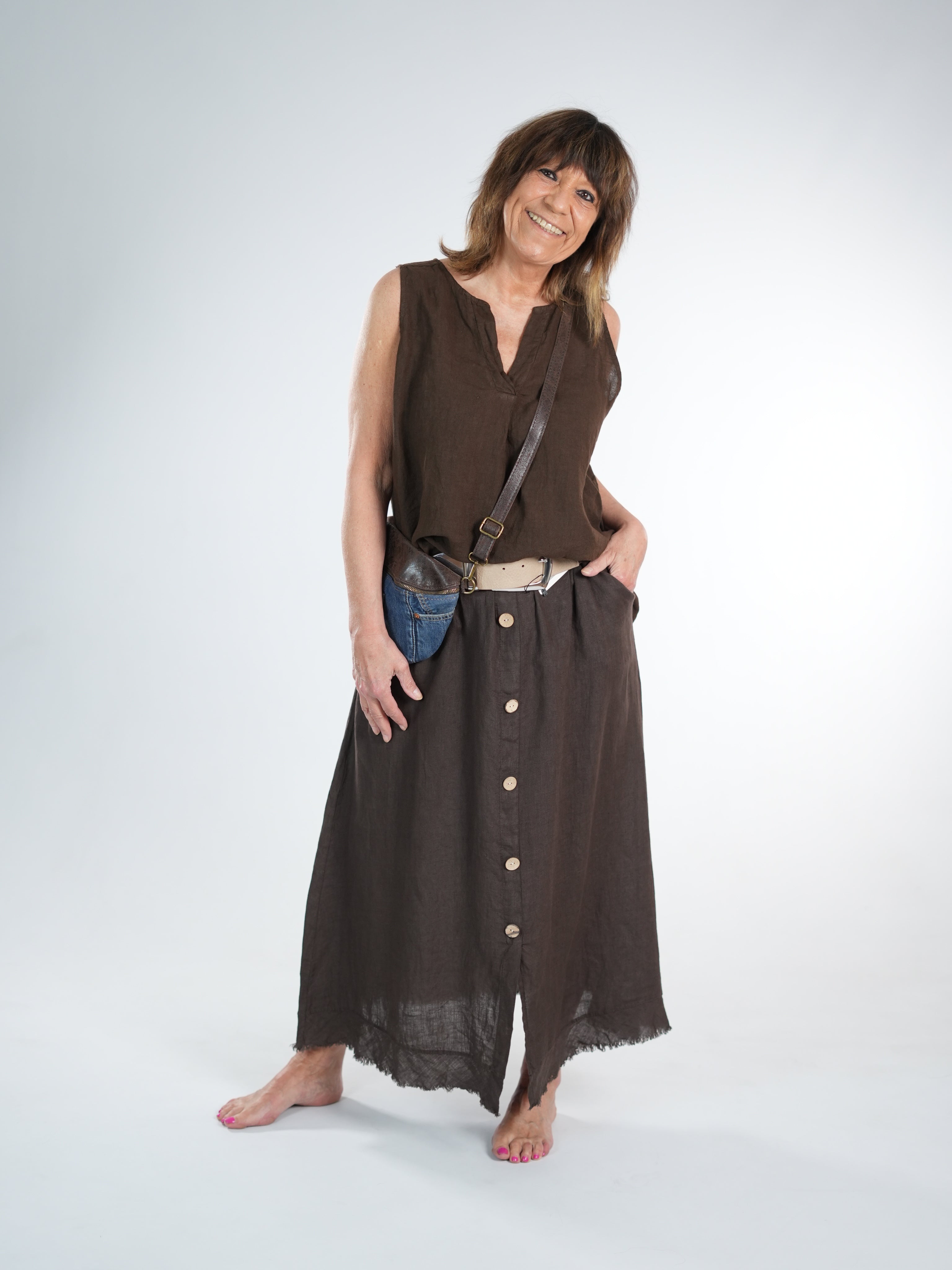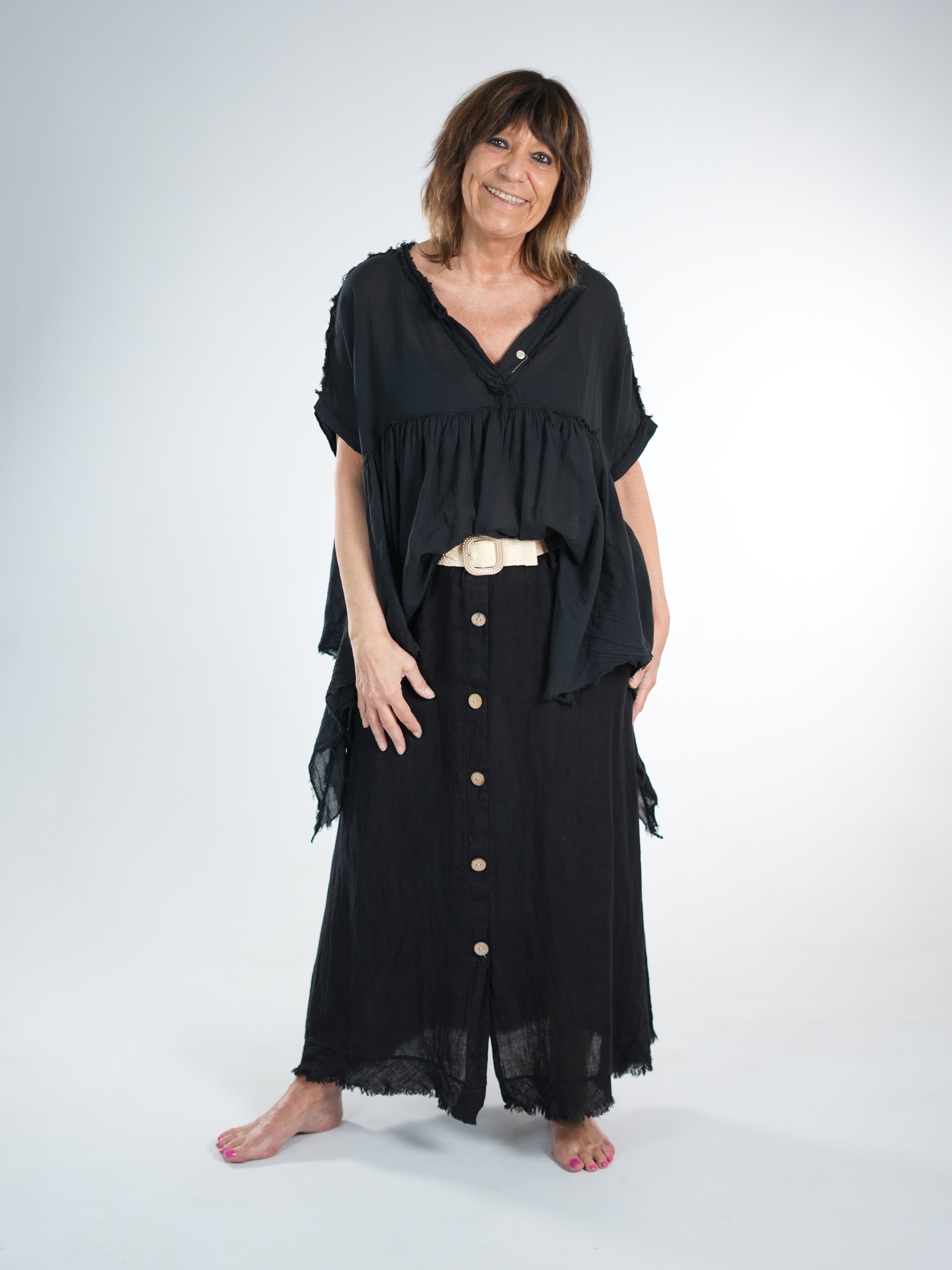 Marion ist 172cm groß und trägt Größe 40/42. Sie ist auf allen Produktbildern zu sehen und präsentiert die wunderschönen onesize Outfits.