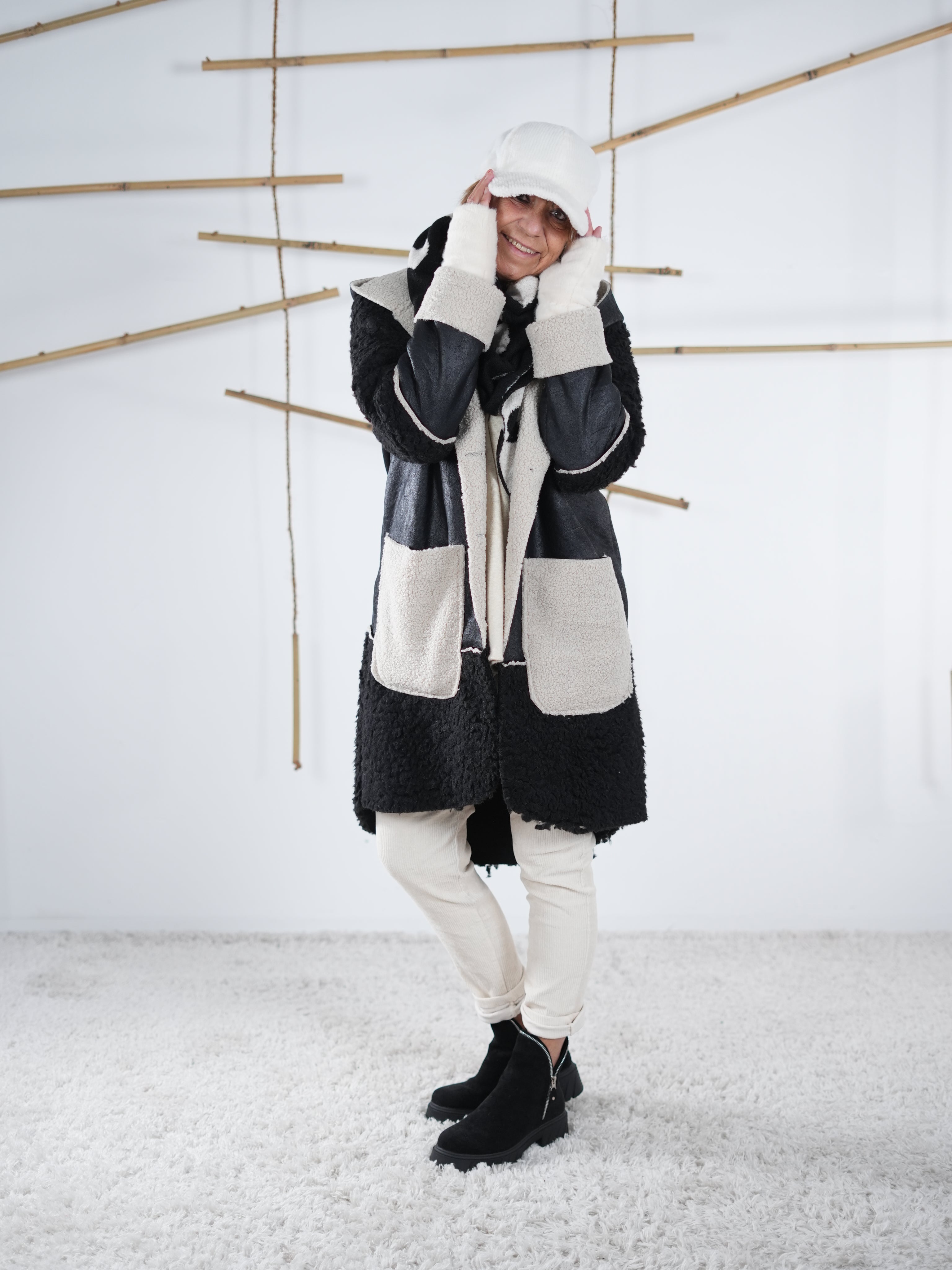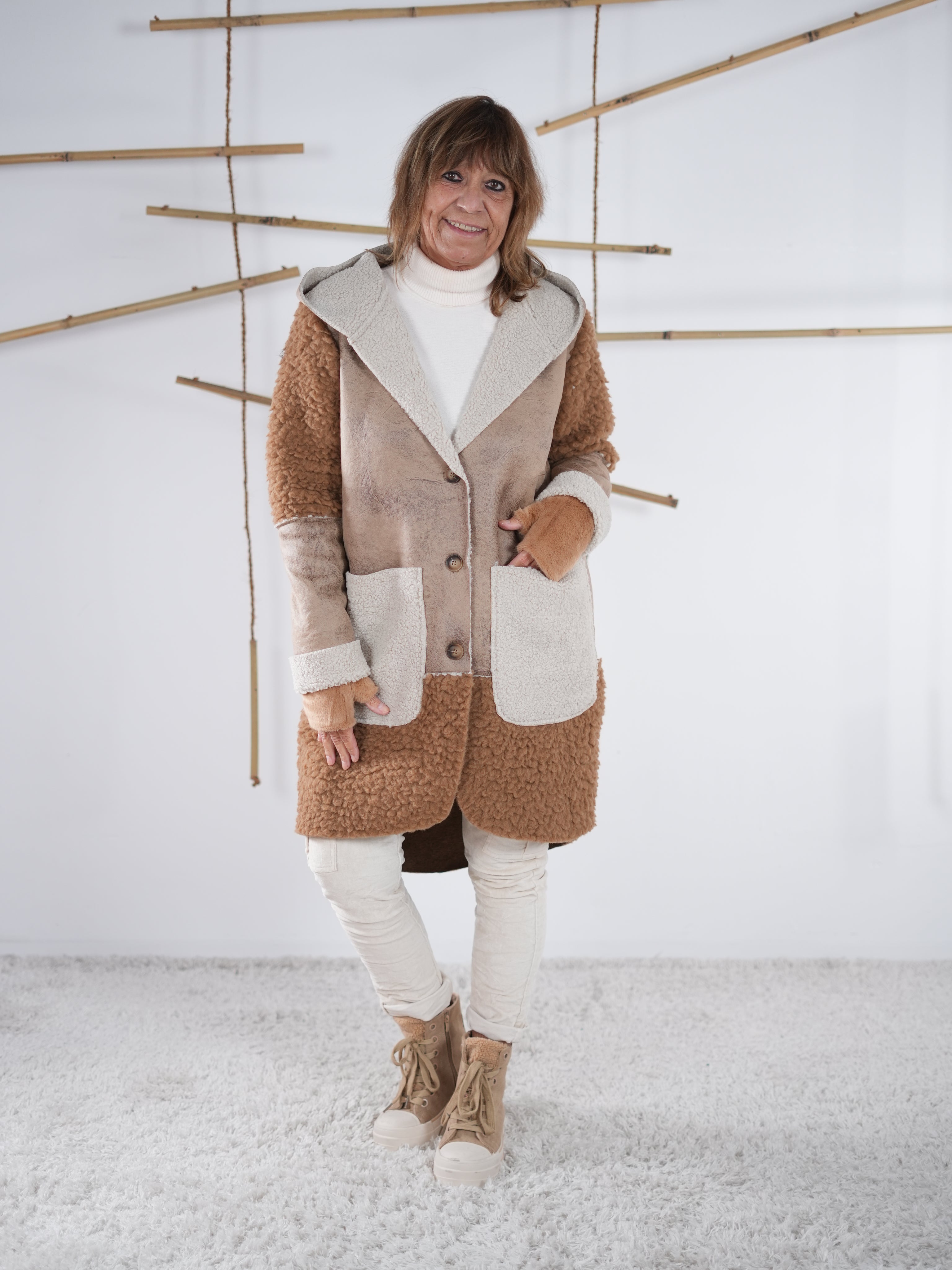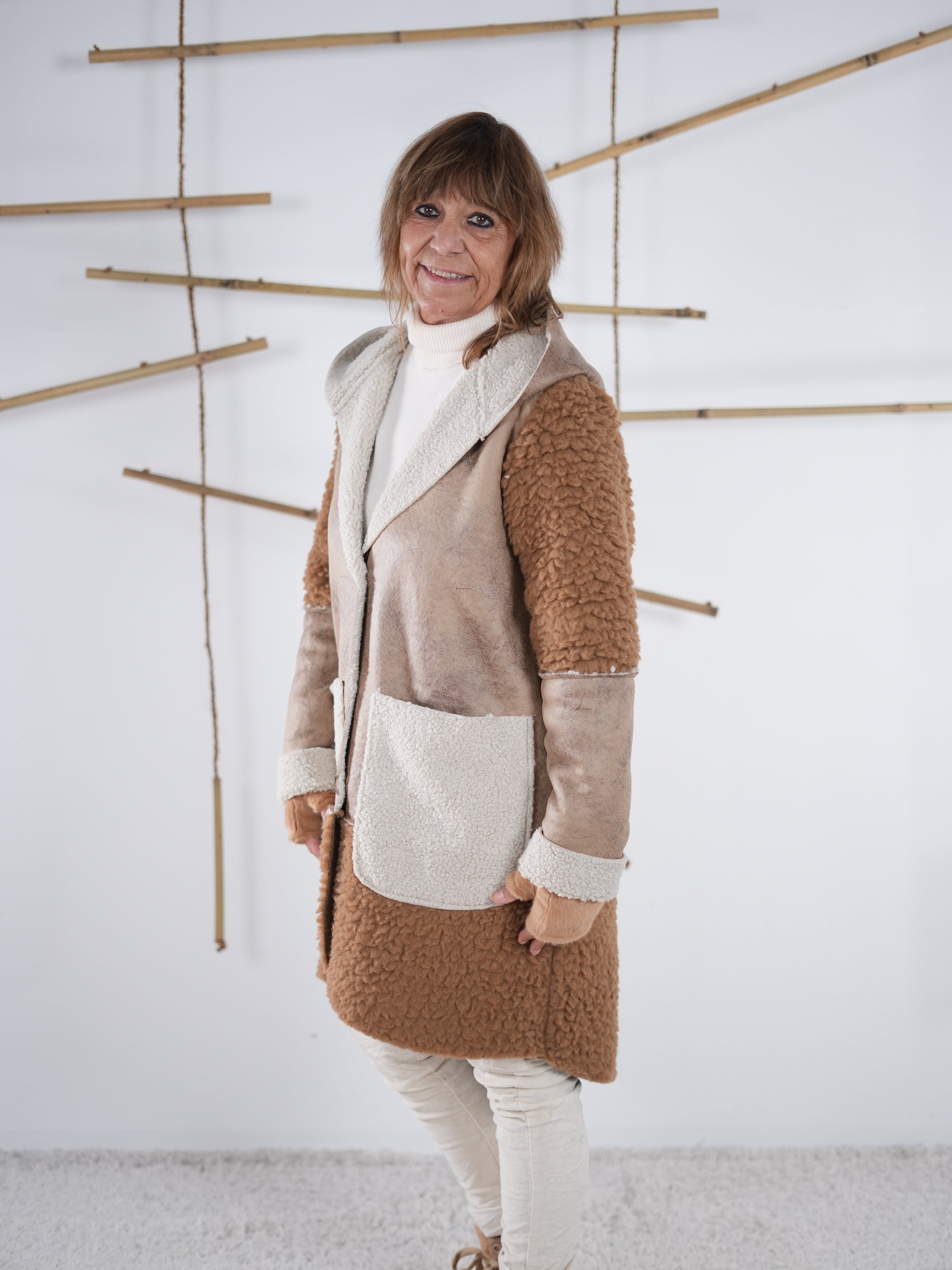 Marion ist 172cm groß und trägt Größe 40/42. Sie ist auf allen Produktbildern zu sehen und präsentiert die wunderschönen onesize Outfits.