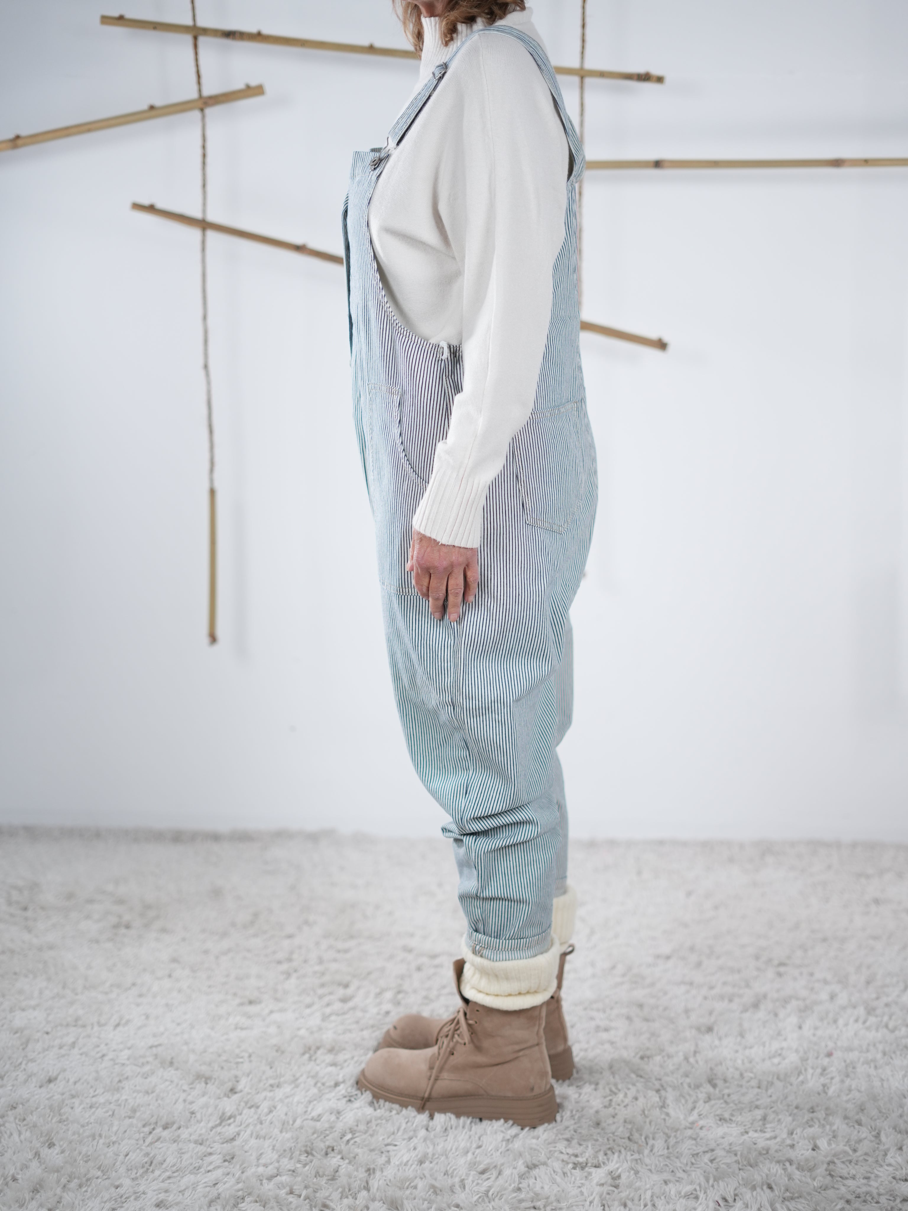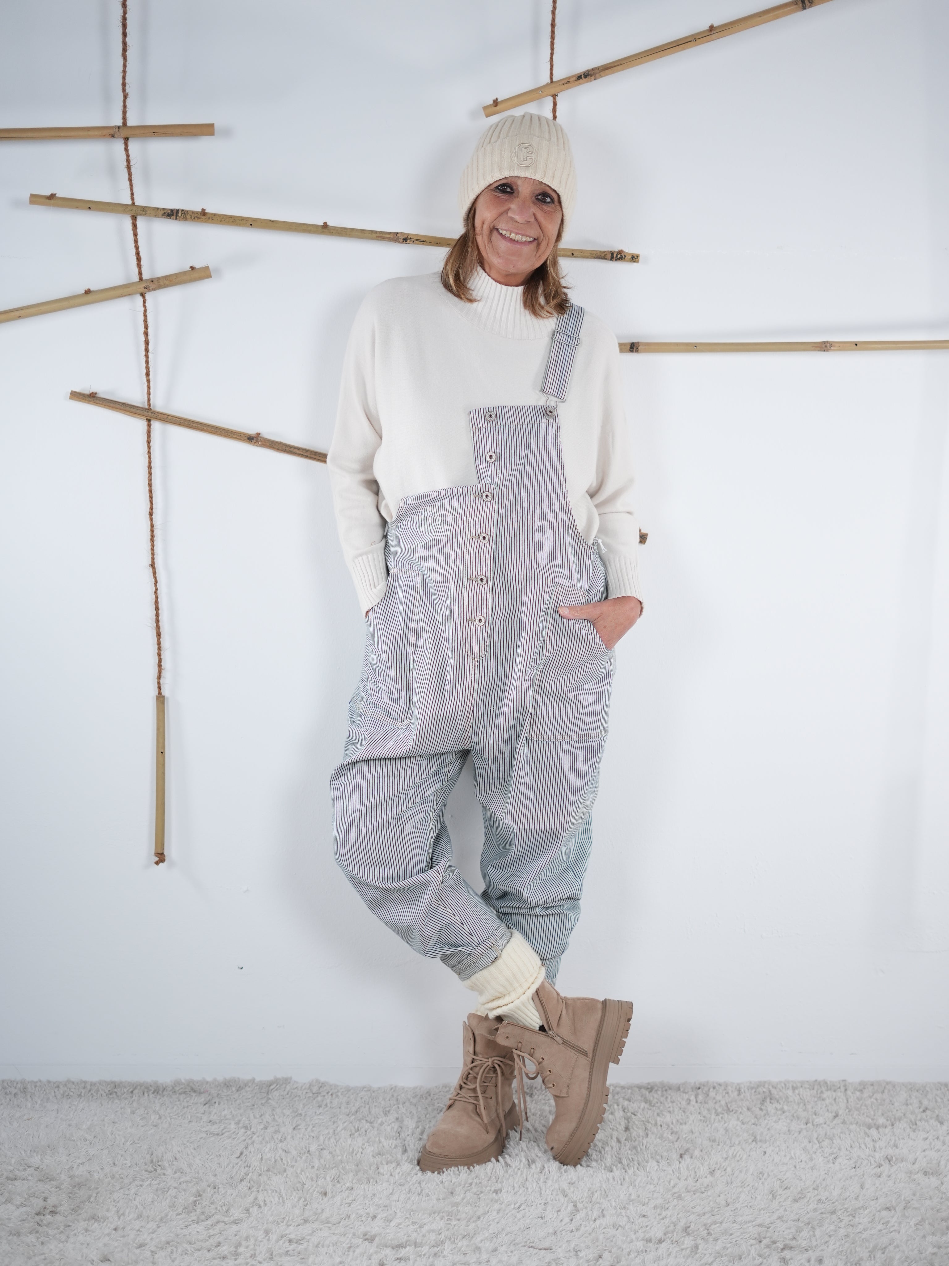 Unsere beliebten Latzhosen sind wieder da – und dieses Mal zeigen sie sich in einer feinen, dezenten Streifenoptik!