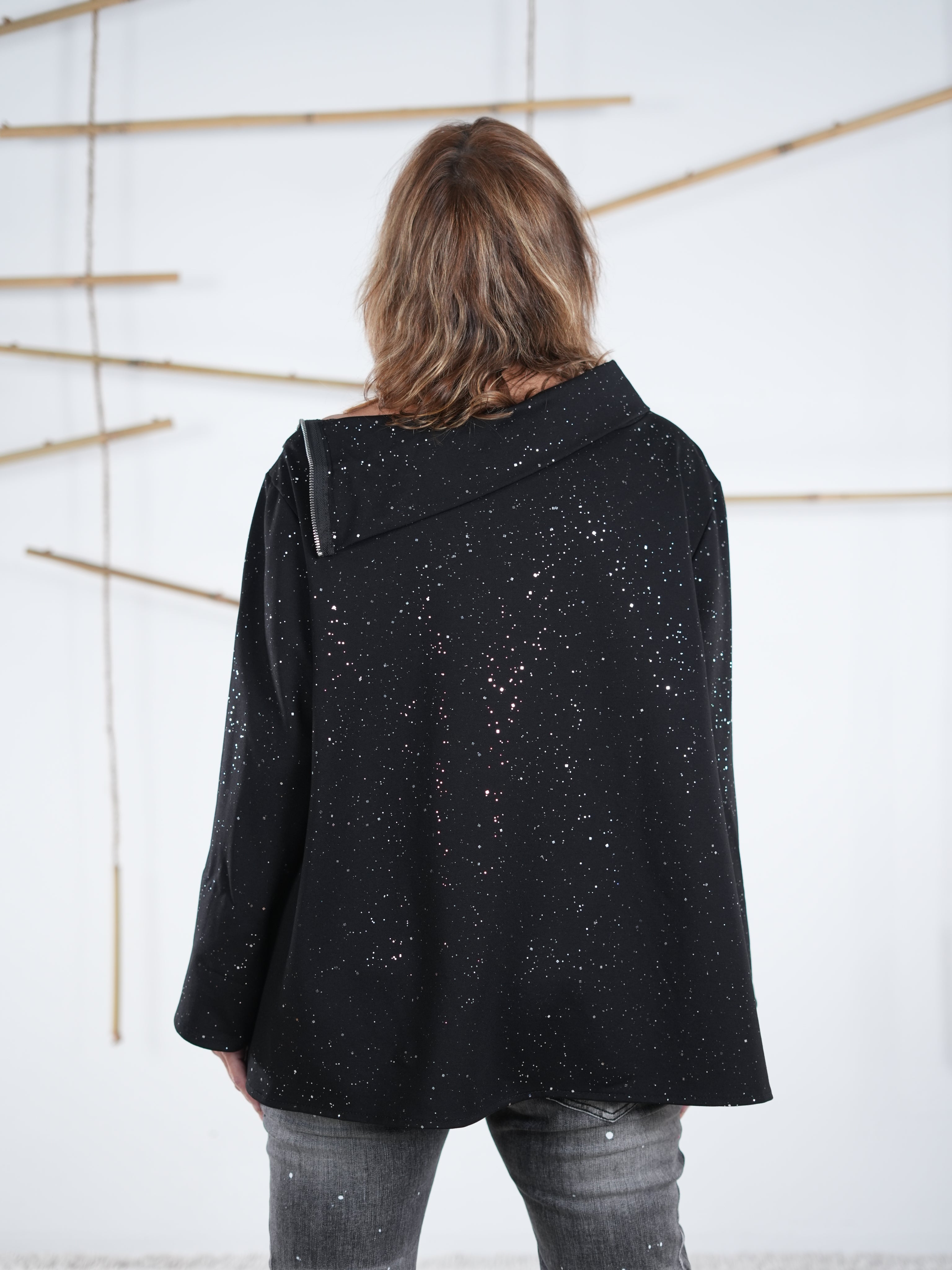 Glitzer-Pulli in Schwarz mit asymmetrischem Kunstleder-Detail & Zipper