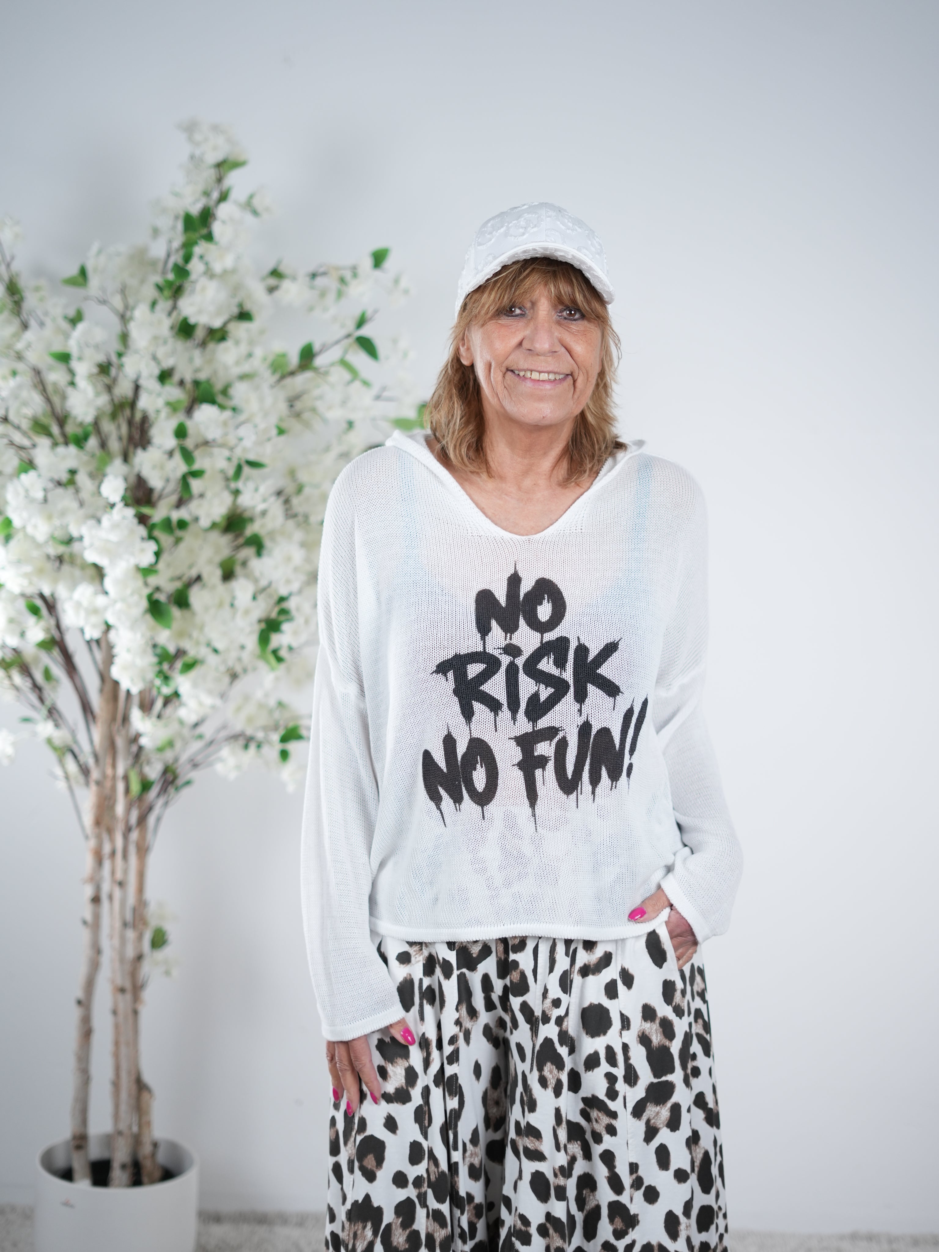 leichter Strickpulli mit Kapuze und Schriftzug