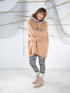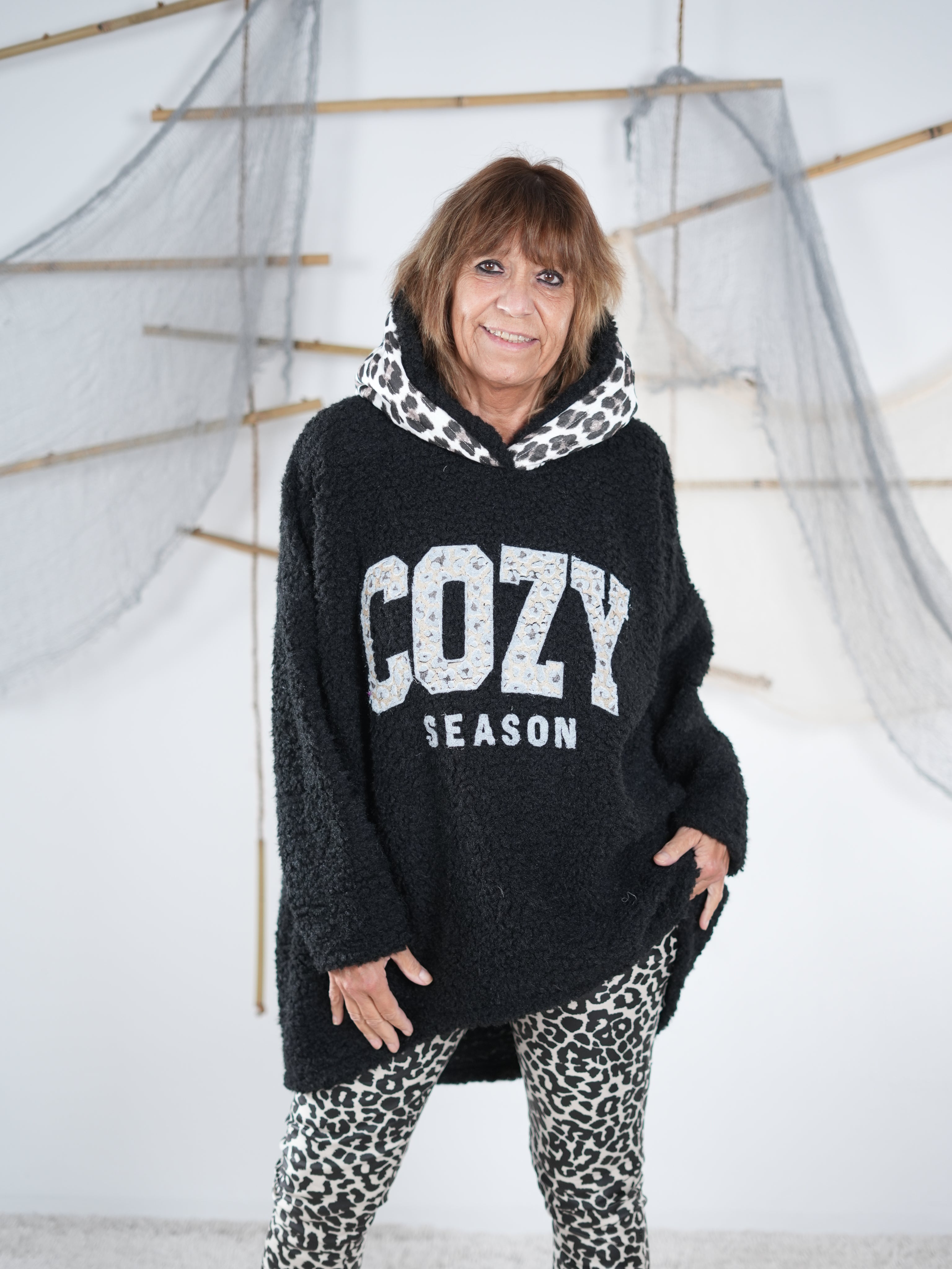 Marion ist 172cm groß und trägt Größe 40/42. Sie ist auf allen Produktbildern zu sehen und präsentiert die wunderschönen onesize Outfits.