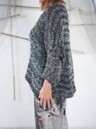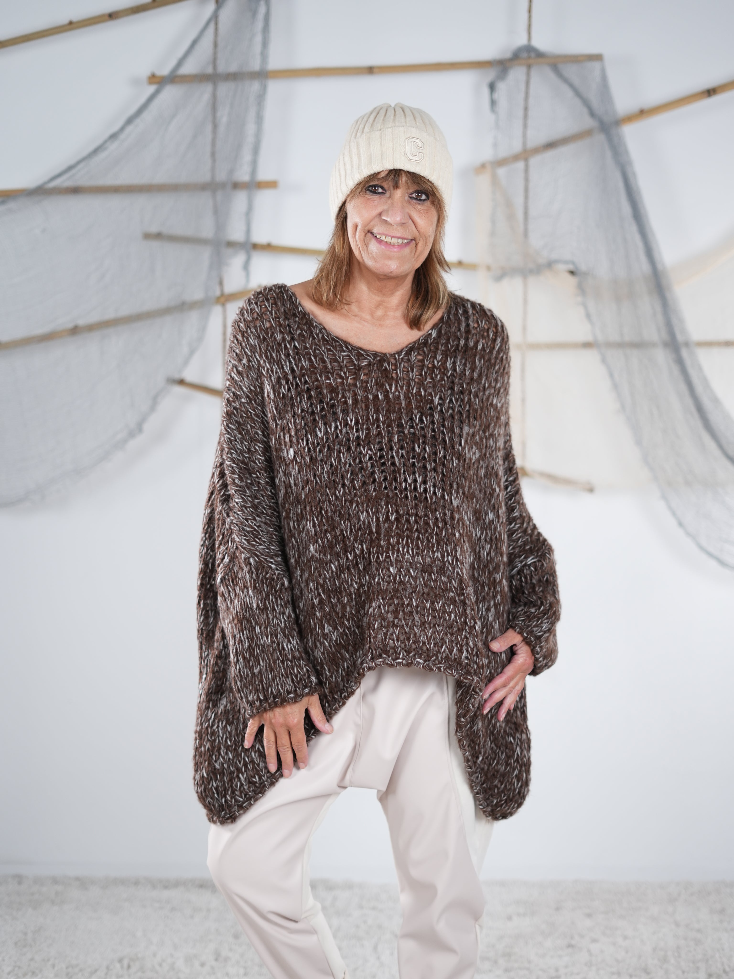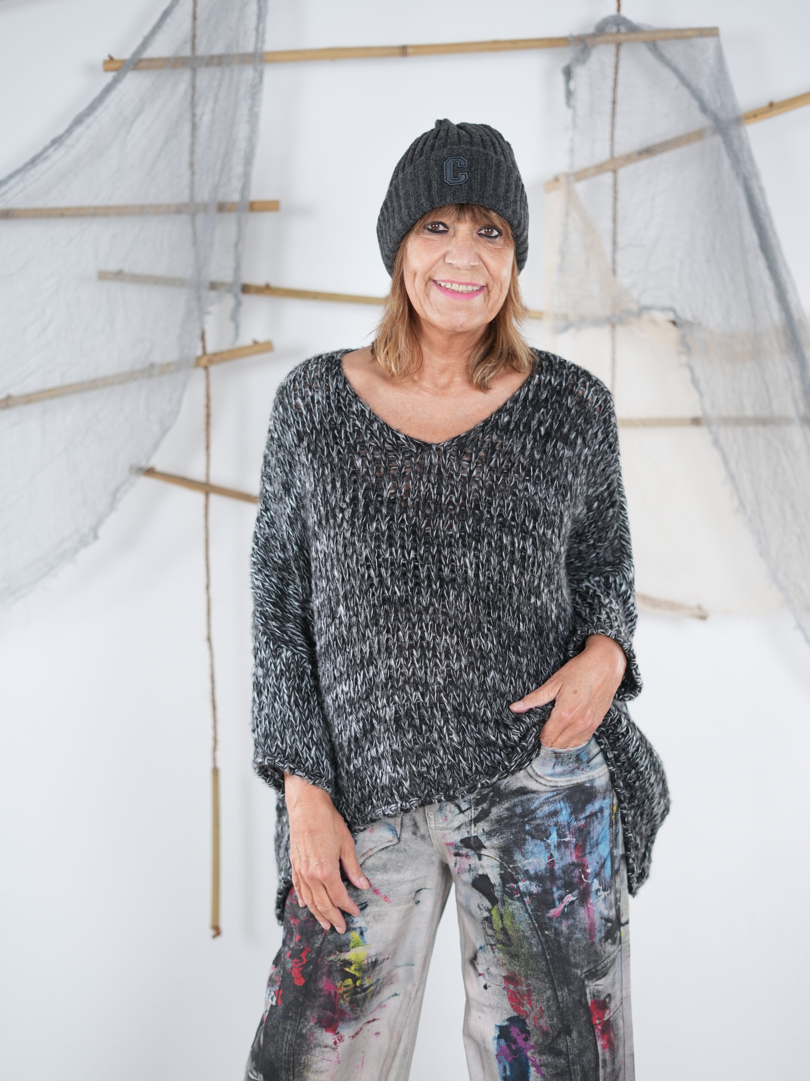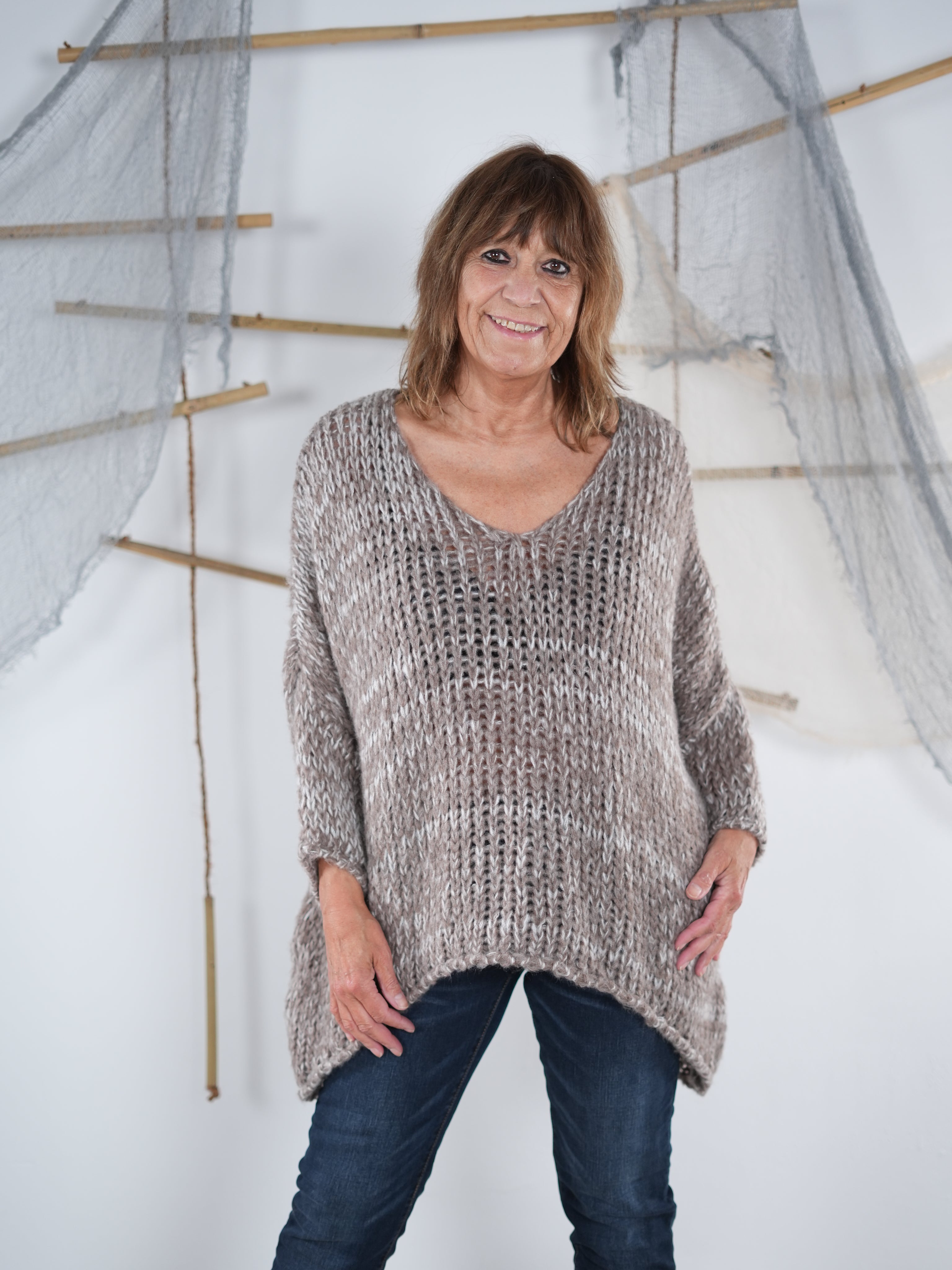 Marion ist 172cm groß und trägt Größe 40/42. Sie ist auf allen Produktbildern zu sehen und präsentiert die wunderschönen onesize Outfits.