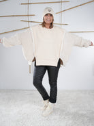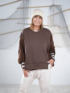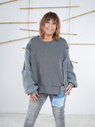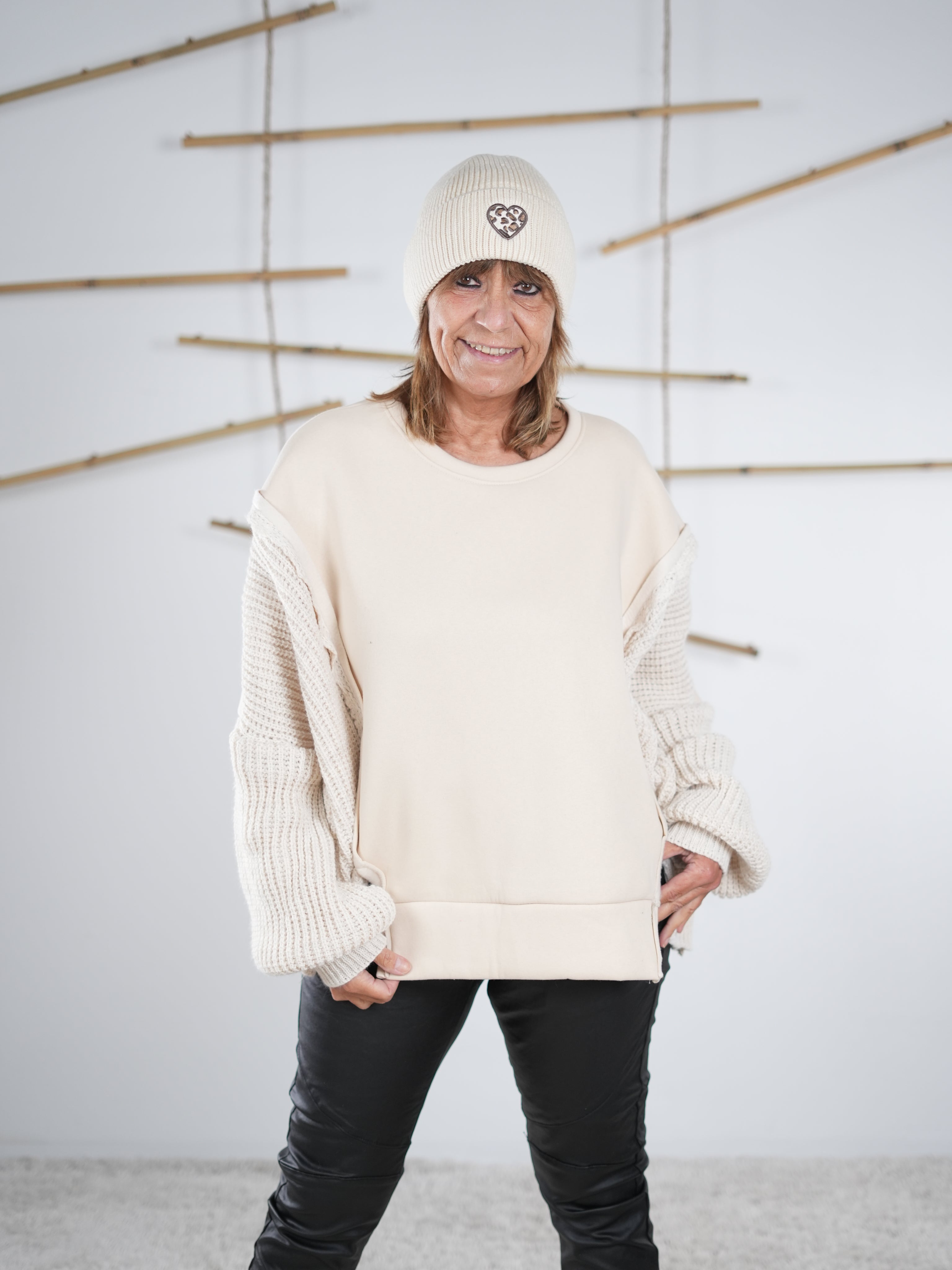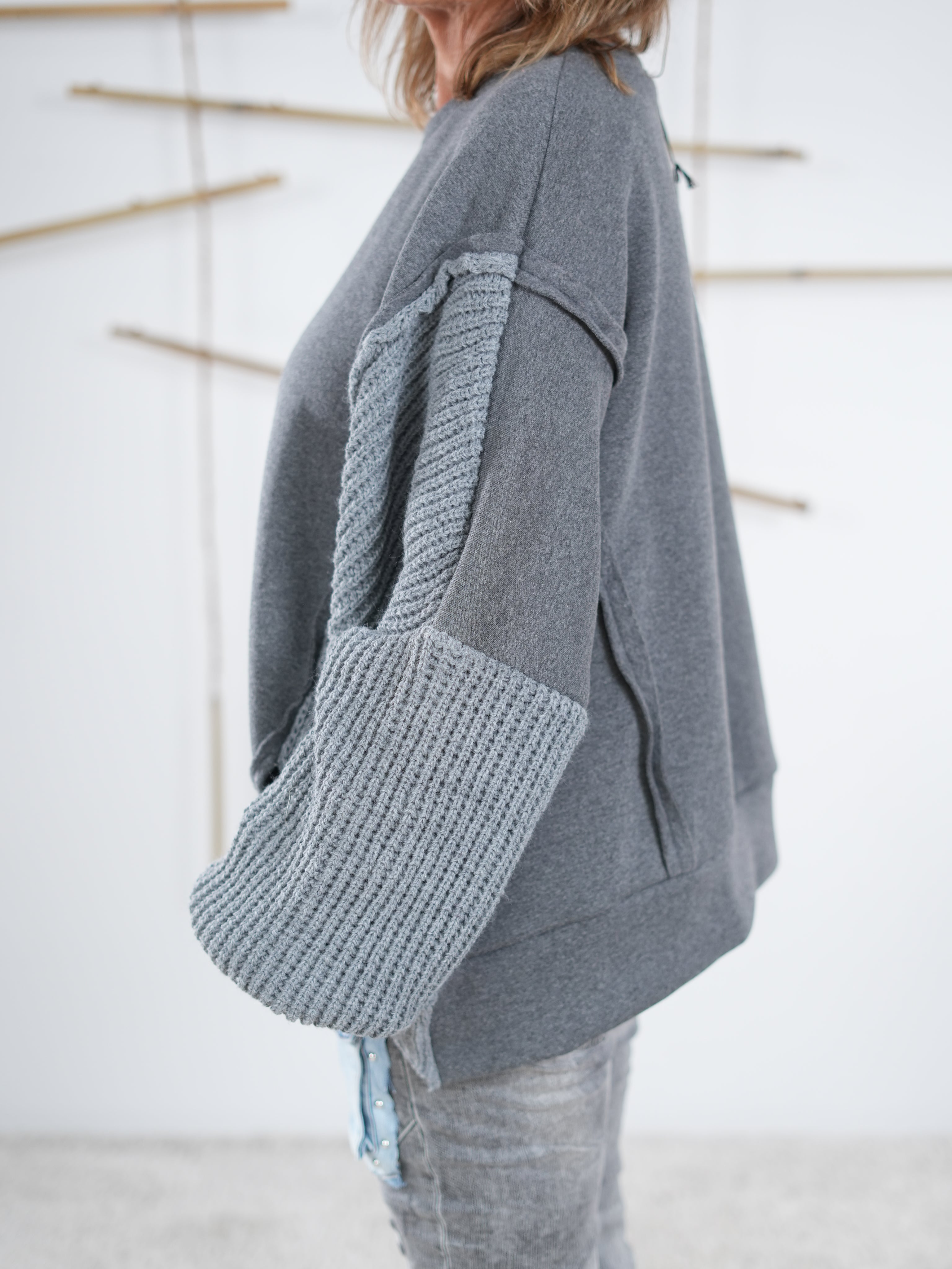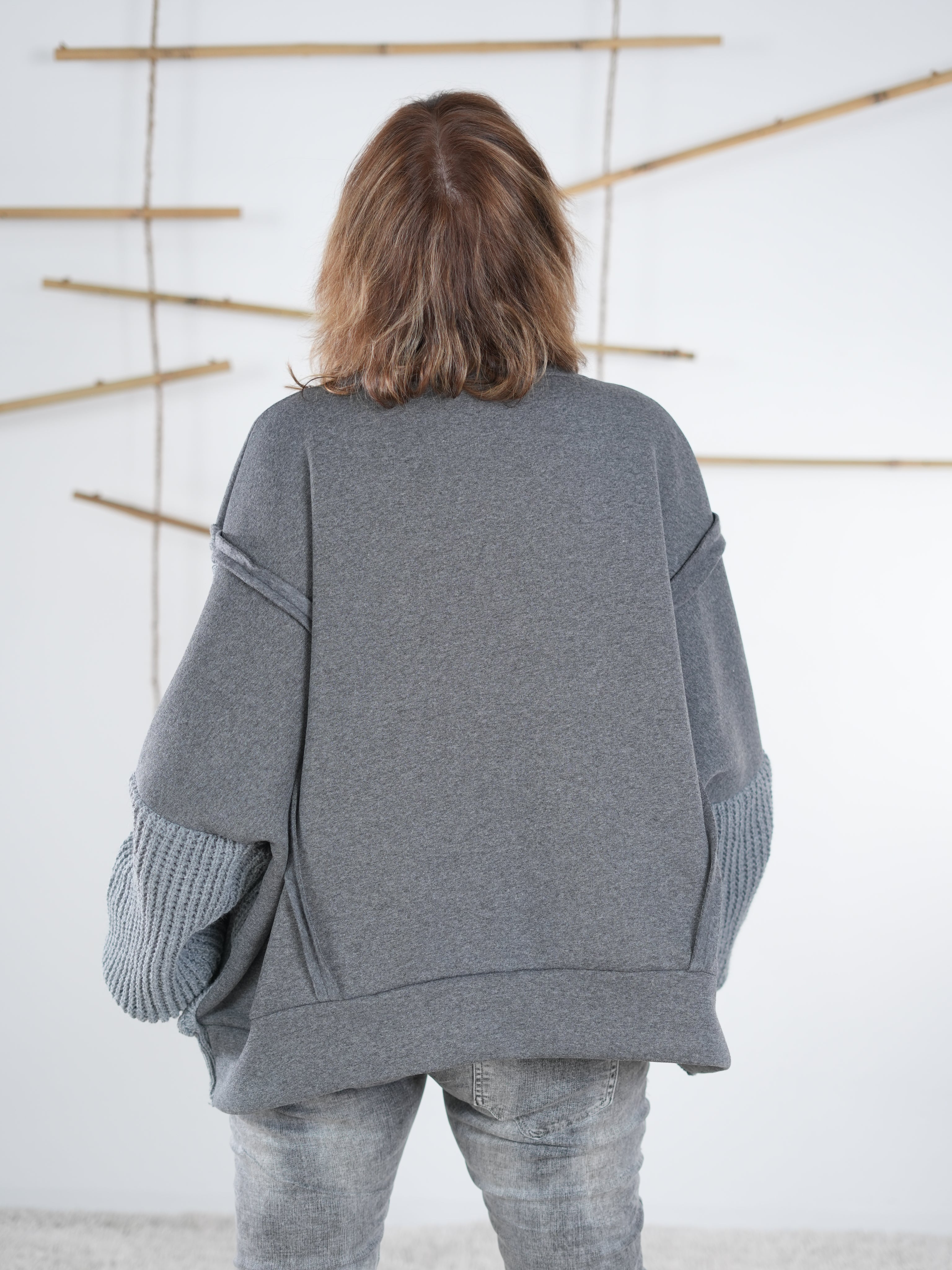 Er hat überschnittene Ärmel mit Strickeinsätzen, sichtbare Linksnähte und einen runden Halsausschnitt.