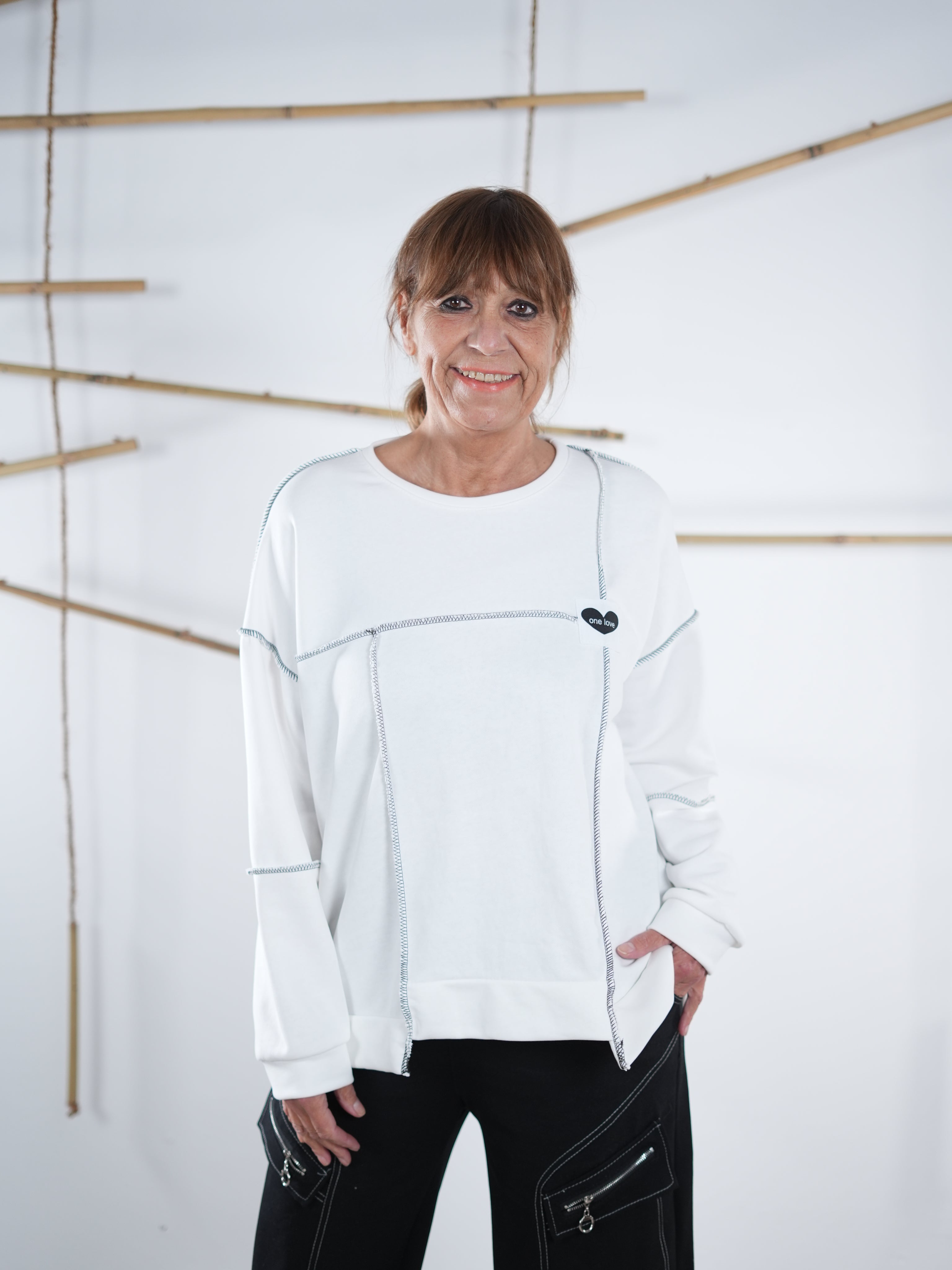 Marion ist 172cm groß und trägt Größe 40/42. Sie ist auf allen Produktbildern zu sehen und präsentiert die wunderschönen onesize Outfits.