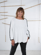 Marion ist 172cm groß und trägt Größe 40/42. Sie ist auf allen Produktbildern zu sehen und präsentiert die wunderschönen onesize Outfits.