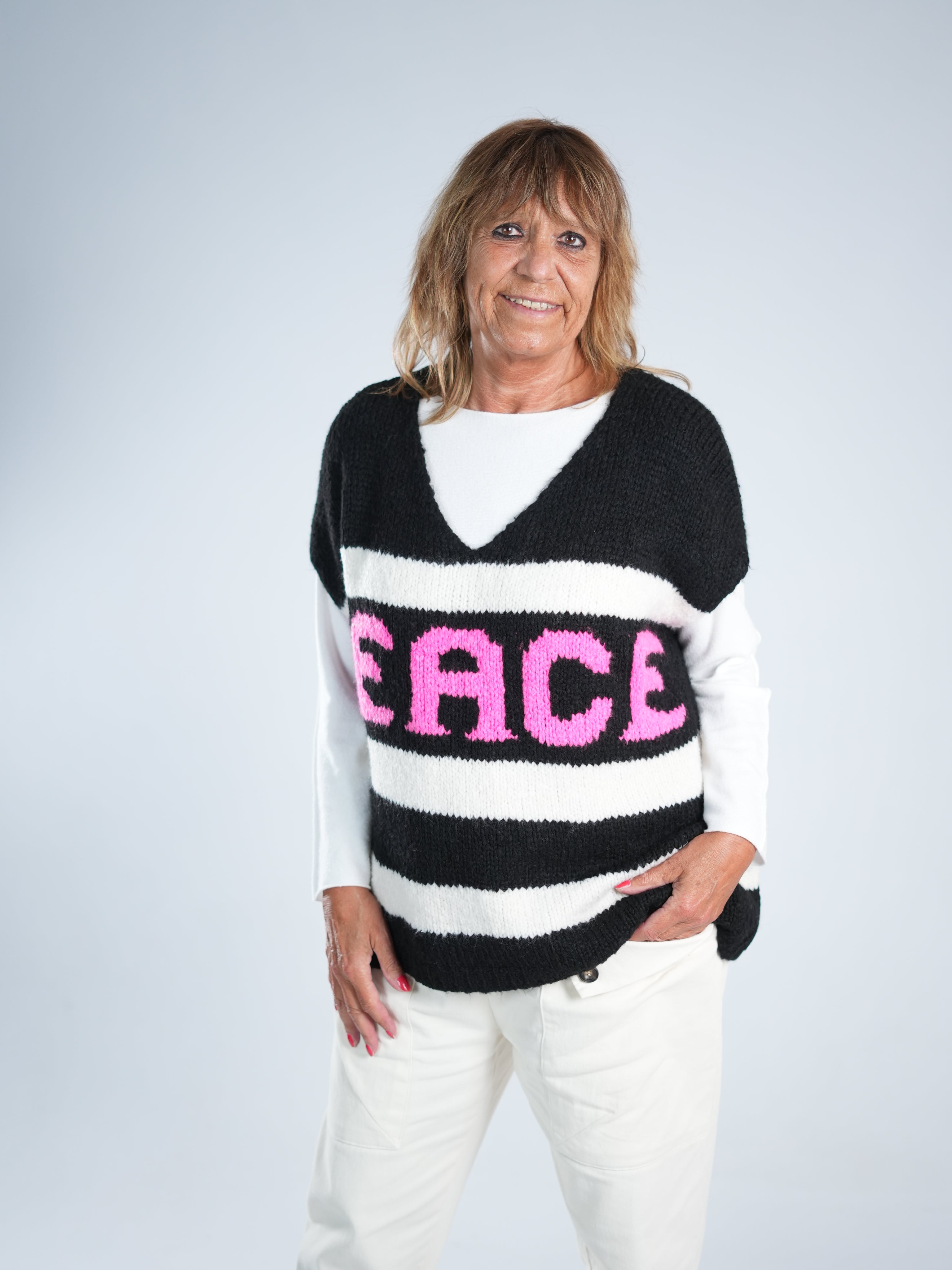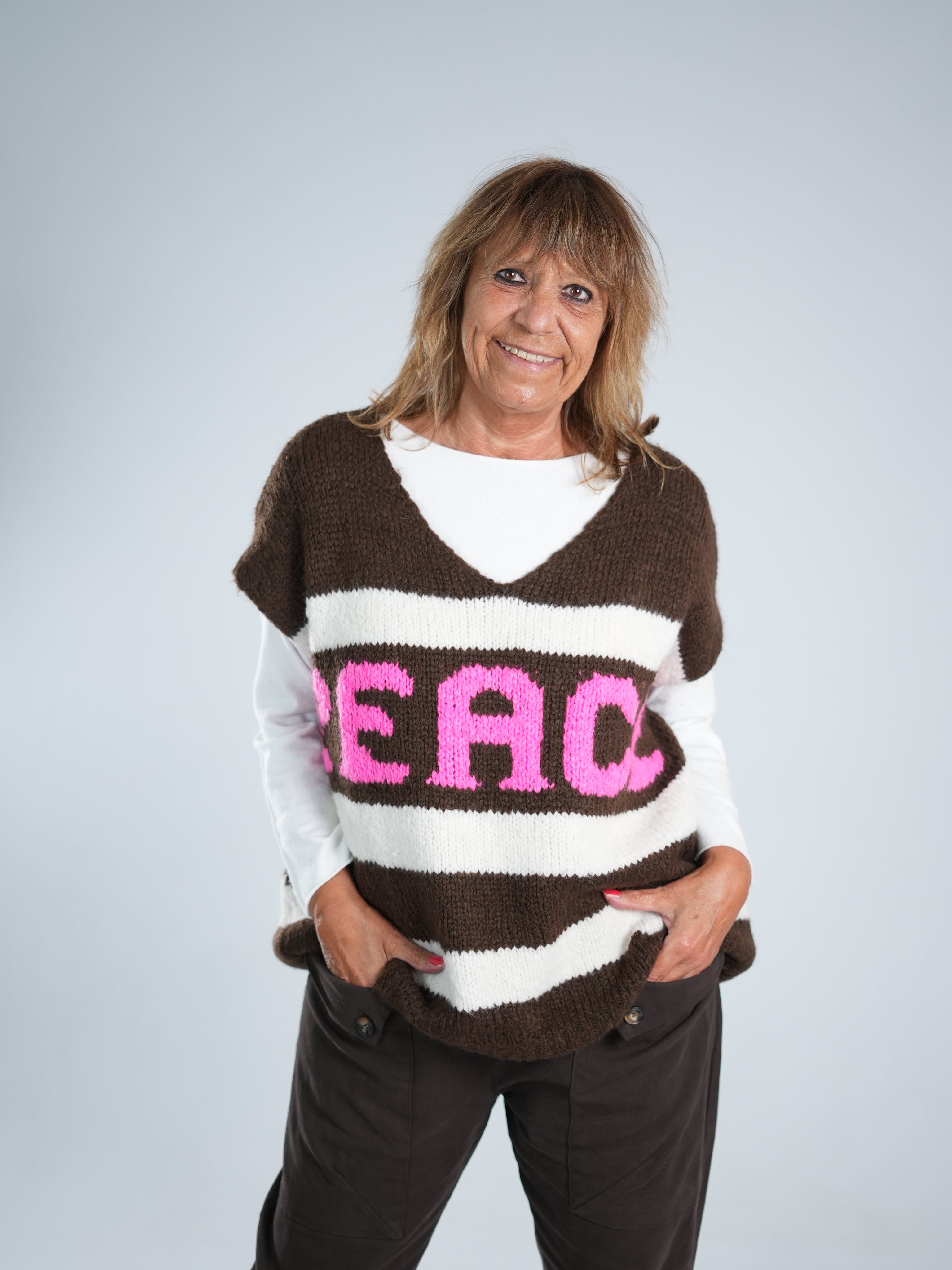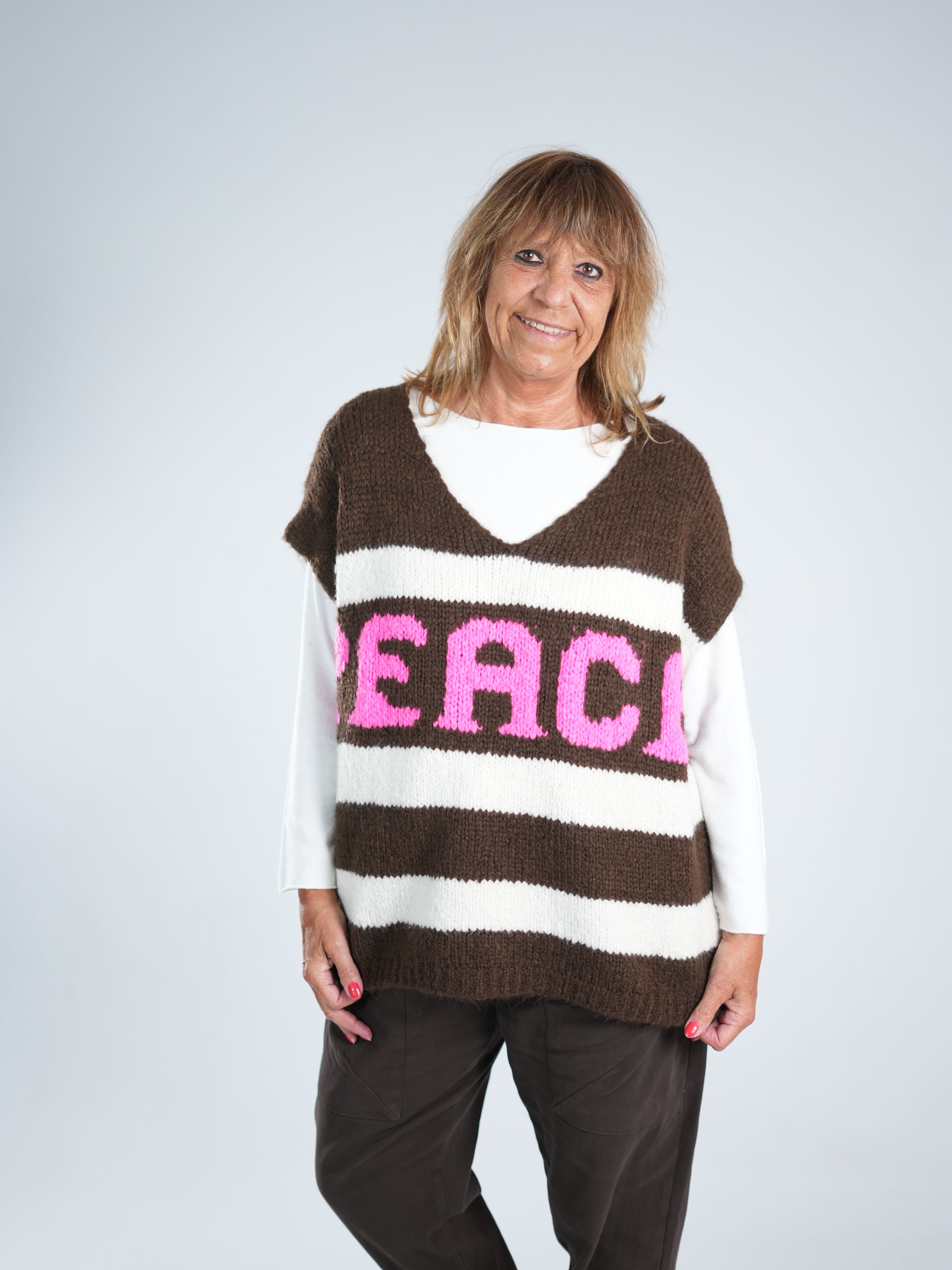 Dieser Pullunder begeistert mit seinem eingestrickten Schriftzug in Pink und bringt damit frische Farbe in dein Outfit. Der große V-Ausschnitt setzt einen schönen Akzent und lässt sich super mit Blusen oder Shirts kombinieren. Gerade geschnitten, trägt er sich lässig und unkompliziert – perfekt für stylische Layering-Looks.