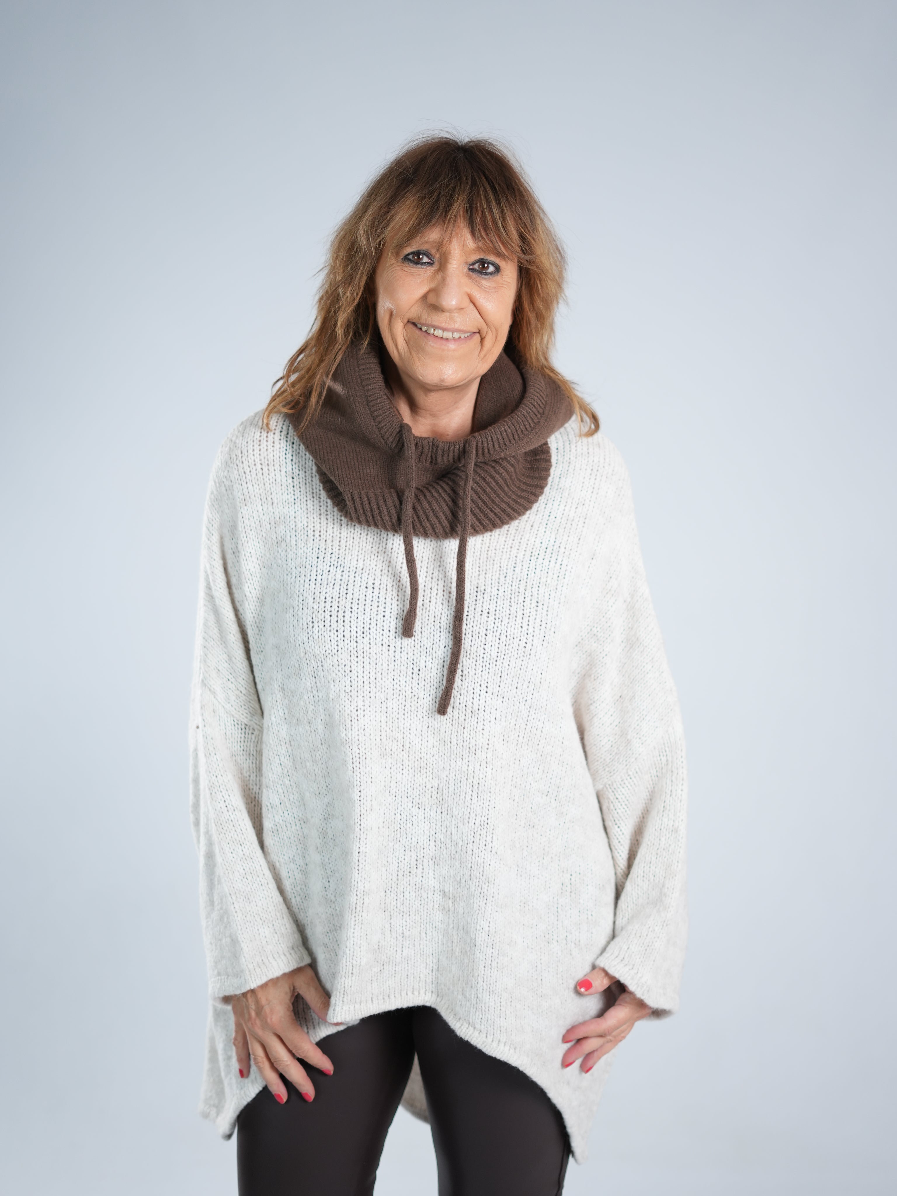 Marion ist 172cm groß und trägt Größe 40/42. Sie ist auf allen Produktbildern zu sehen und präsentiert die wunderschönen onesize Outfits.