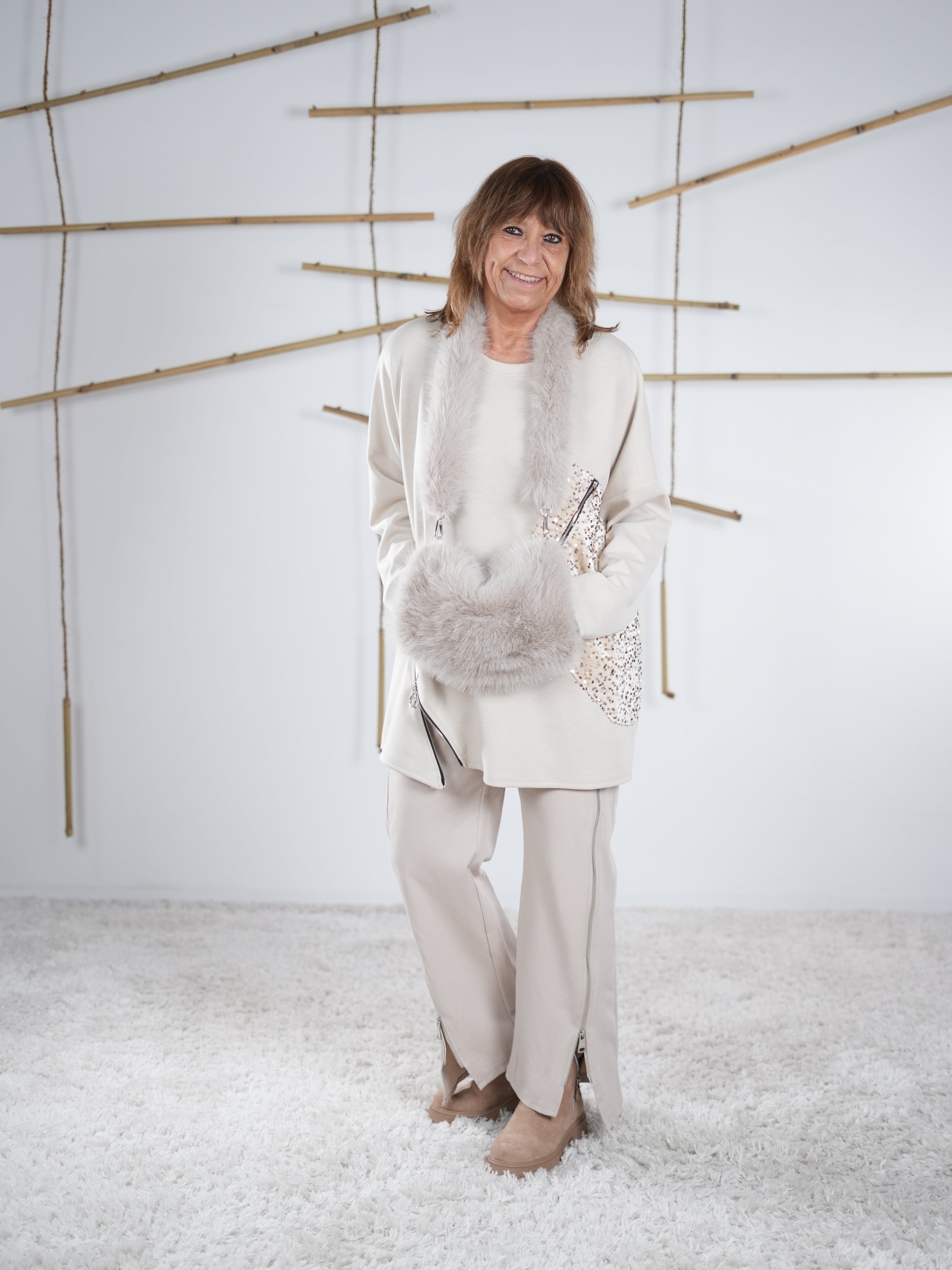 Hier findest du Taschen, die gerade besonders gefragt sind: moderne Crossbags, kleine Alltagstaschen und kuschelige Felltaschen, die sofort ein Highlight setzen. Auch Muffs – die stylische Kombination aus Handwärmer und Accessoire – liegen voll im Trend und ergänzen viele Looks perfekt. Alle Modelle lassen sich leicht tragen und passen zu unseren aktuellen Kollektionen.
