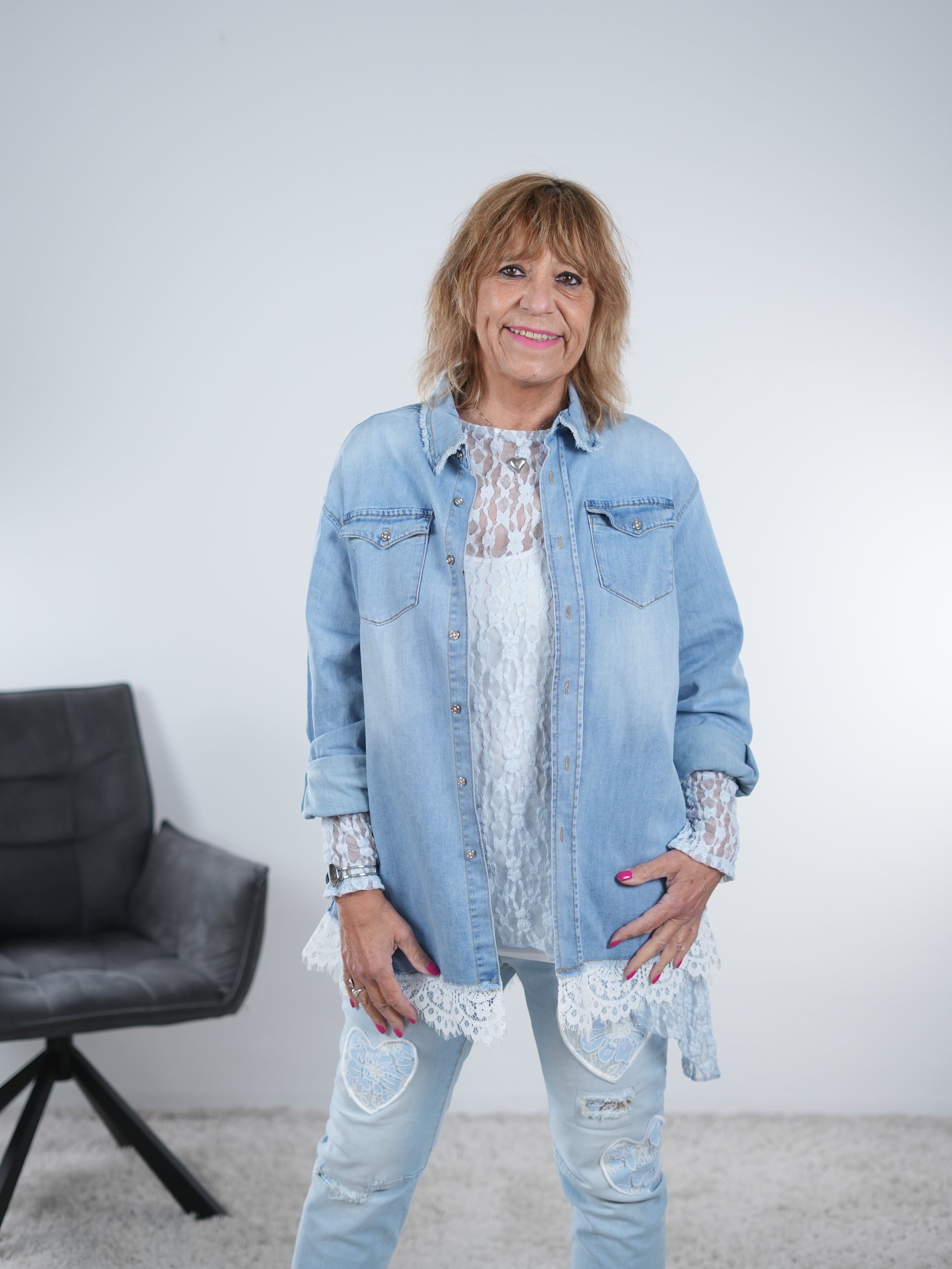 Marion ist 172cm groß und trägt Größe 40/42. Sie ist auf allen Produktbildern zu sehen und präsentiert die wunderschönen onesize Outfits.