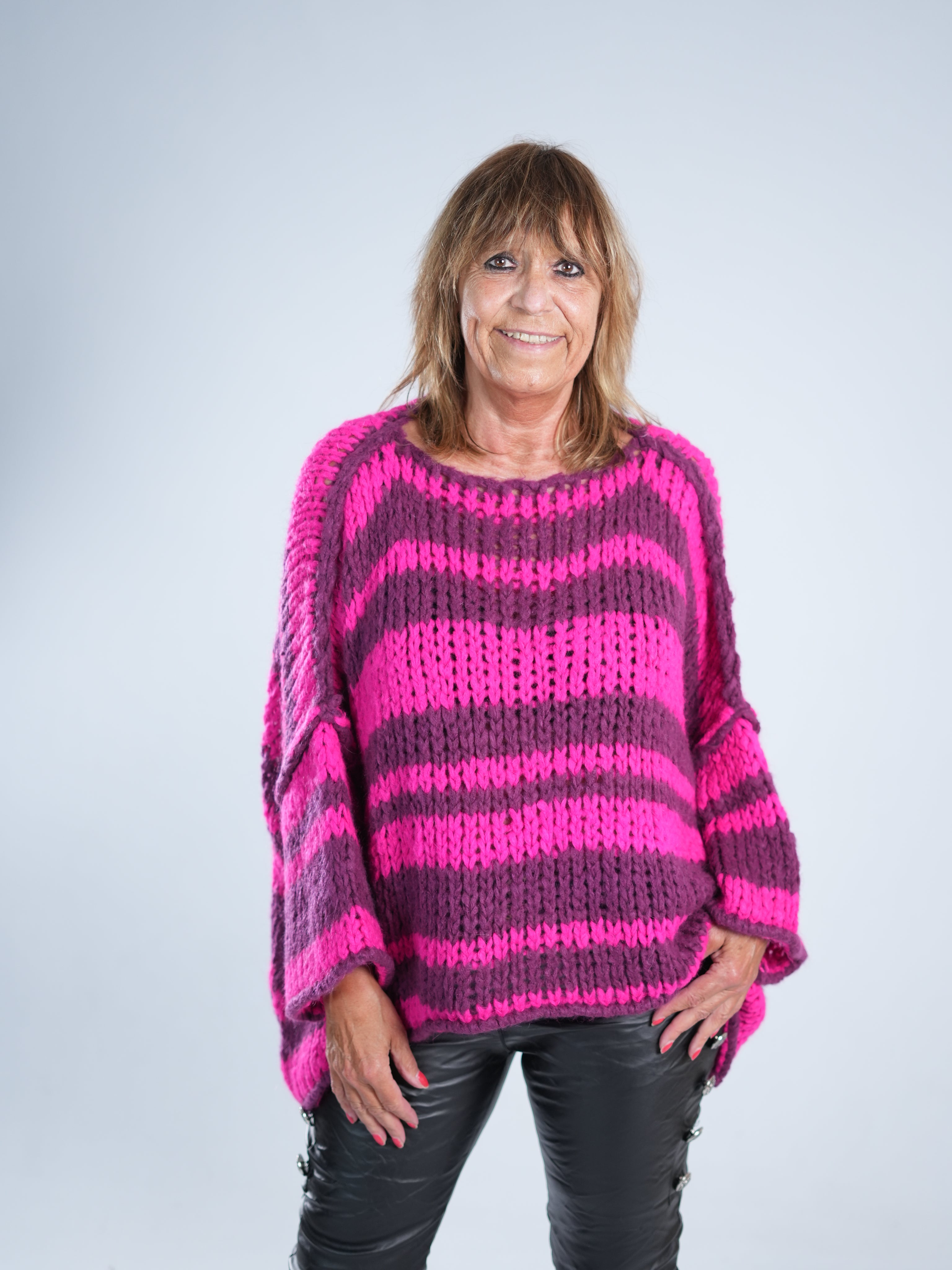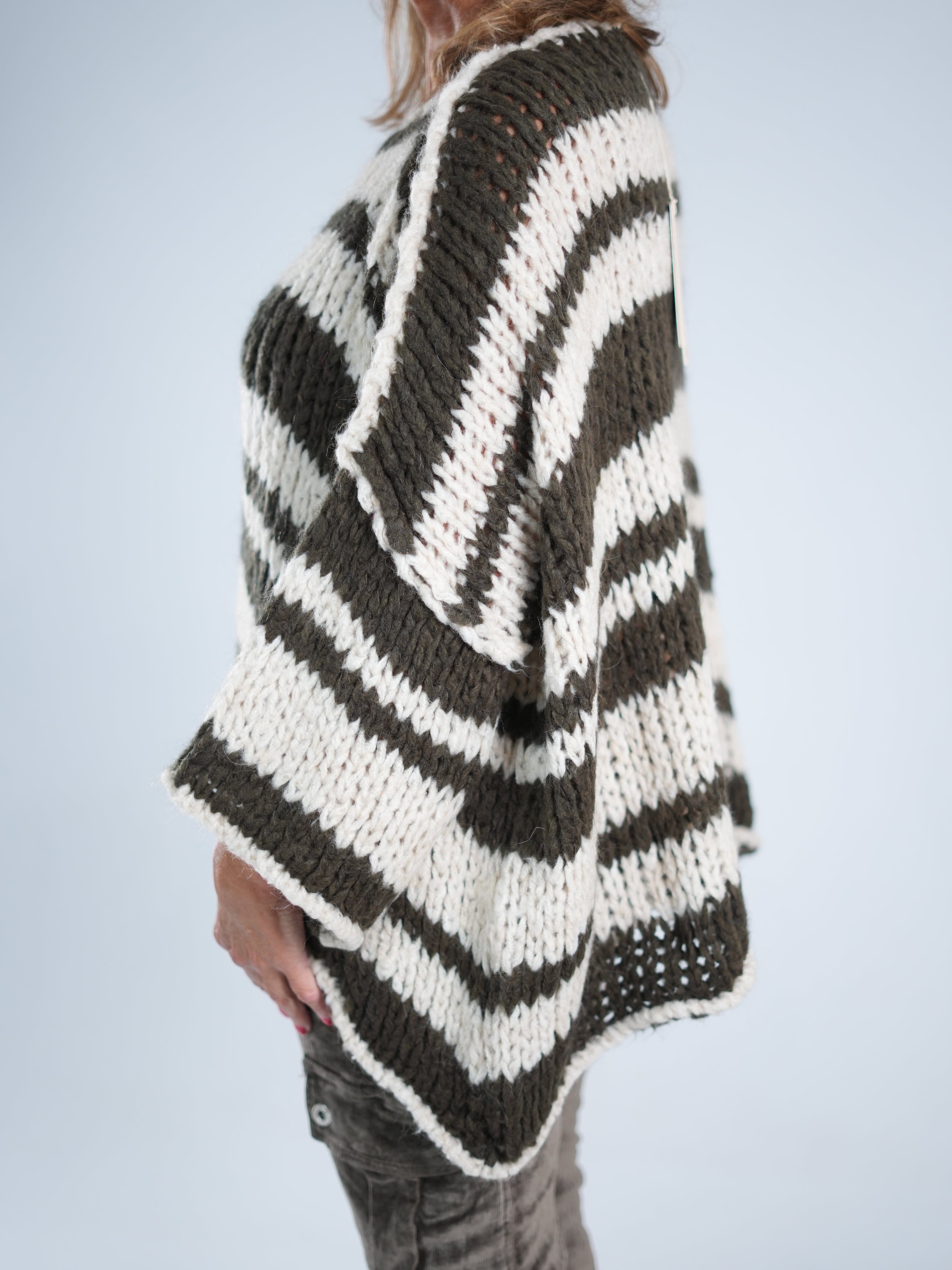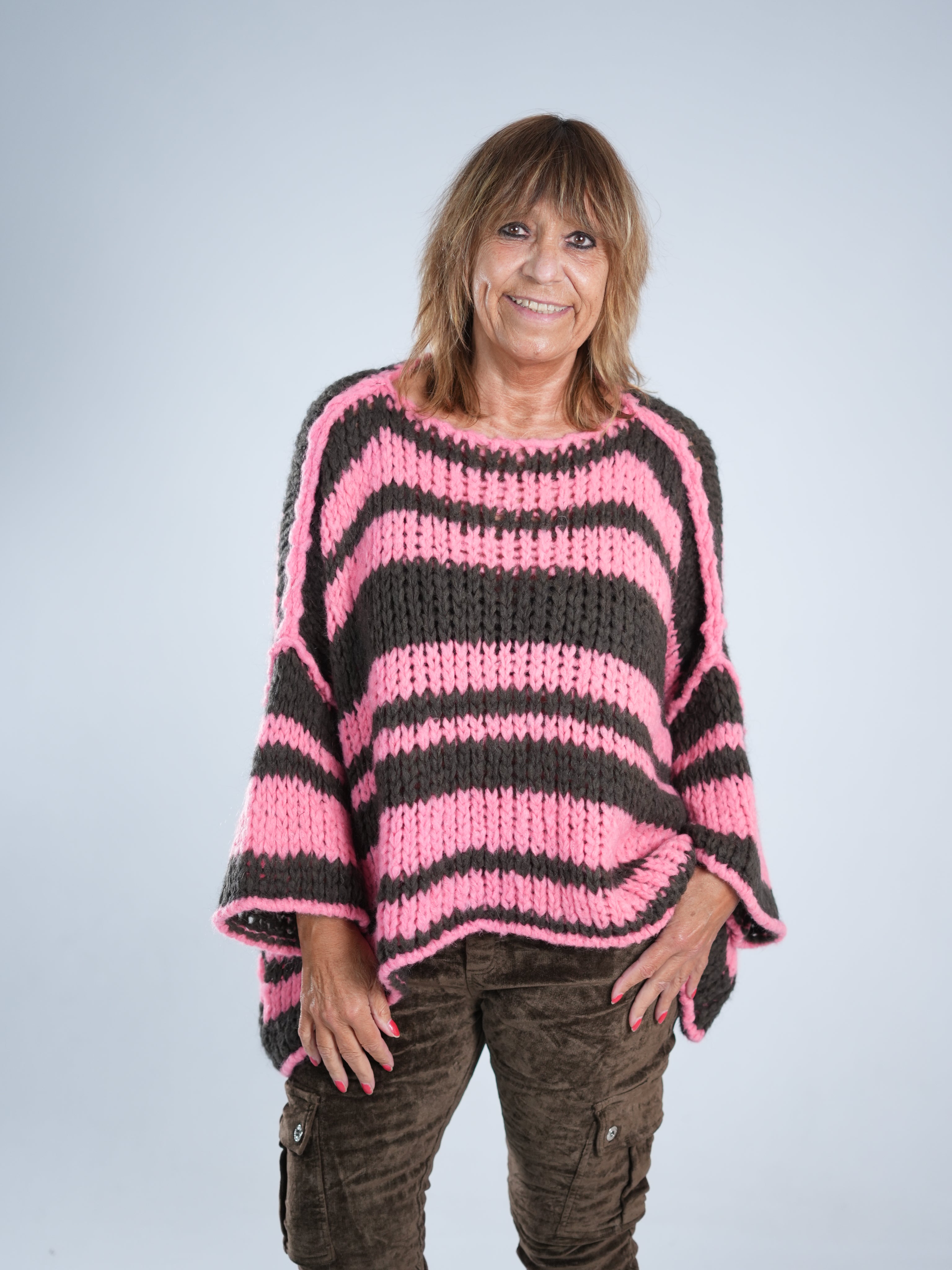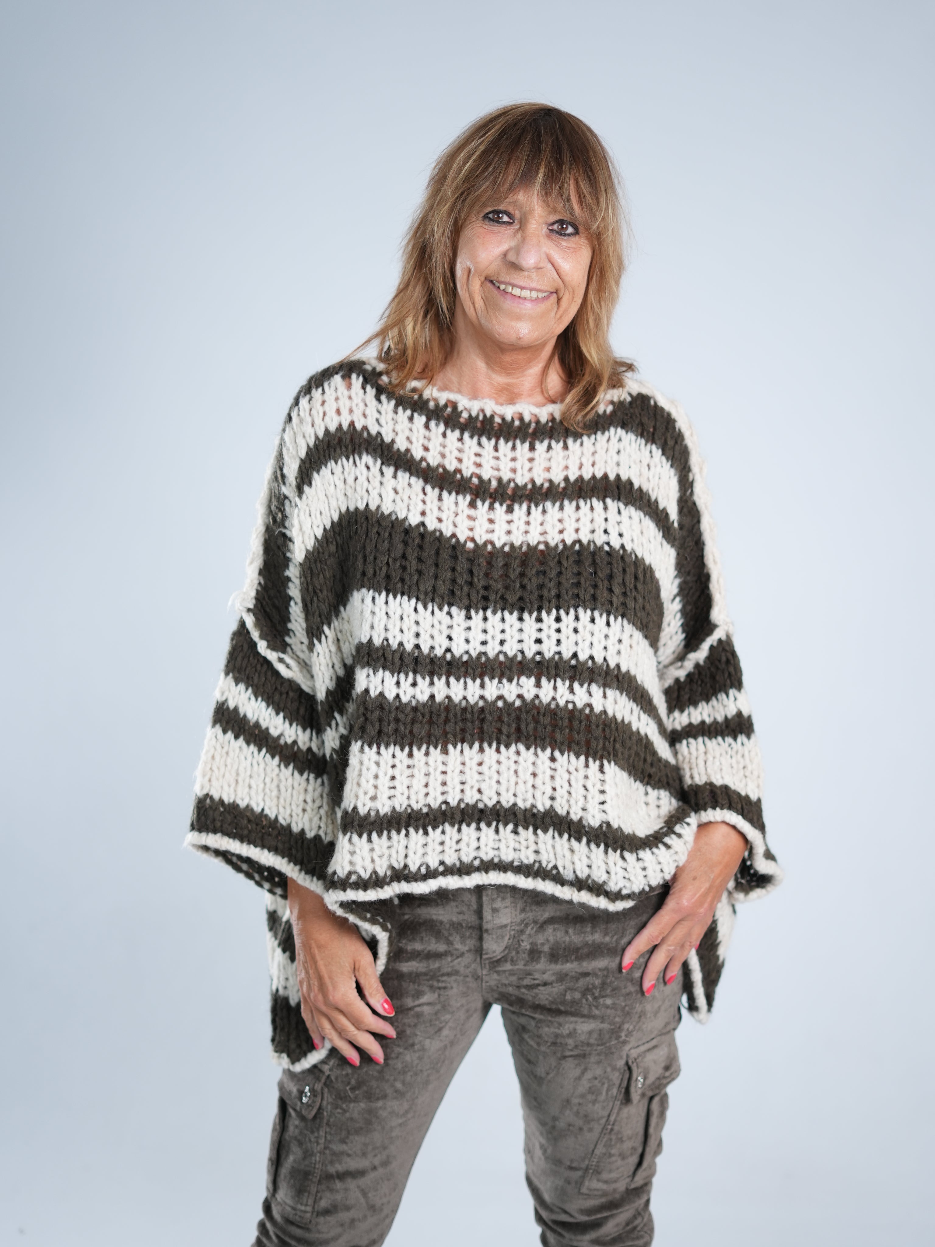 Ein locker gestrickter Grobstrickpulli in tollen Streifenfarben – superweit geschnitten und vom Look her fast wie ein Poncho. Mit U-Boot-Ausschnitt und etwas kürzeren Ärmeln sitzt er entspannt und bequem.