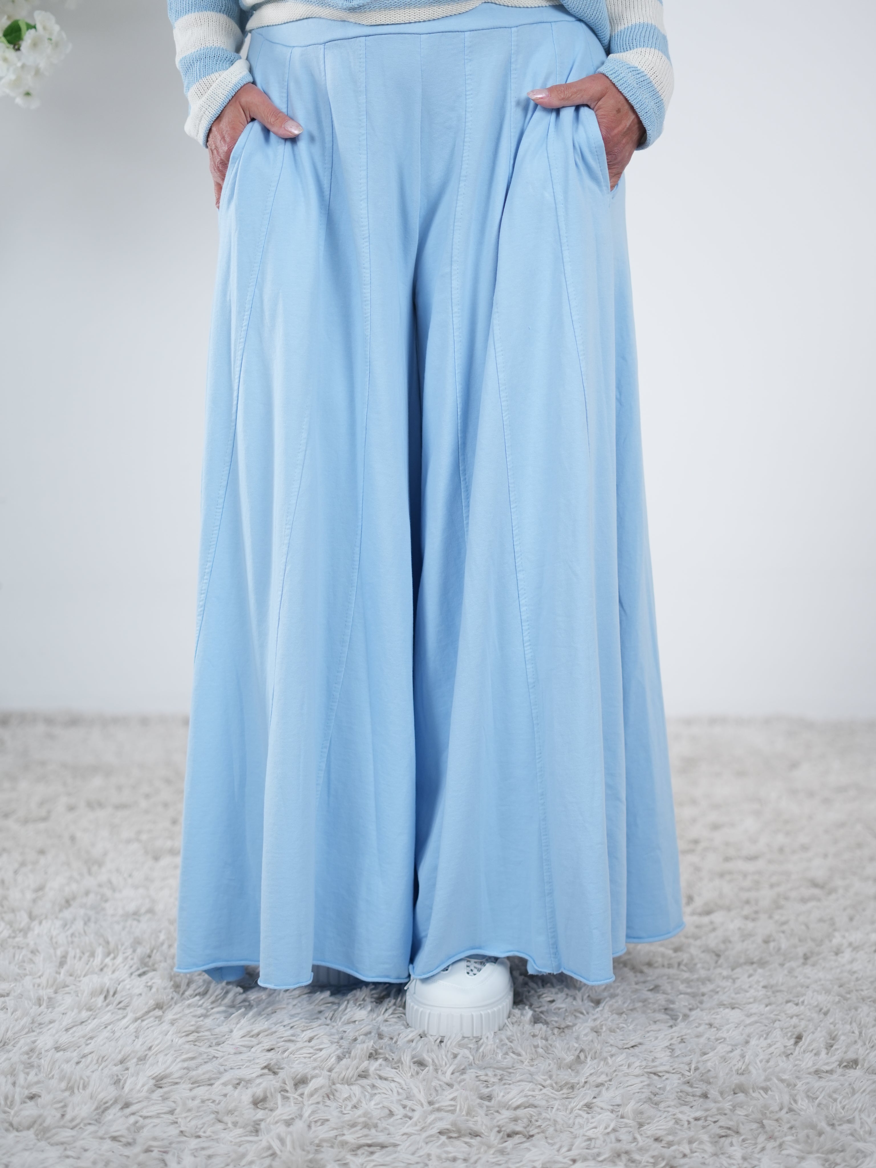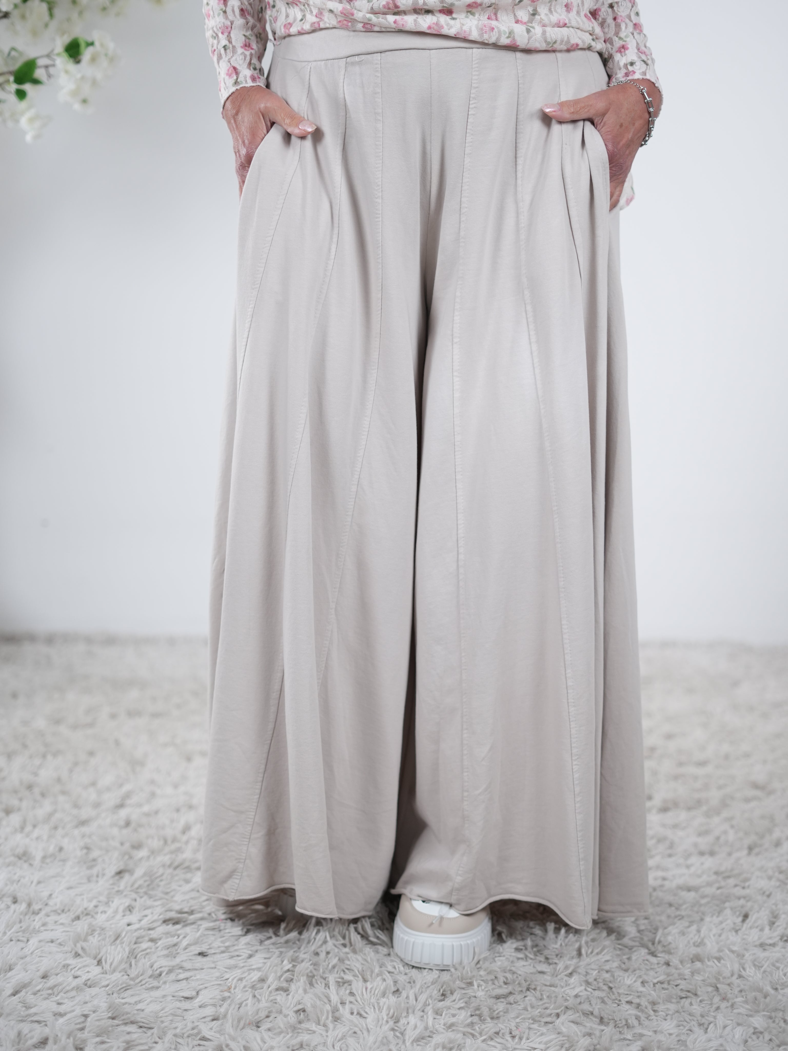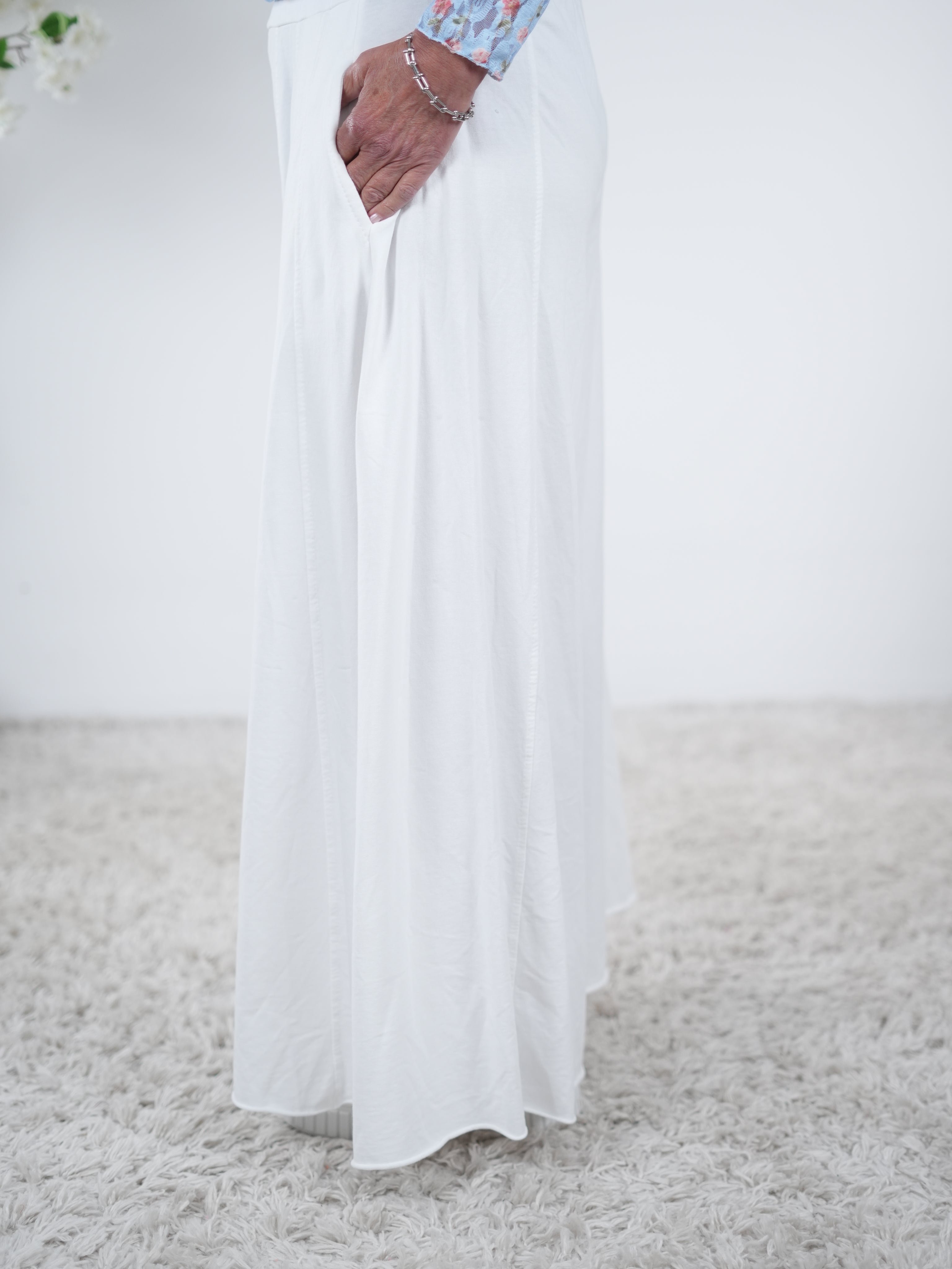 Marion ist 172cm groß und trägt Größe 40/42. Sie ist auf allen Produktbildern zu sehen und präsentiert die wunderschönen onesize Outfits.