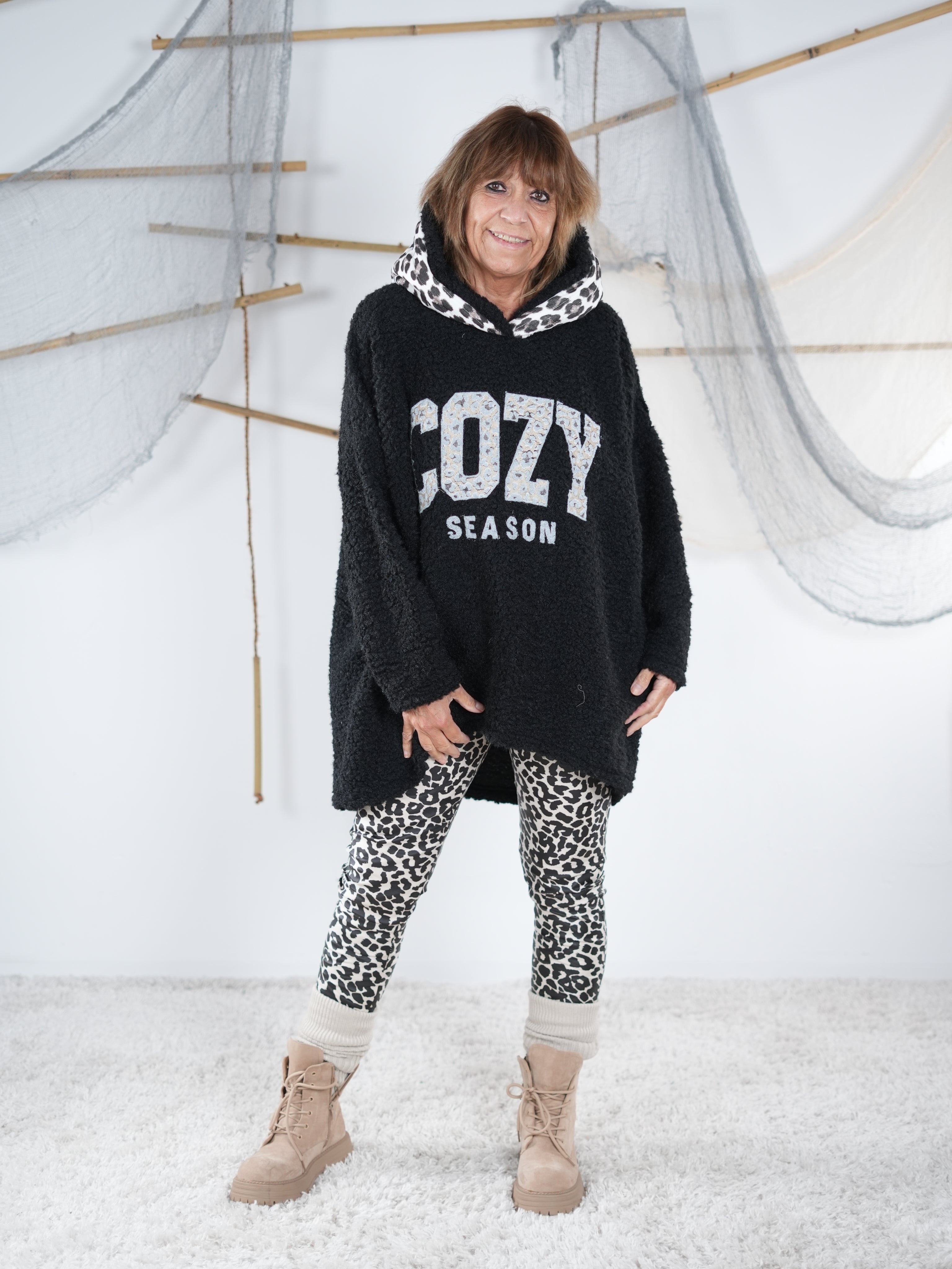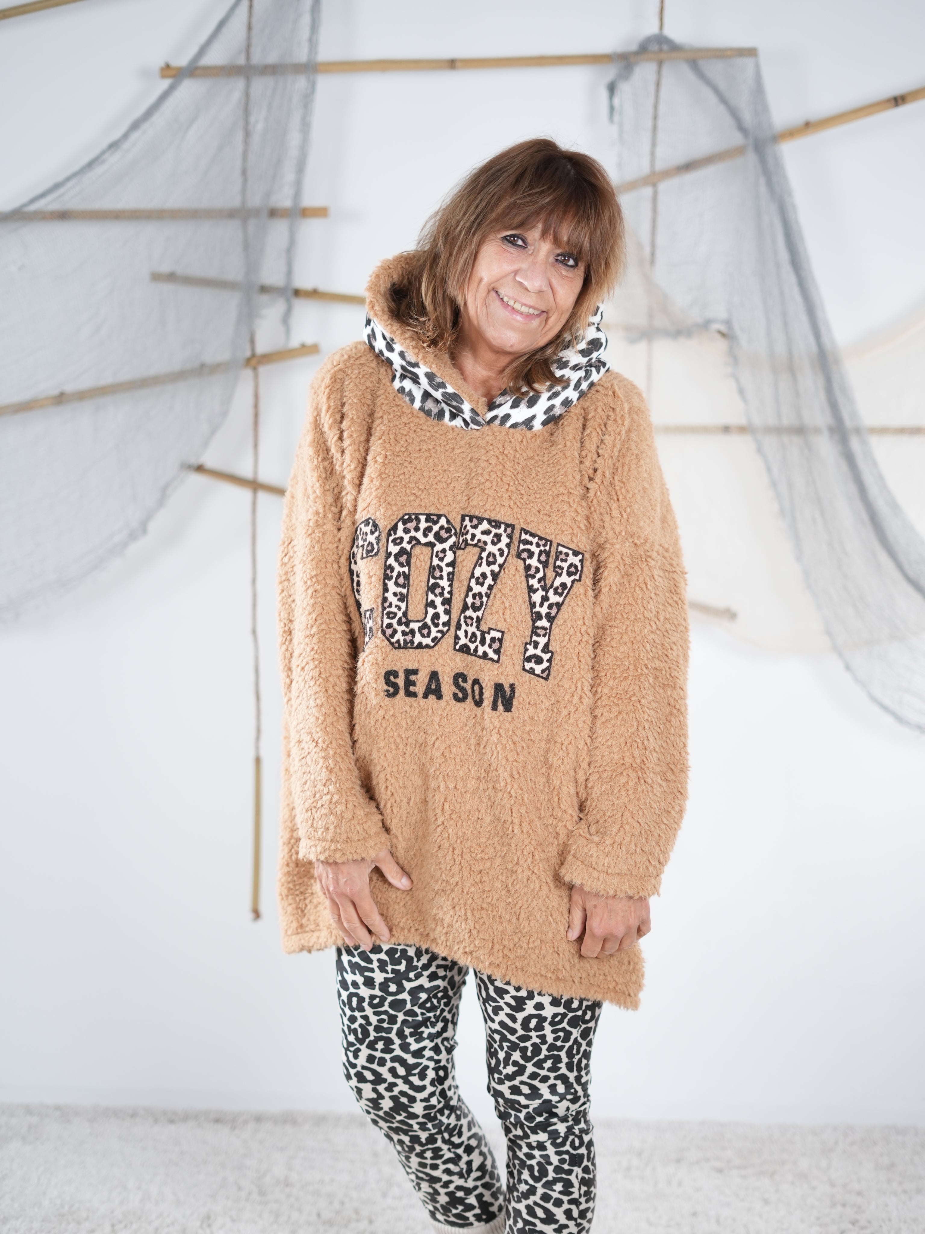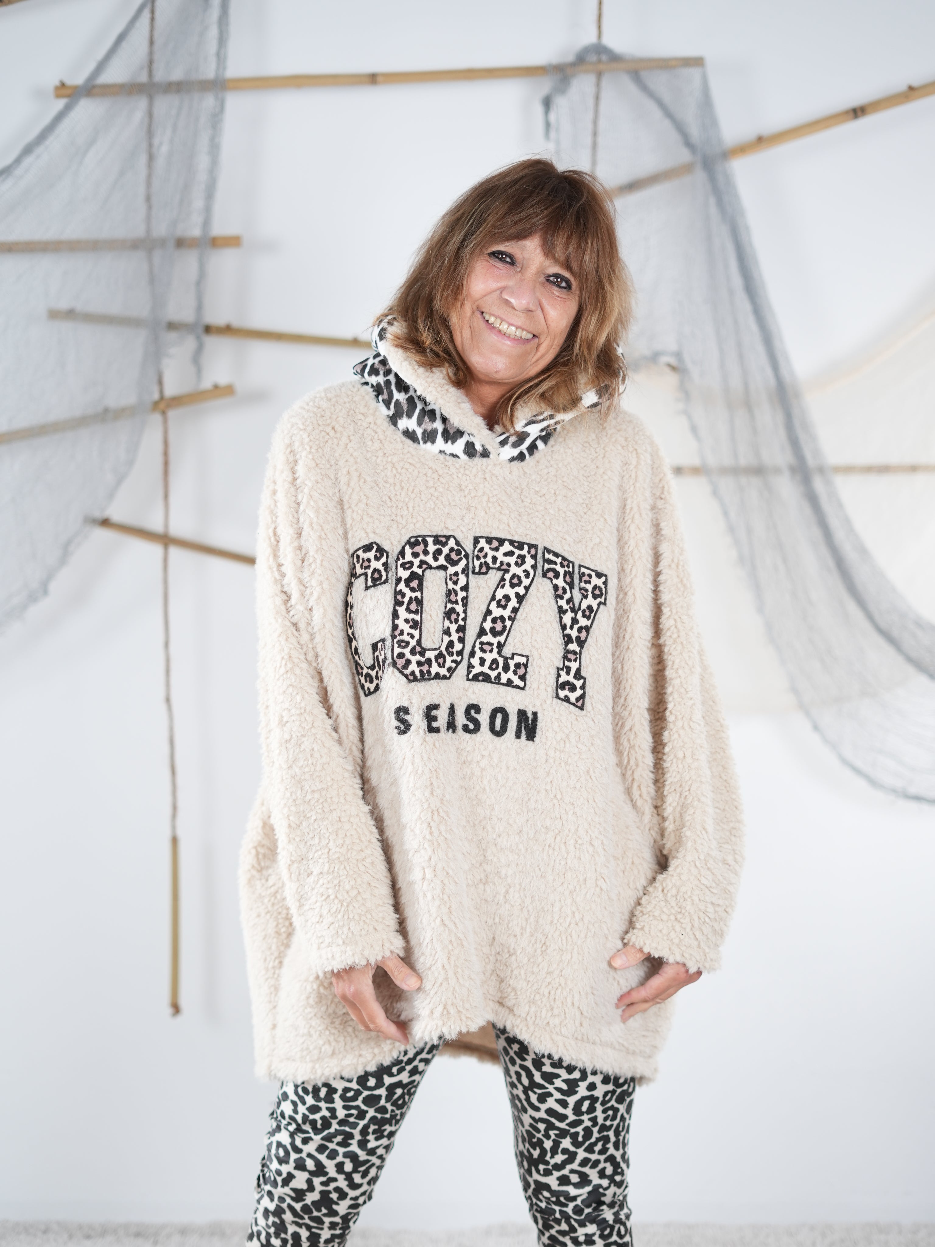 Marion ist 172cm groß und trägt Größe 40/42. Sie ist auf allen Produktbildern zu sehen und präsentiert die wunderschönen onesize Outfits.