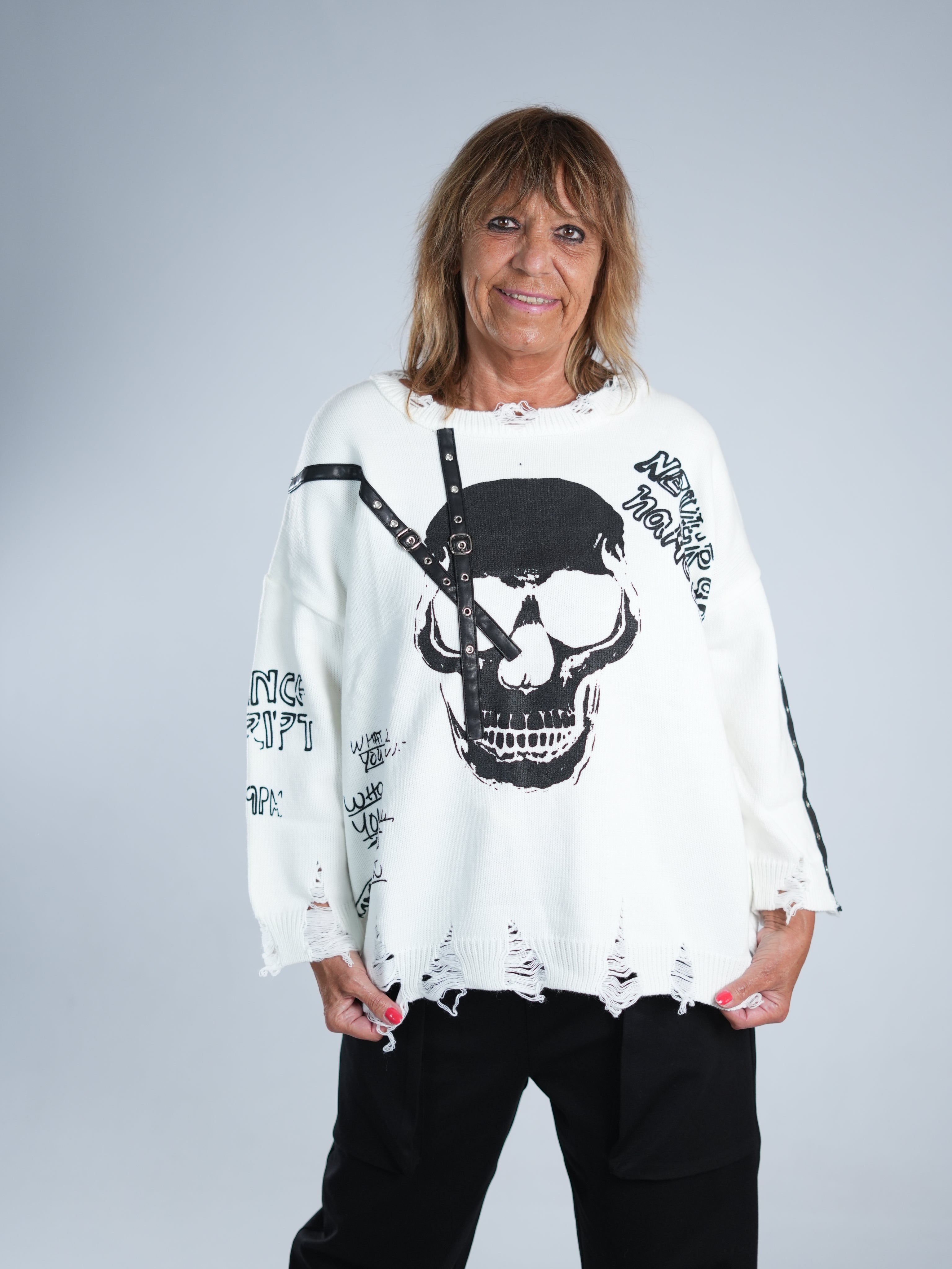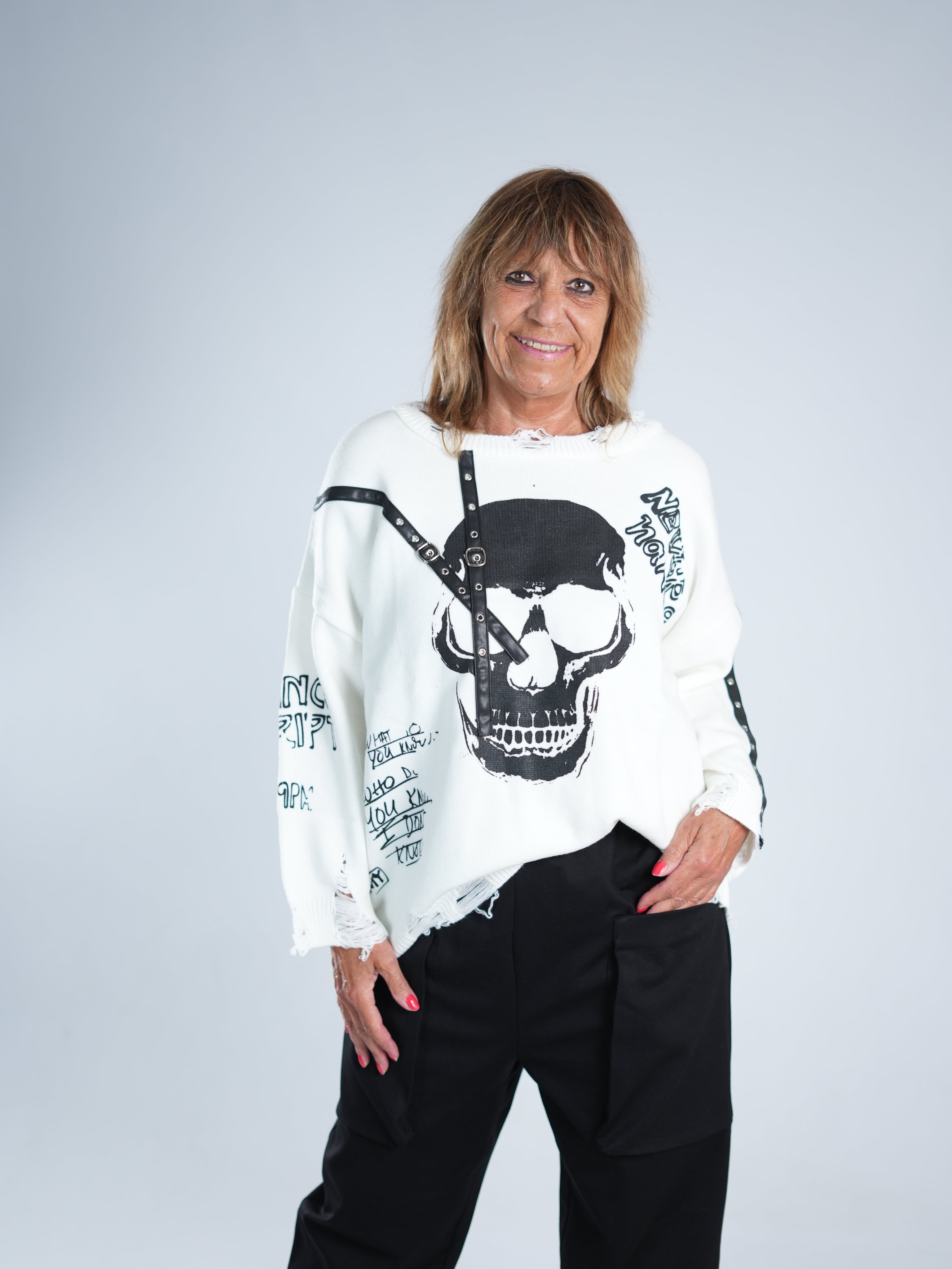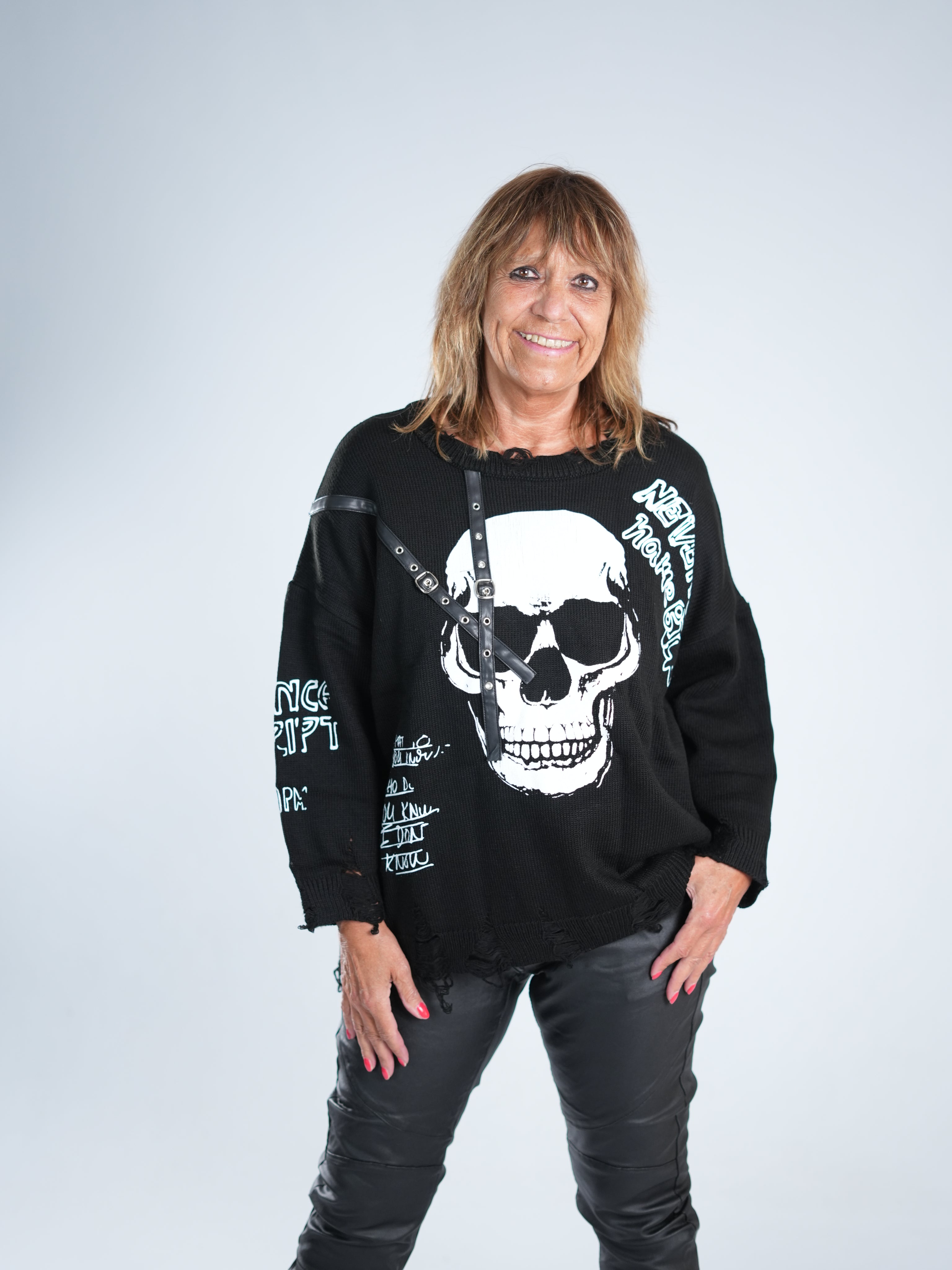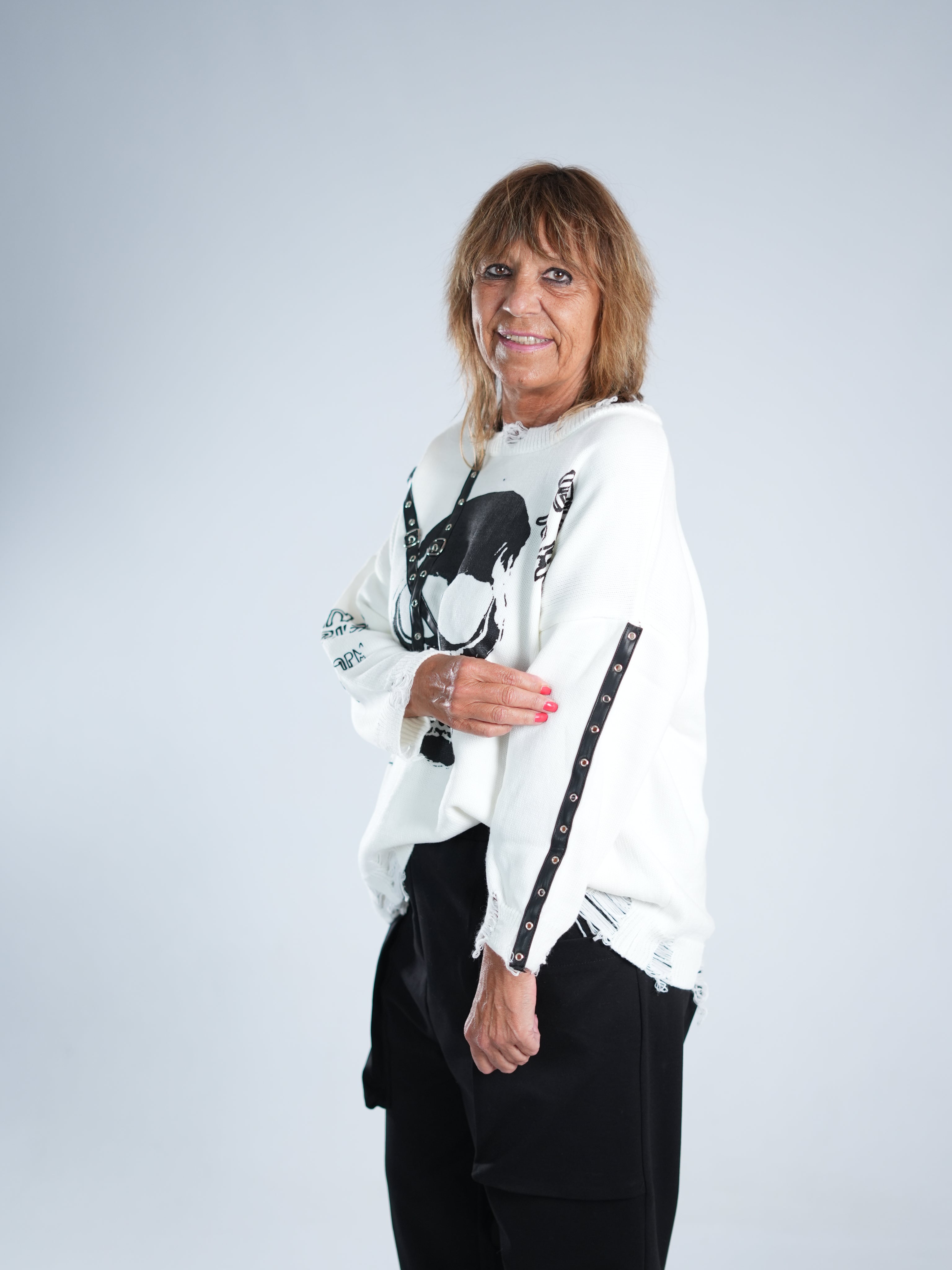 Marion ist 172cm groß und trägt Größe 40/42. Sie ist auf allen Produktbildern zu sehen und präsentiert die wunderschönen onesize Outfits.