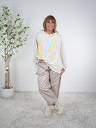 Marion ist 172cm groß und trägt Größe 40/42. Sie ist auf allen Produktbildern zu sehen und präsentiert die wunderschönen onesize Outfits.