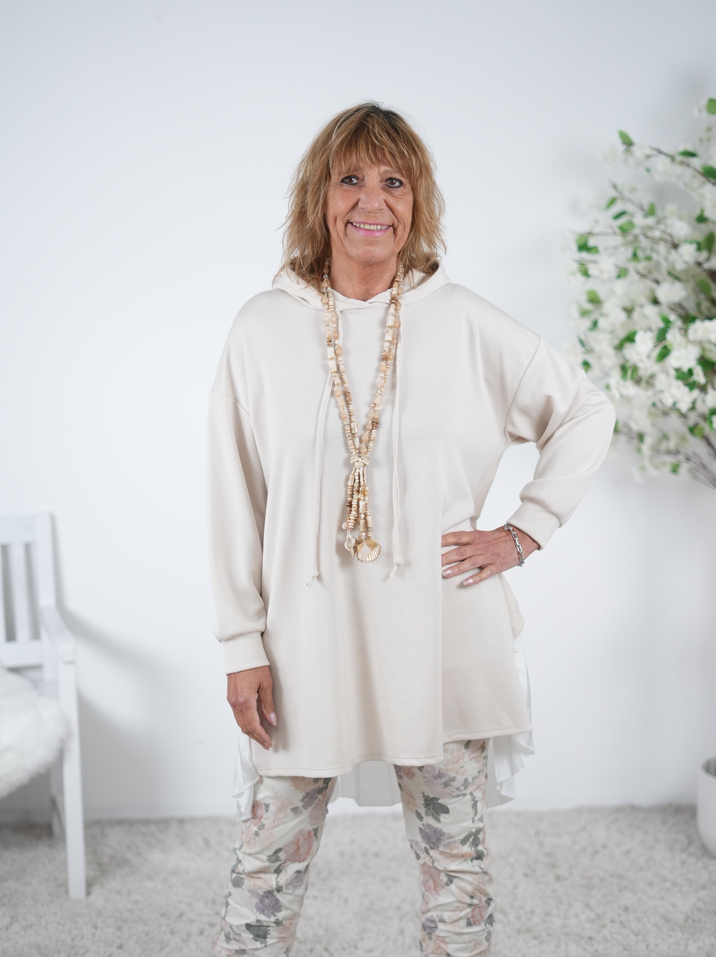 Marion ist 172cm groß und trägt Größe 40/42. Sie ist auf allen Produktbildern zu sehen und präsentiert die wunderschönen onesize Outfits.